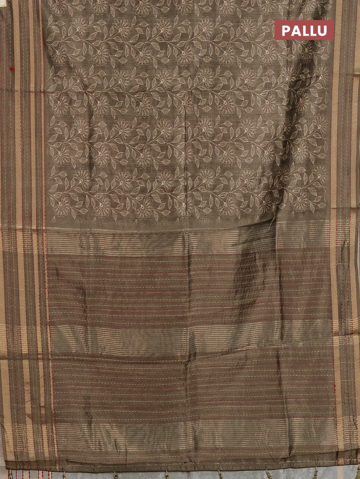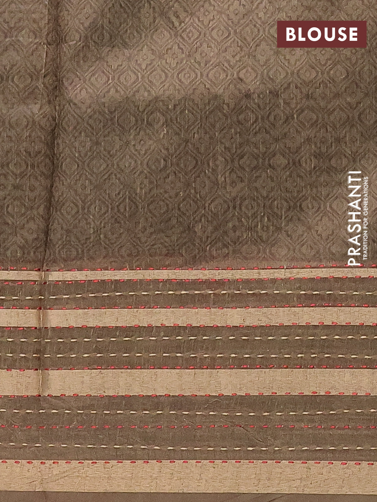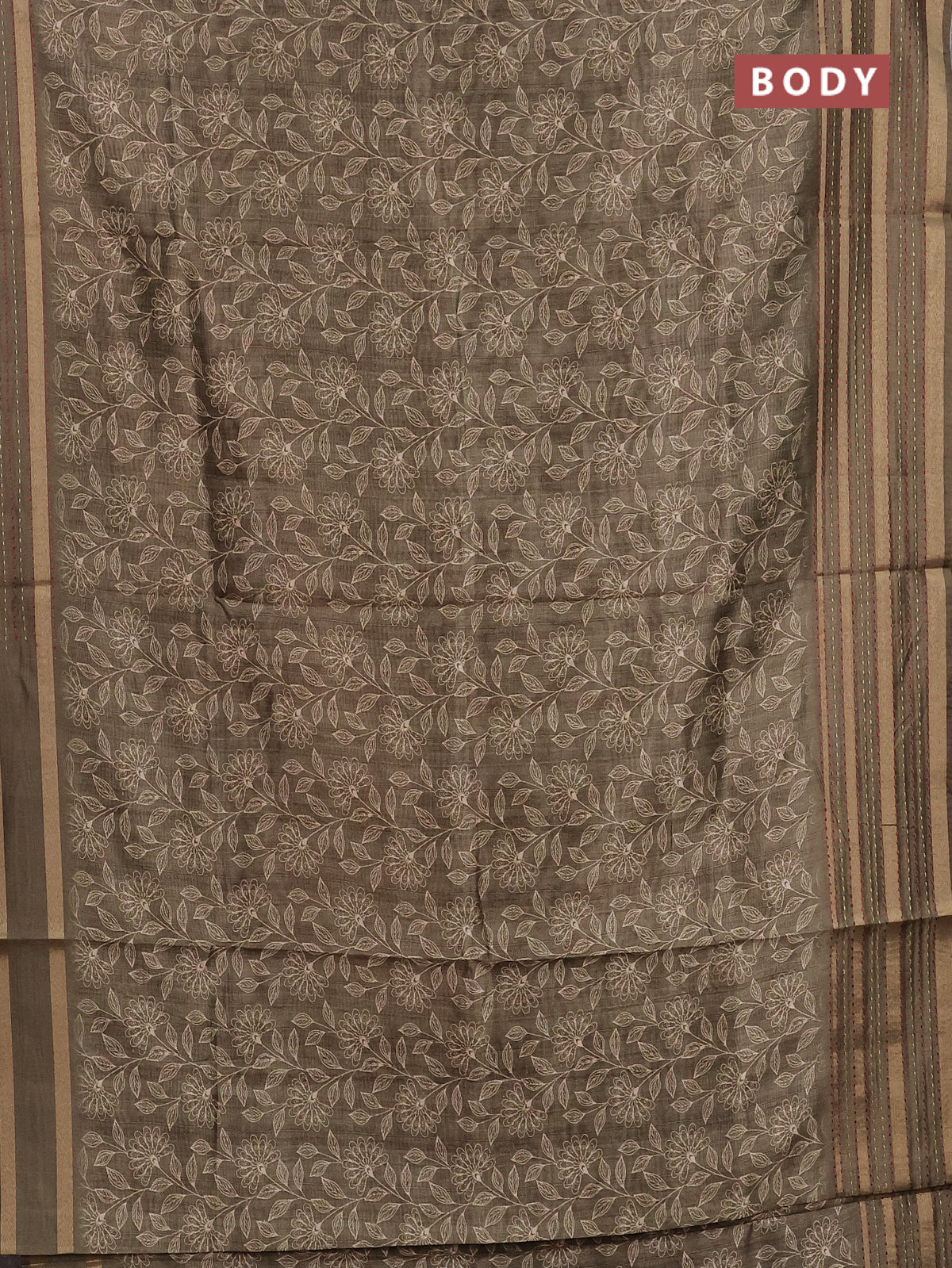 Semi tussar saree olive green with allover prints and kantha stitch work border
