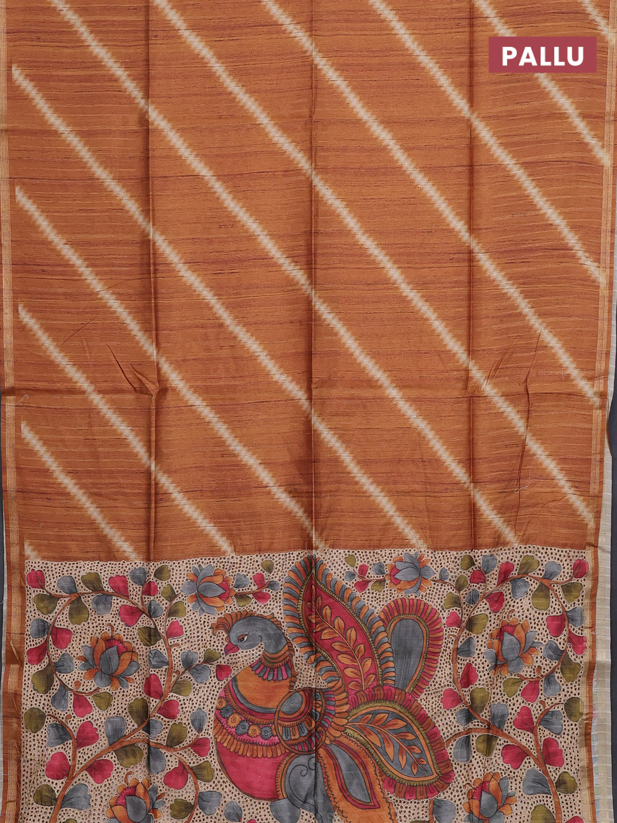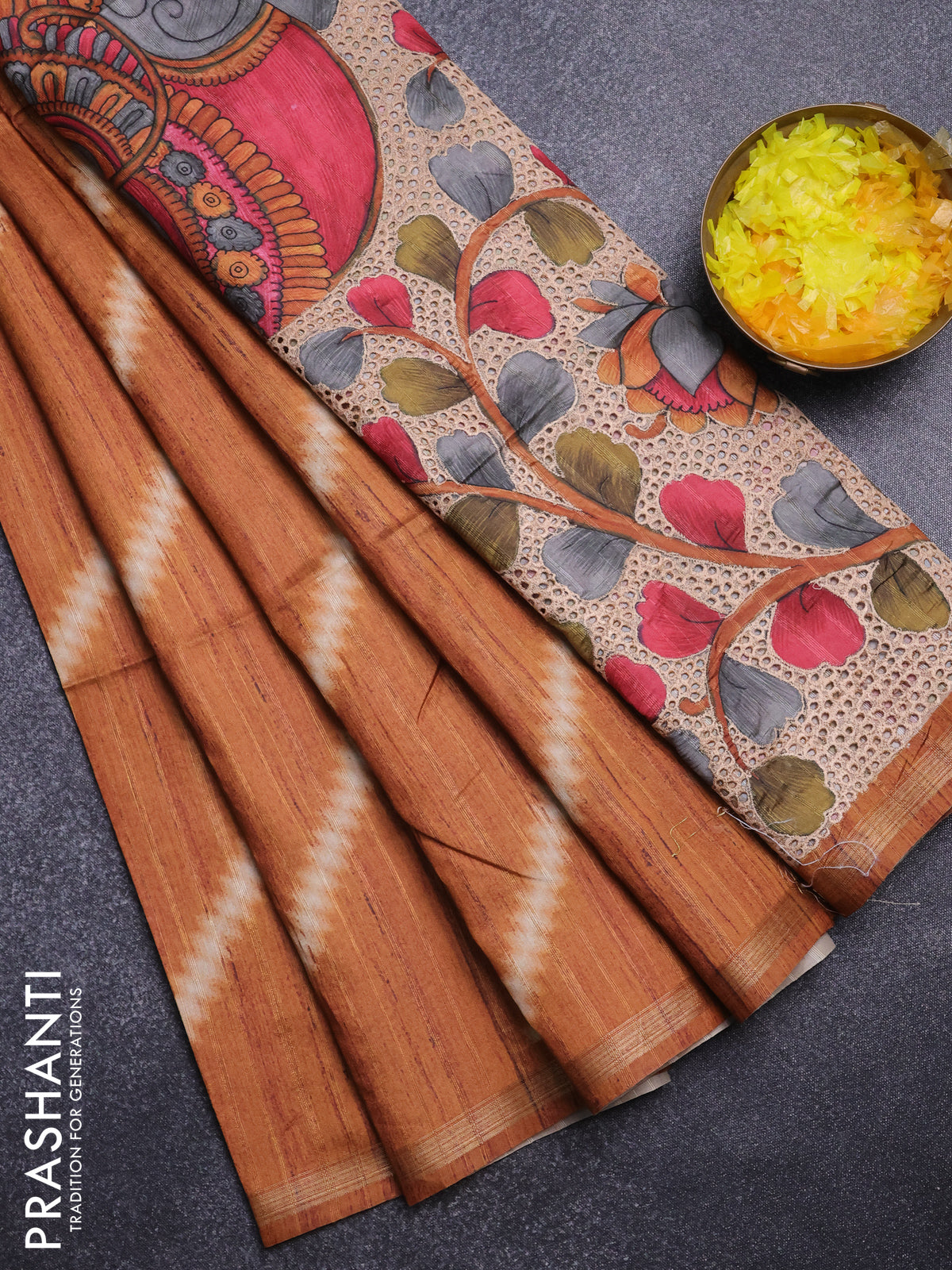 Semi tussar saree orange with leheriya prints and kalamkari prints & cut work pallu