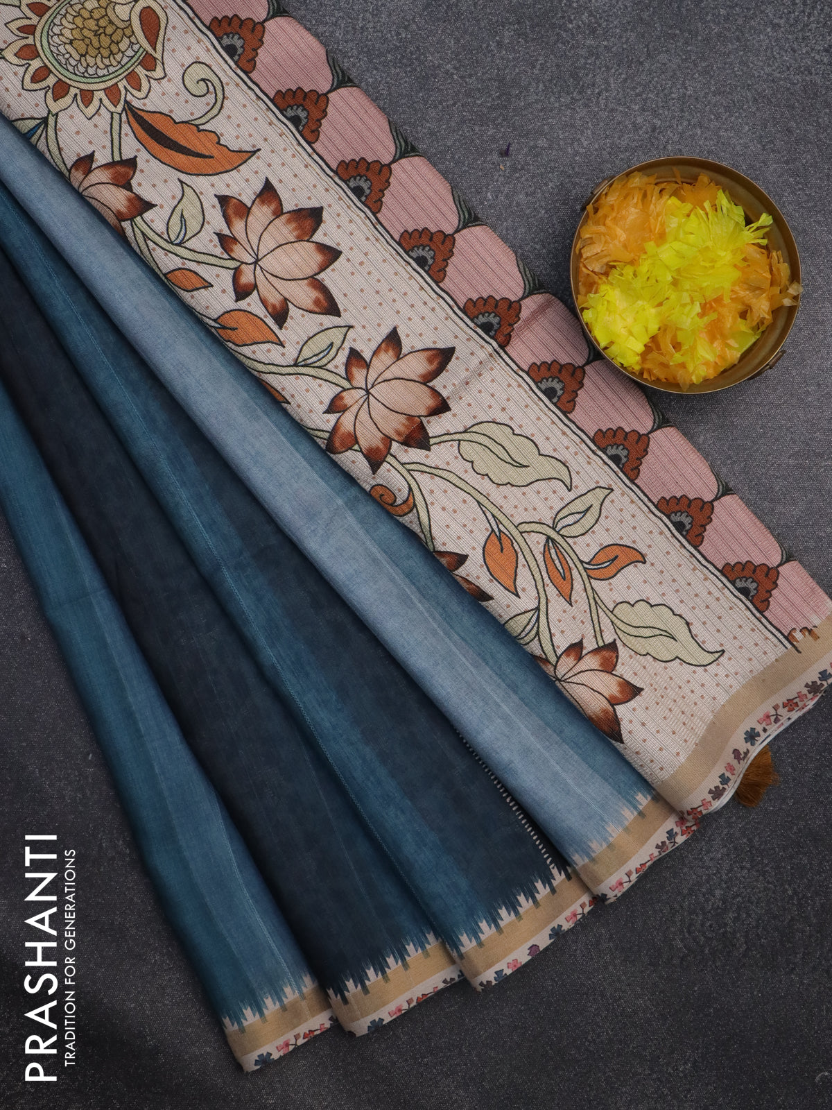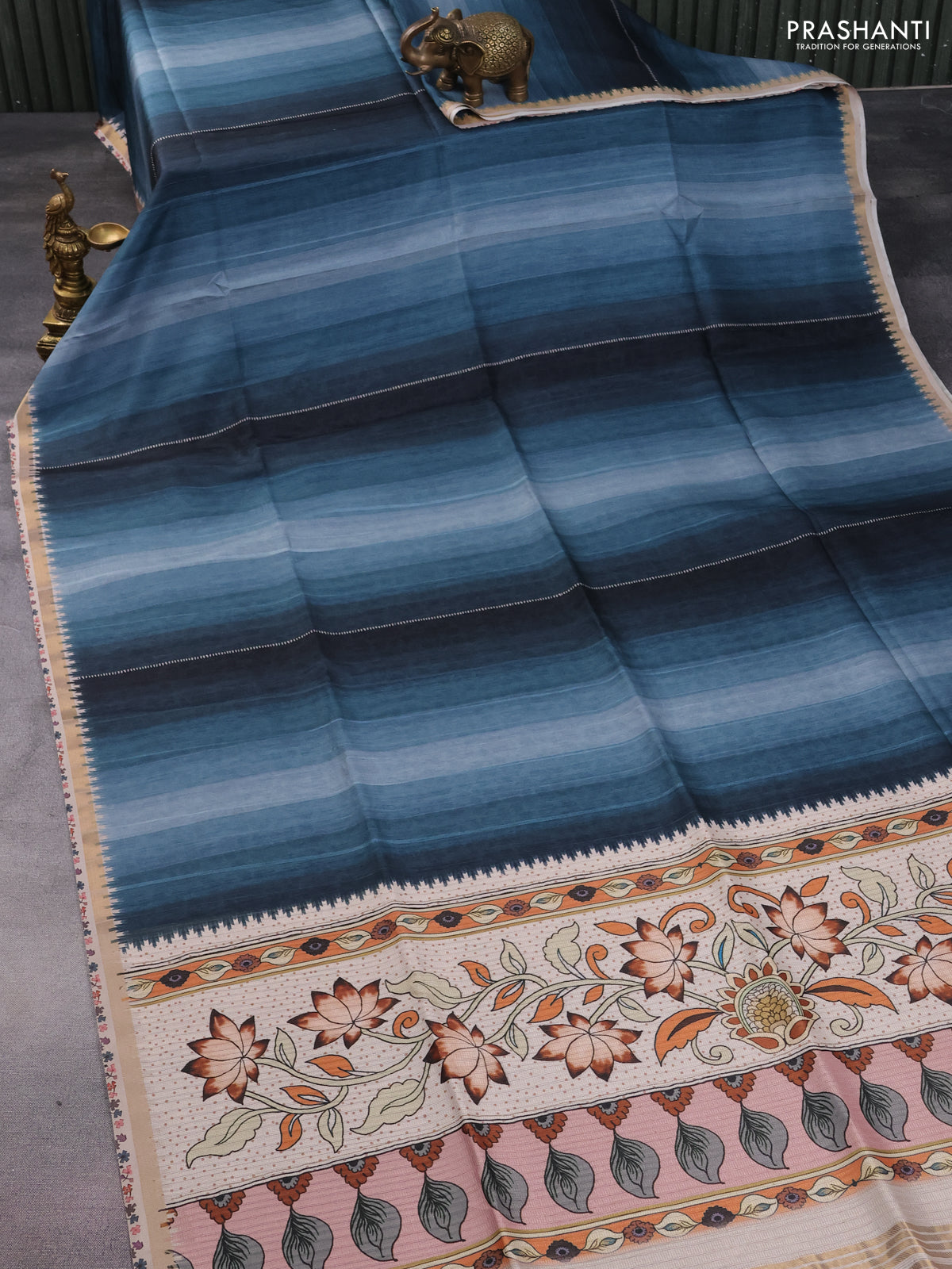 Semi tussar saree pastel blue and beige with plain body and kalamkari printed pallu