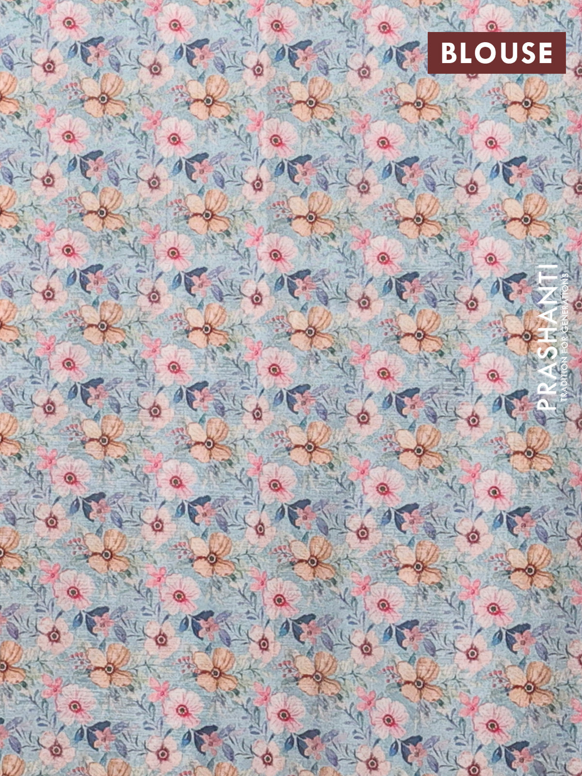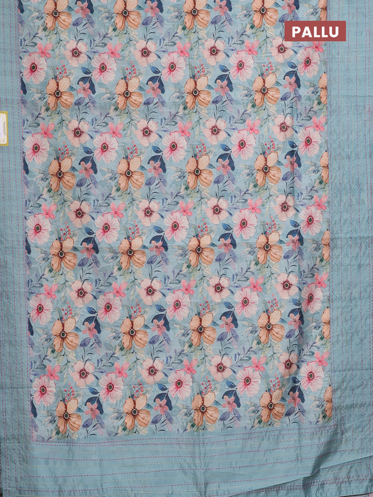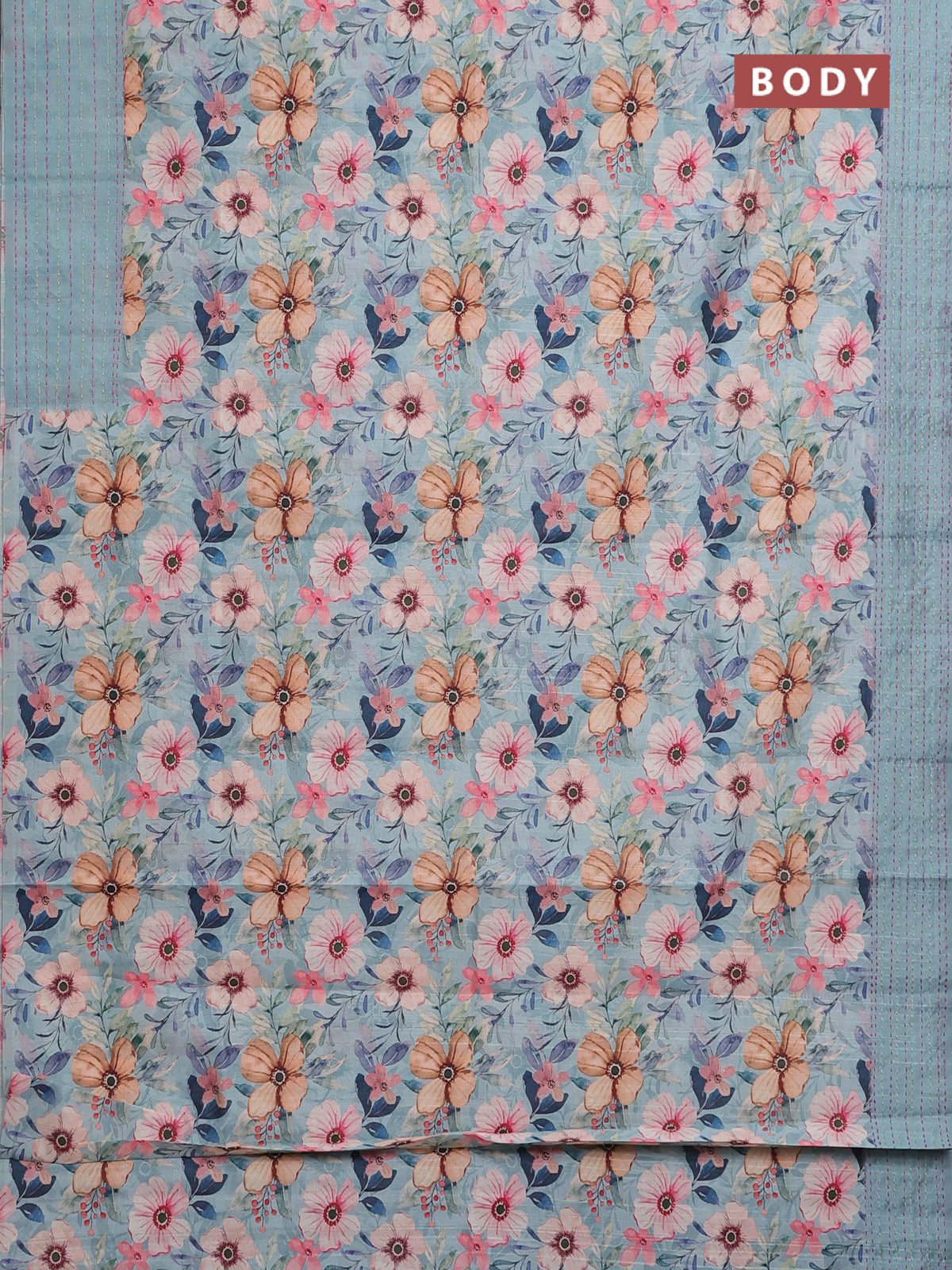 Semi tussar saree pastel blue with floral prints and kantha stitch work border
