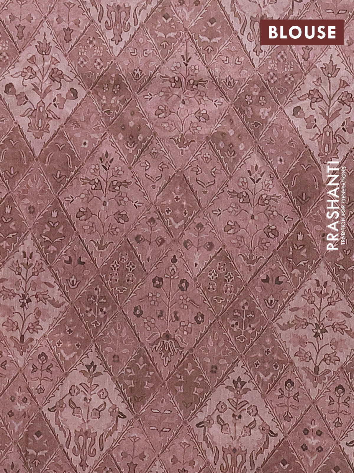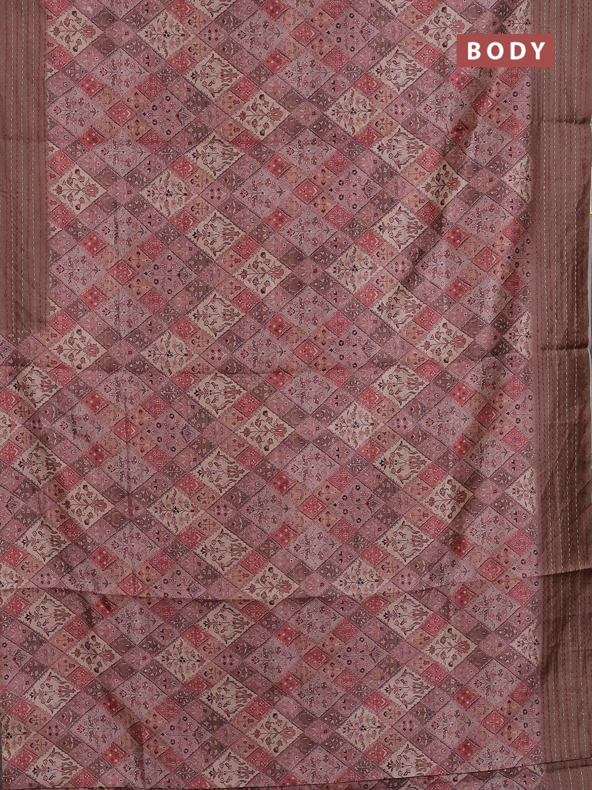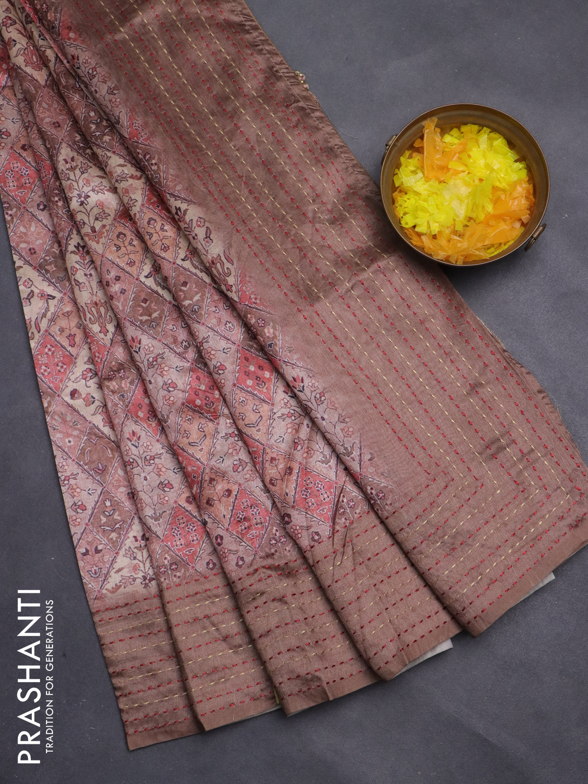 Semi tussar saree pastel brown and brown with allover prints and kantha stitch work border