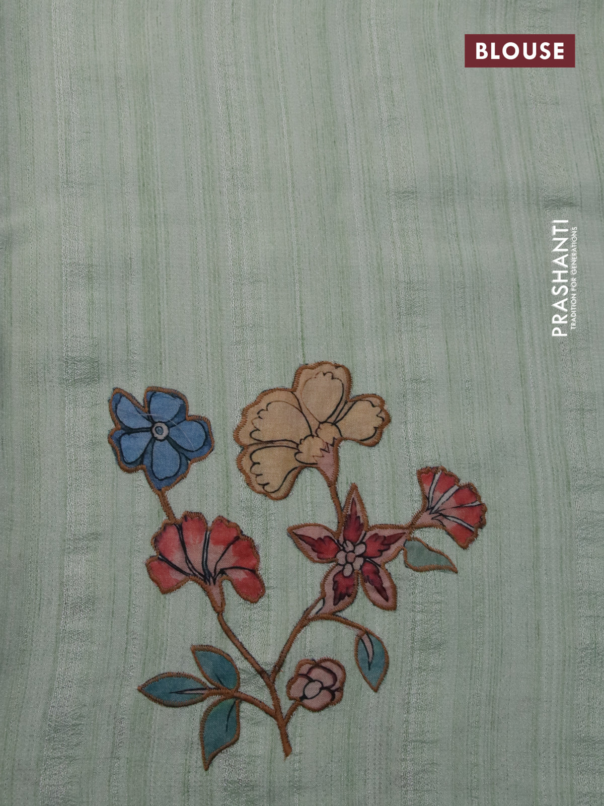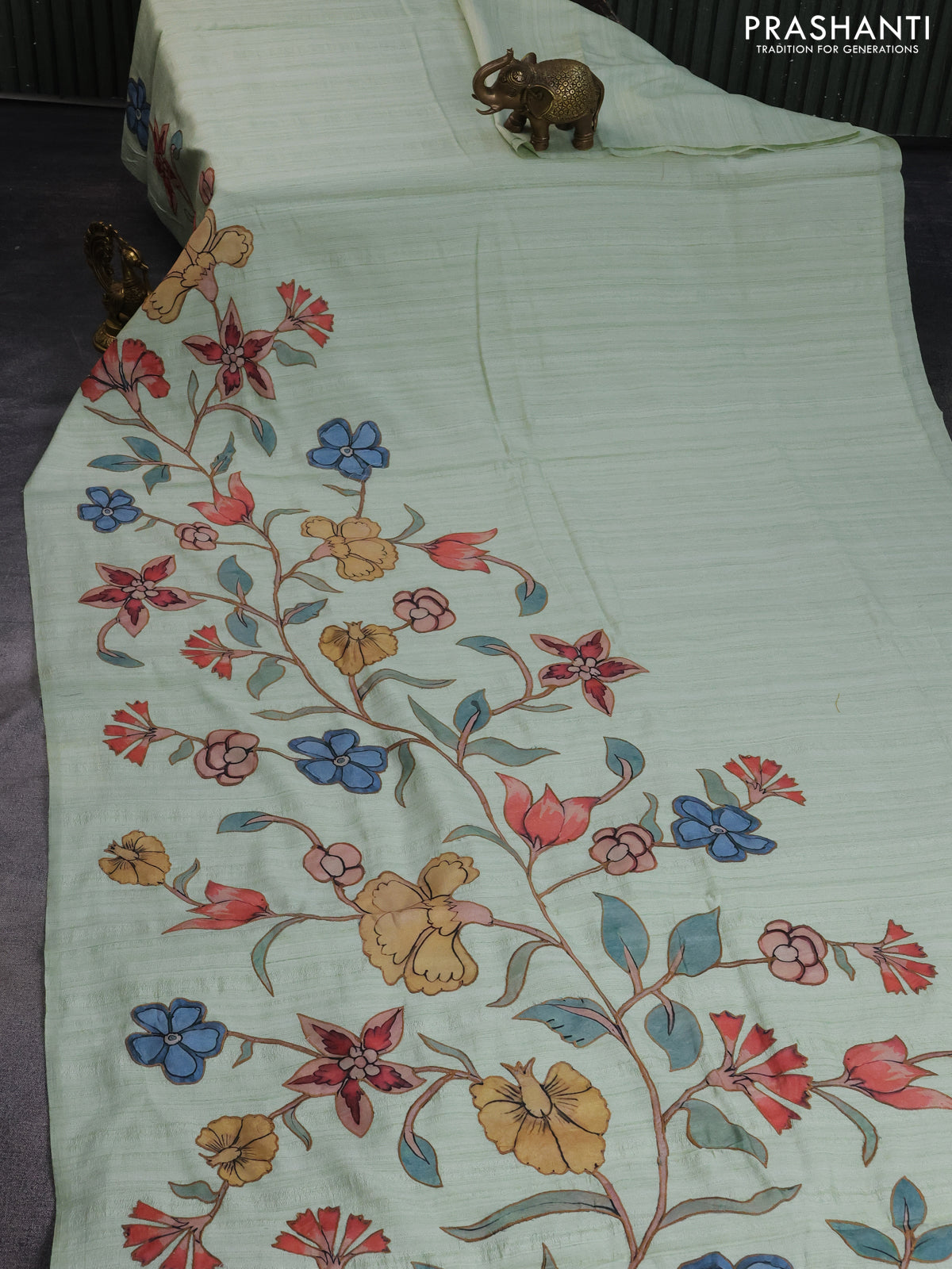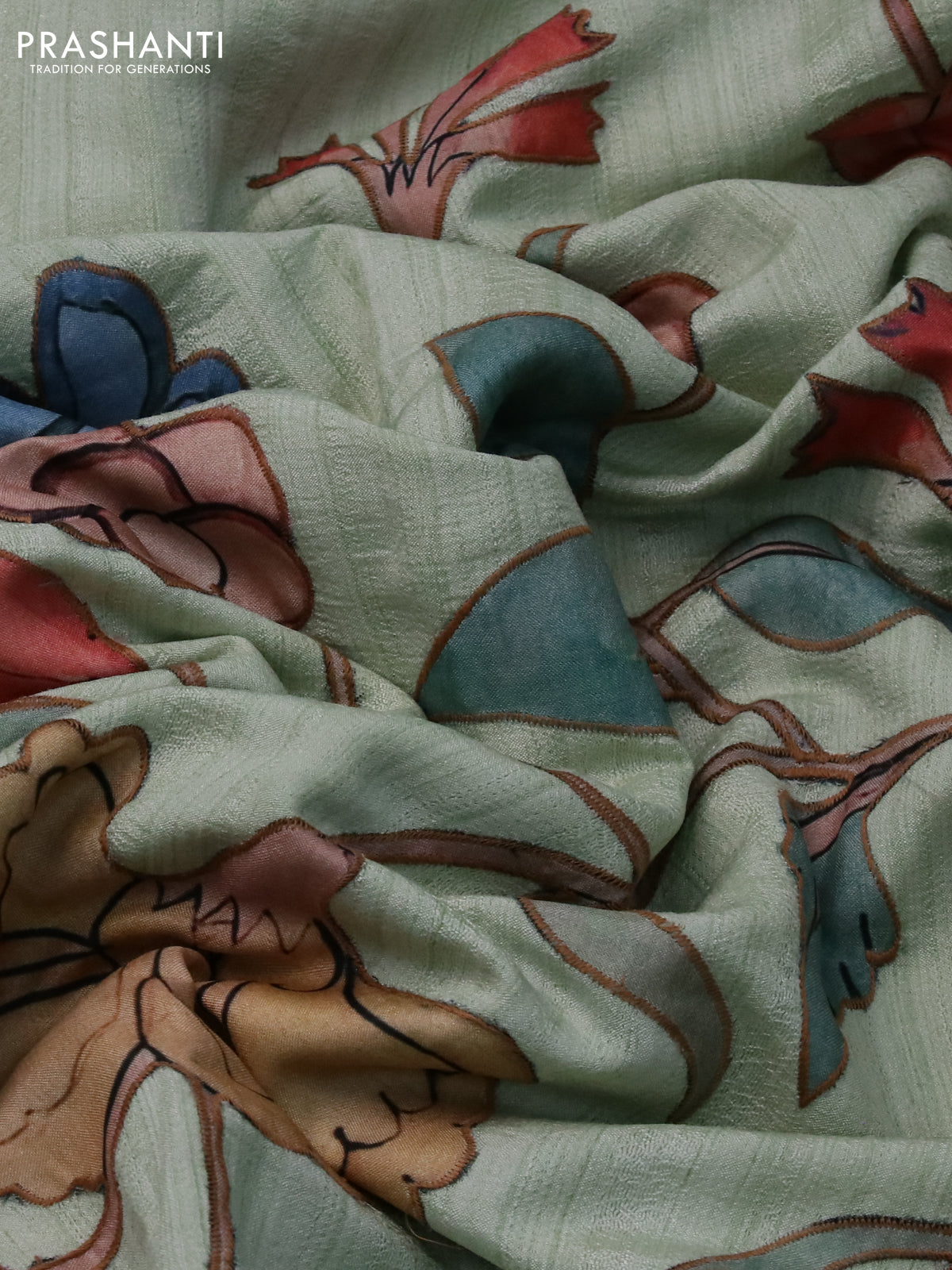 Semi tussar saree pastel green with allover kalamkari applique work in borderless style