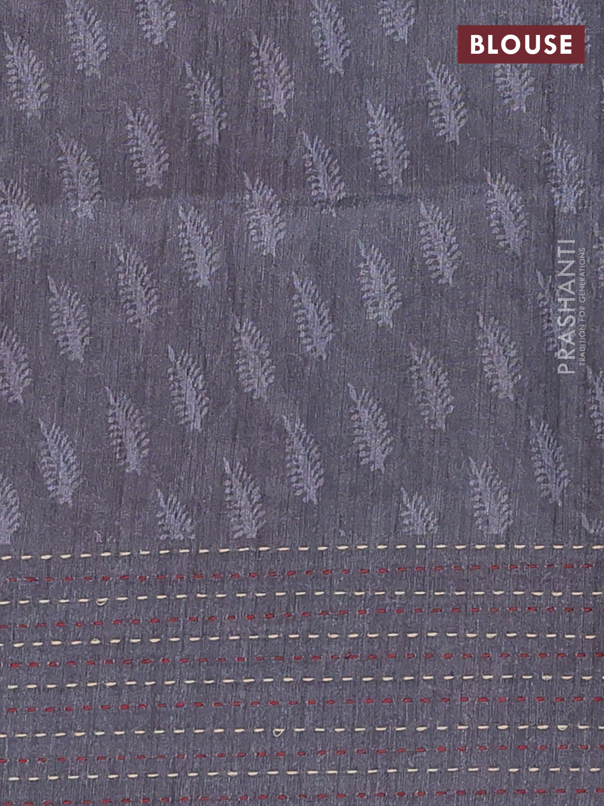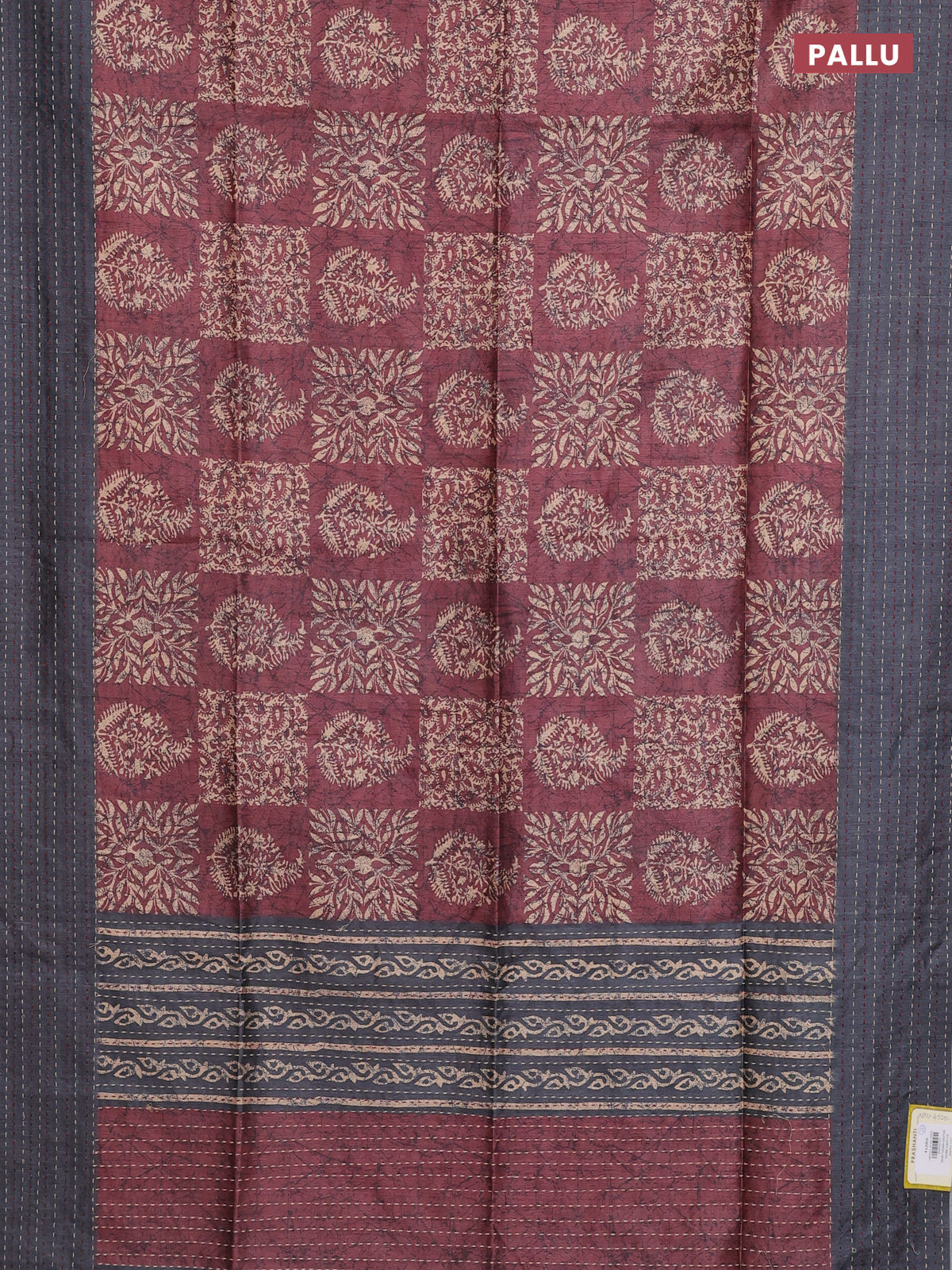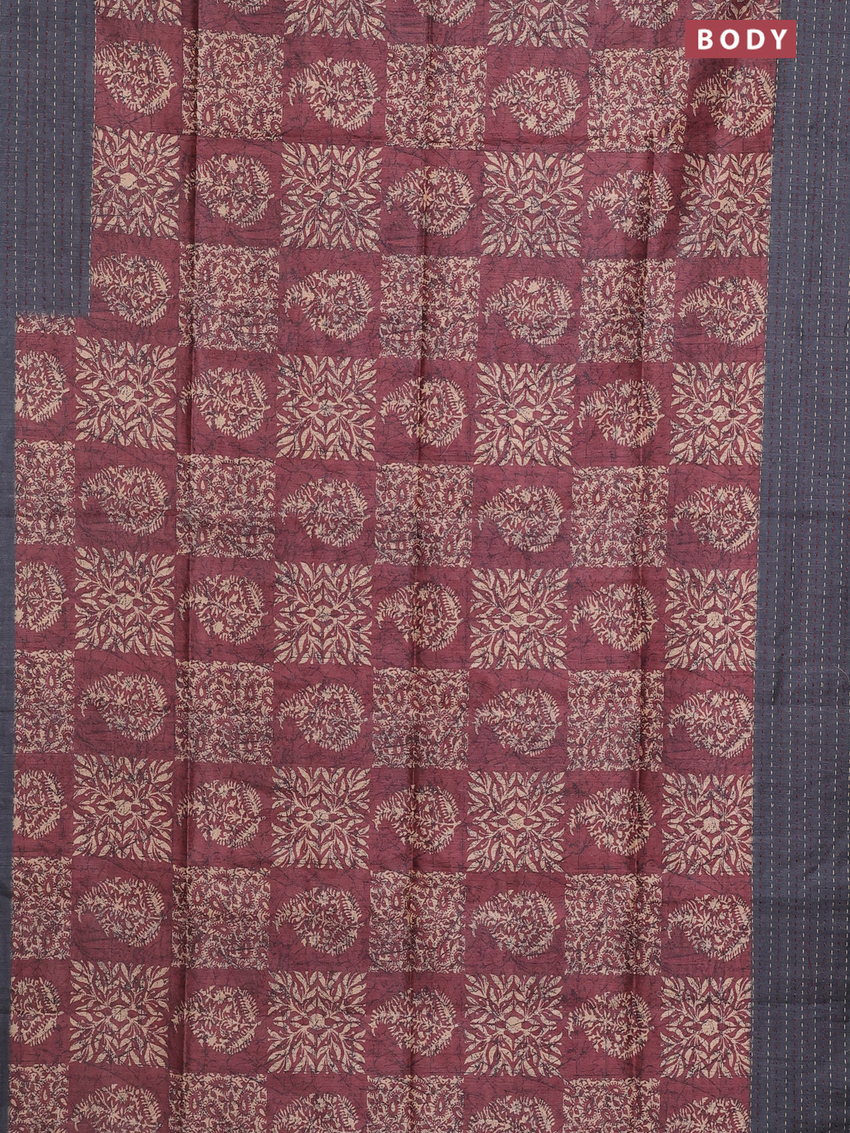 Semi tussar saree pastel maroon and grey with allover batik prints and katha stitch work pallu & border