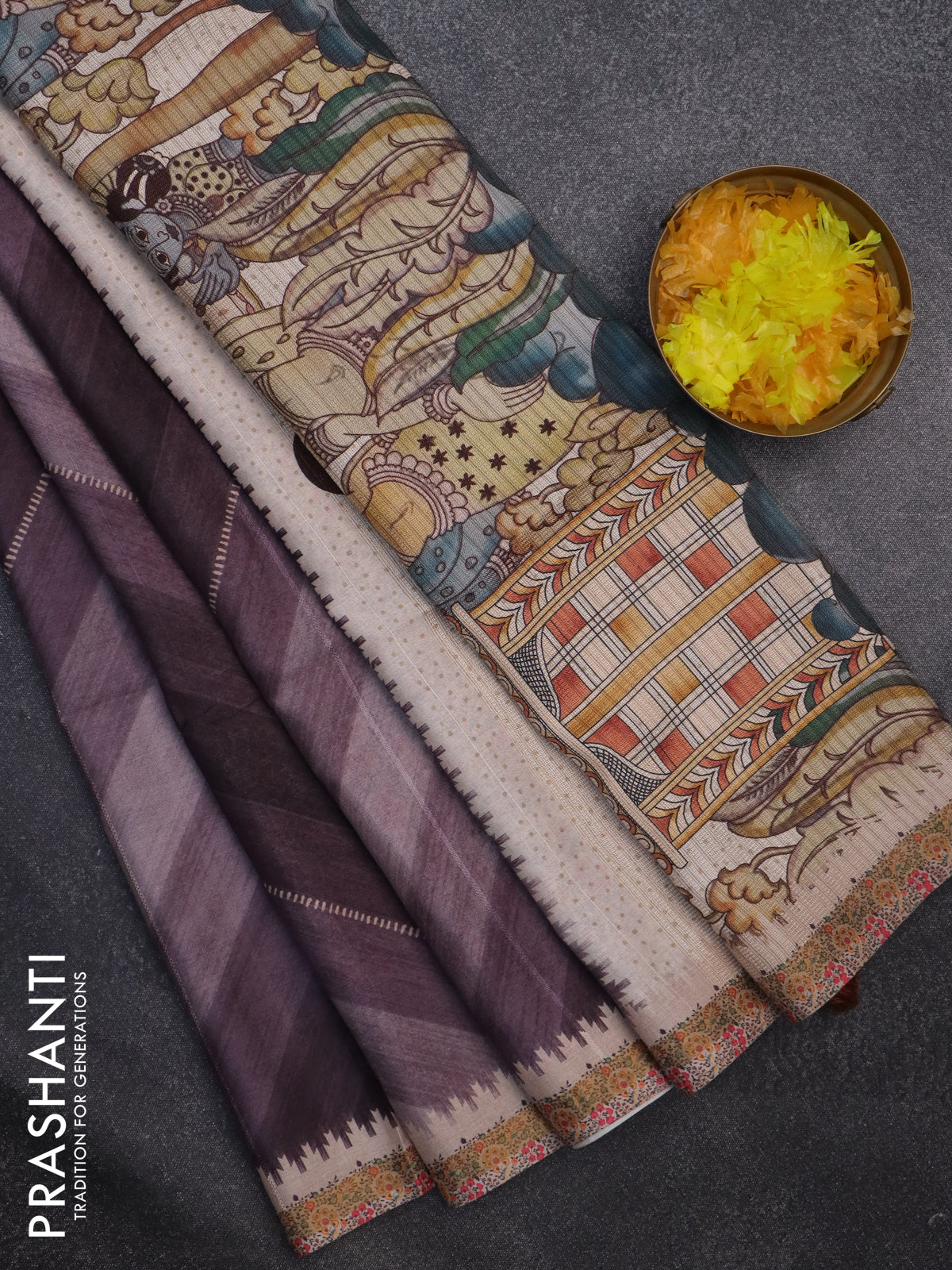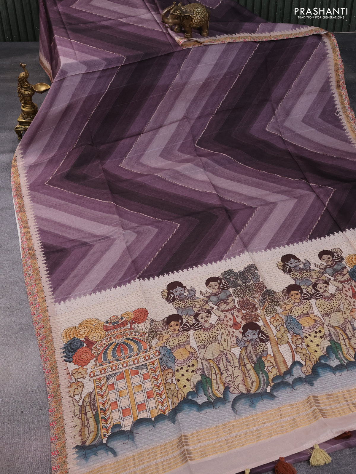 Semi tussar saree pastel wine shade and beige with allover zig zag saree and kalamkari printed pallu