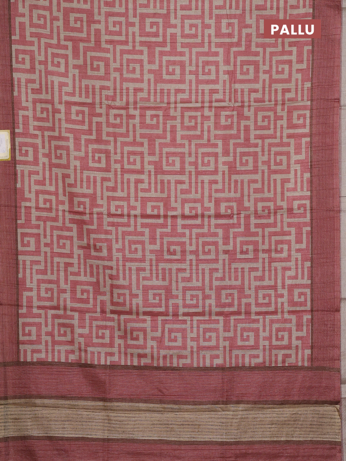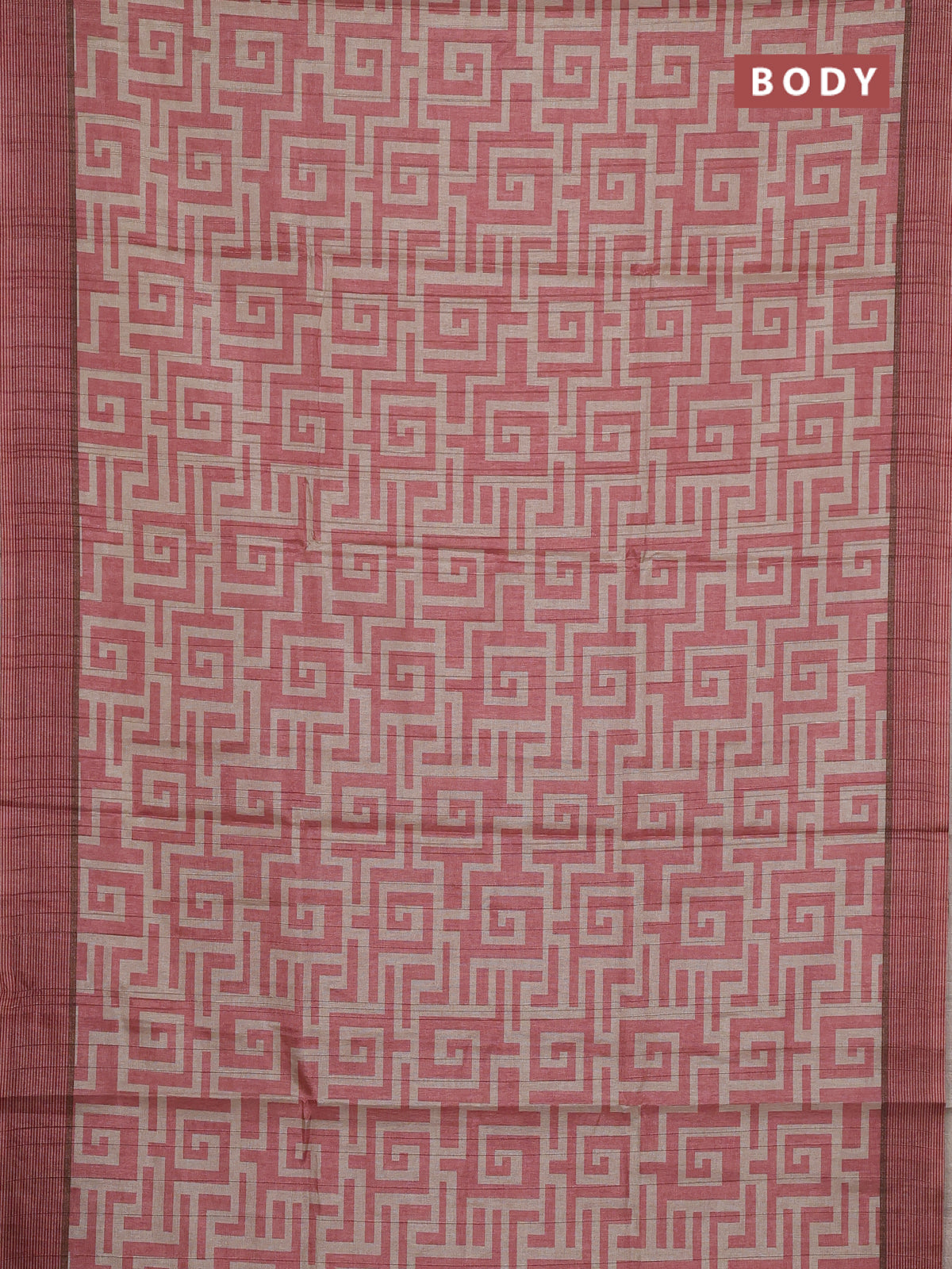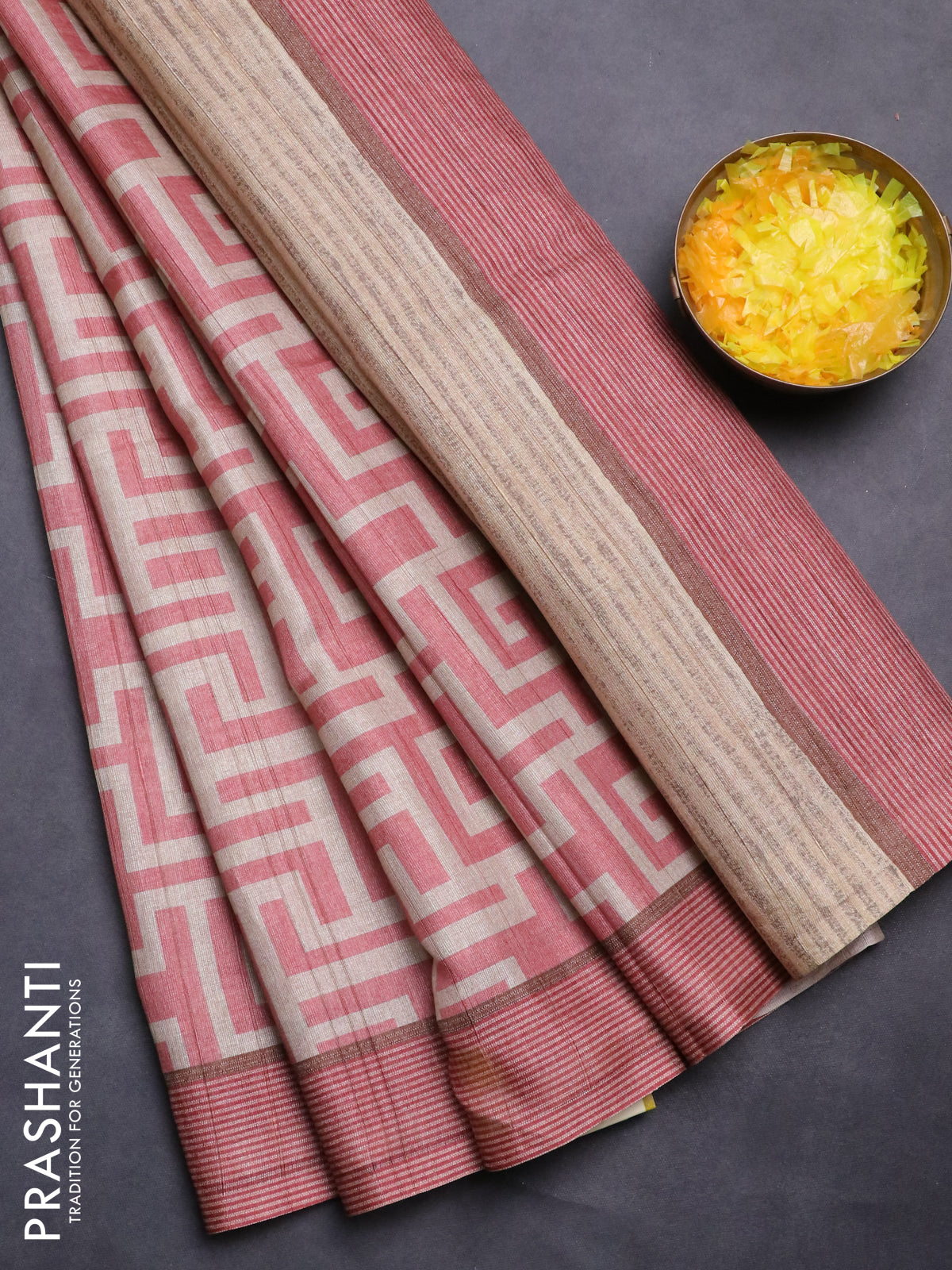 Semi tussar saree peach shade and beige with geometric prints and simple border