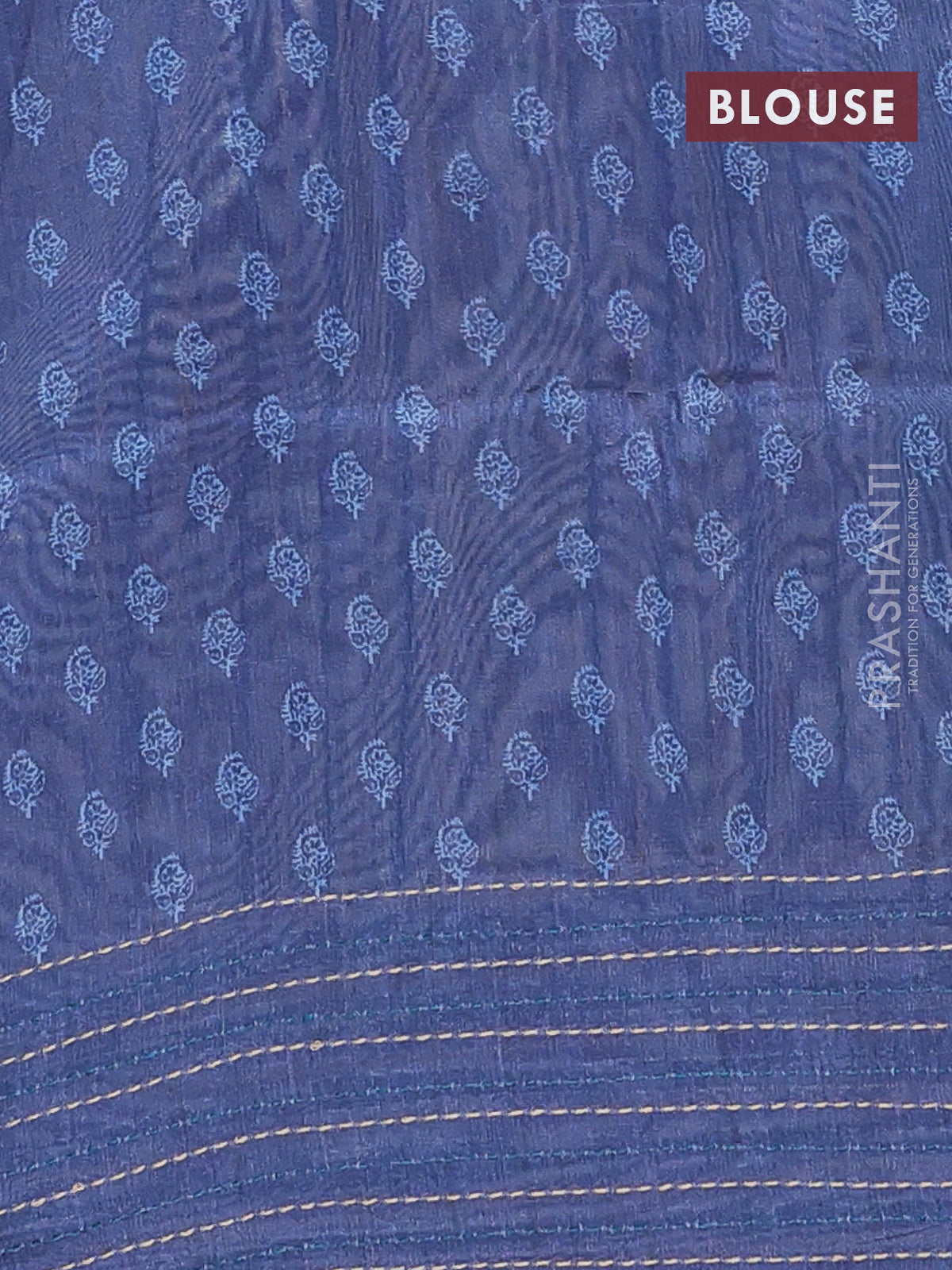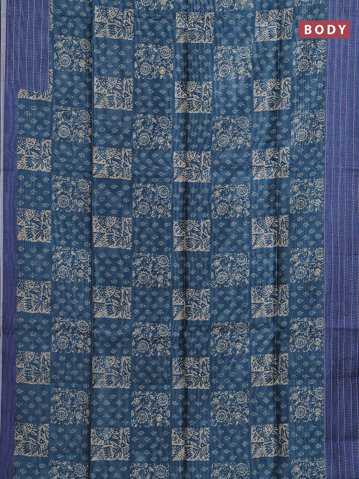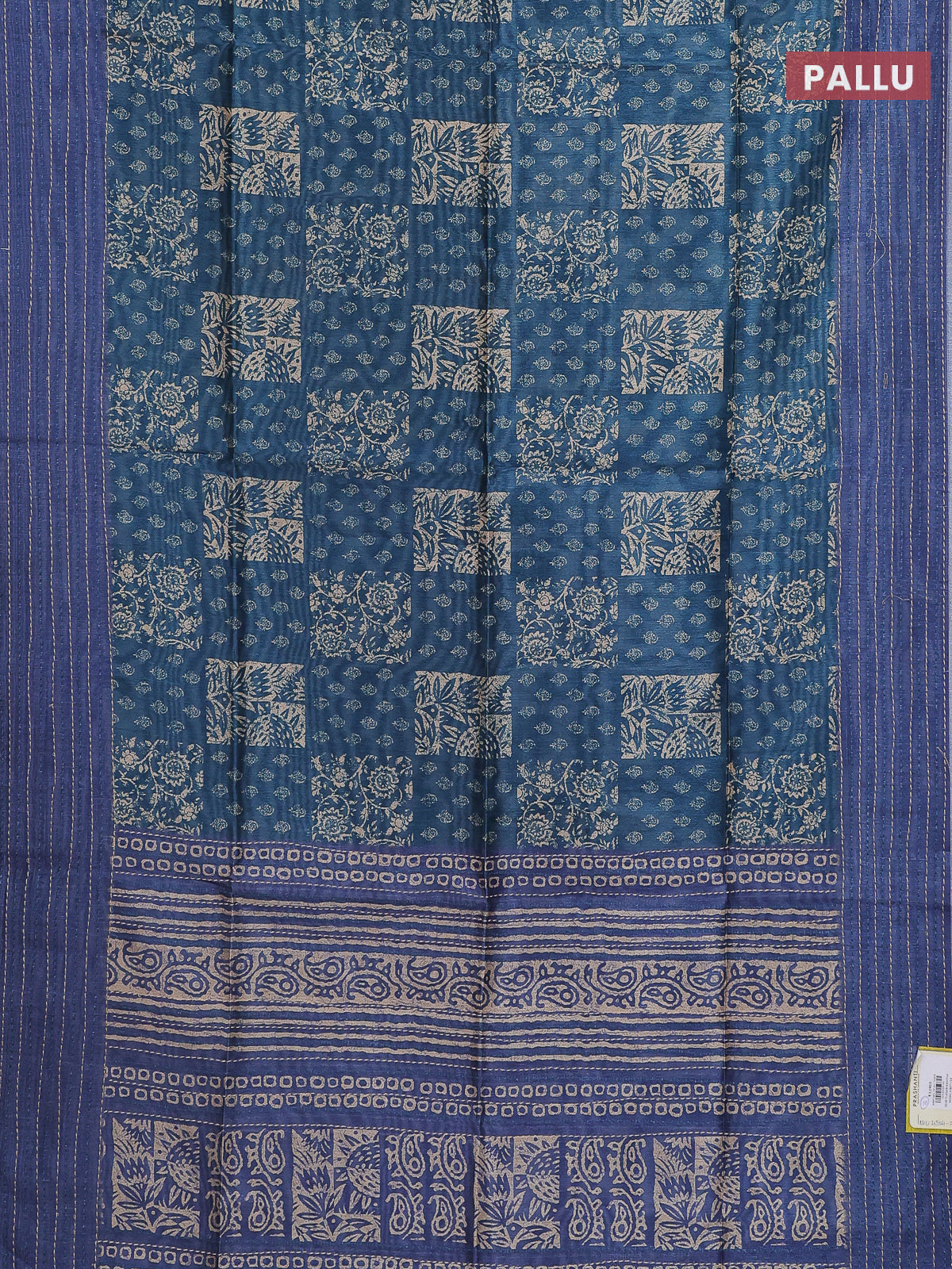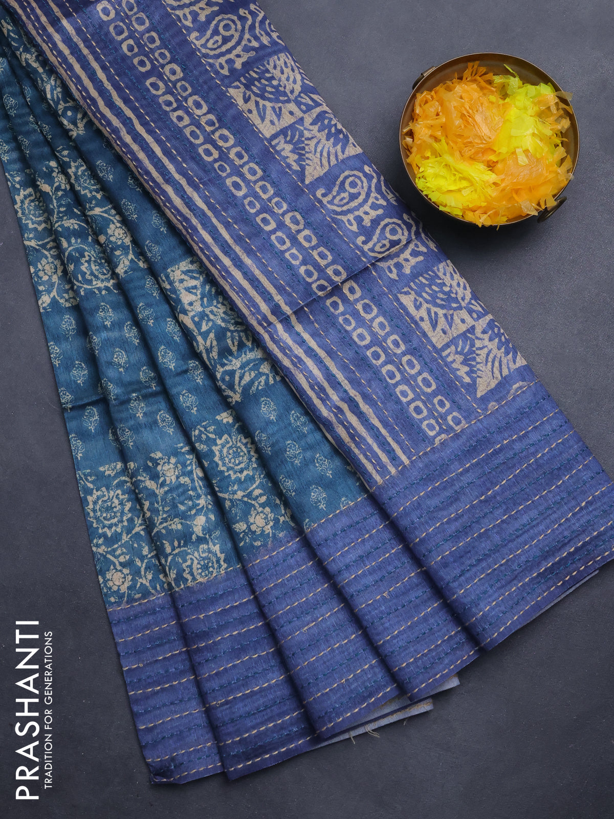 Semi tussar saree peacock blue and blue with allover batik prints and katha stitch work pallu & border