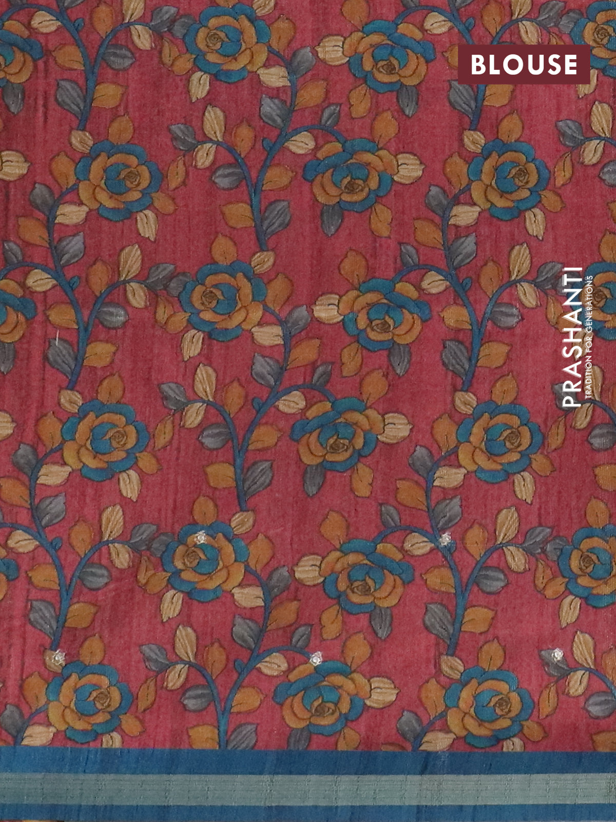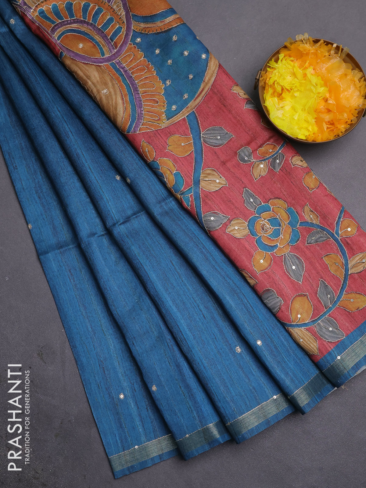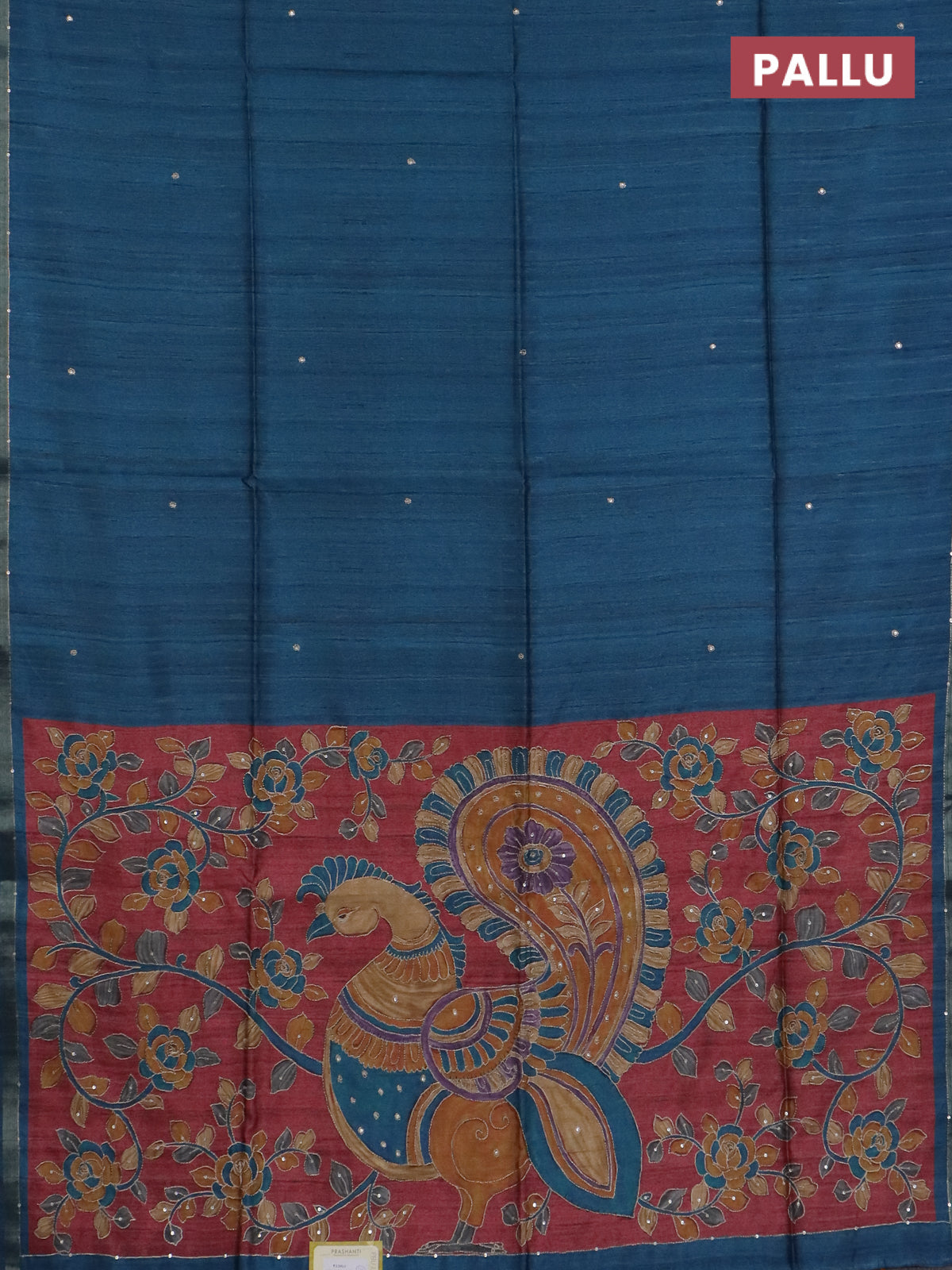 Semi tussar saree peacock blue and maroon with embroidery buttas and kalamkari prints & pita work pallu