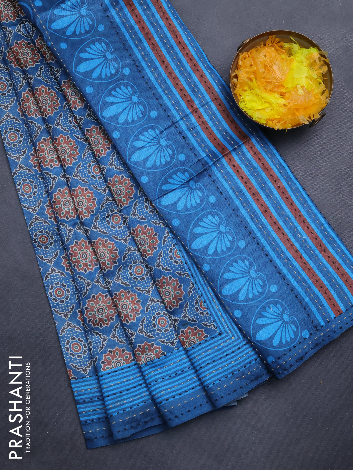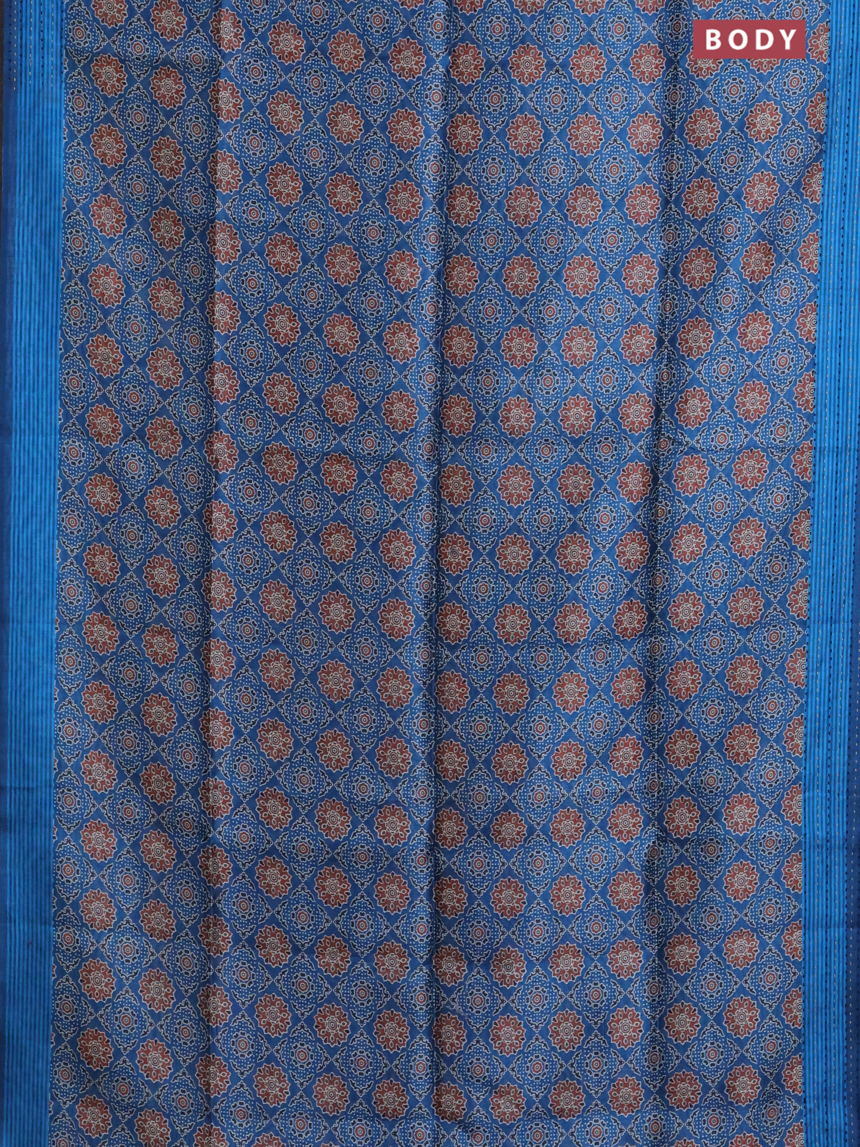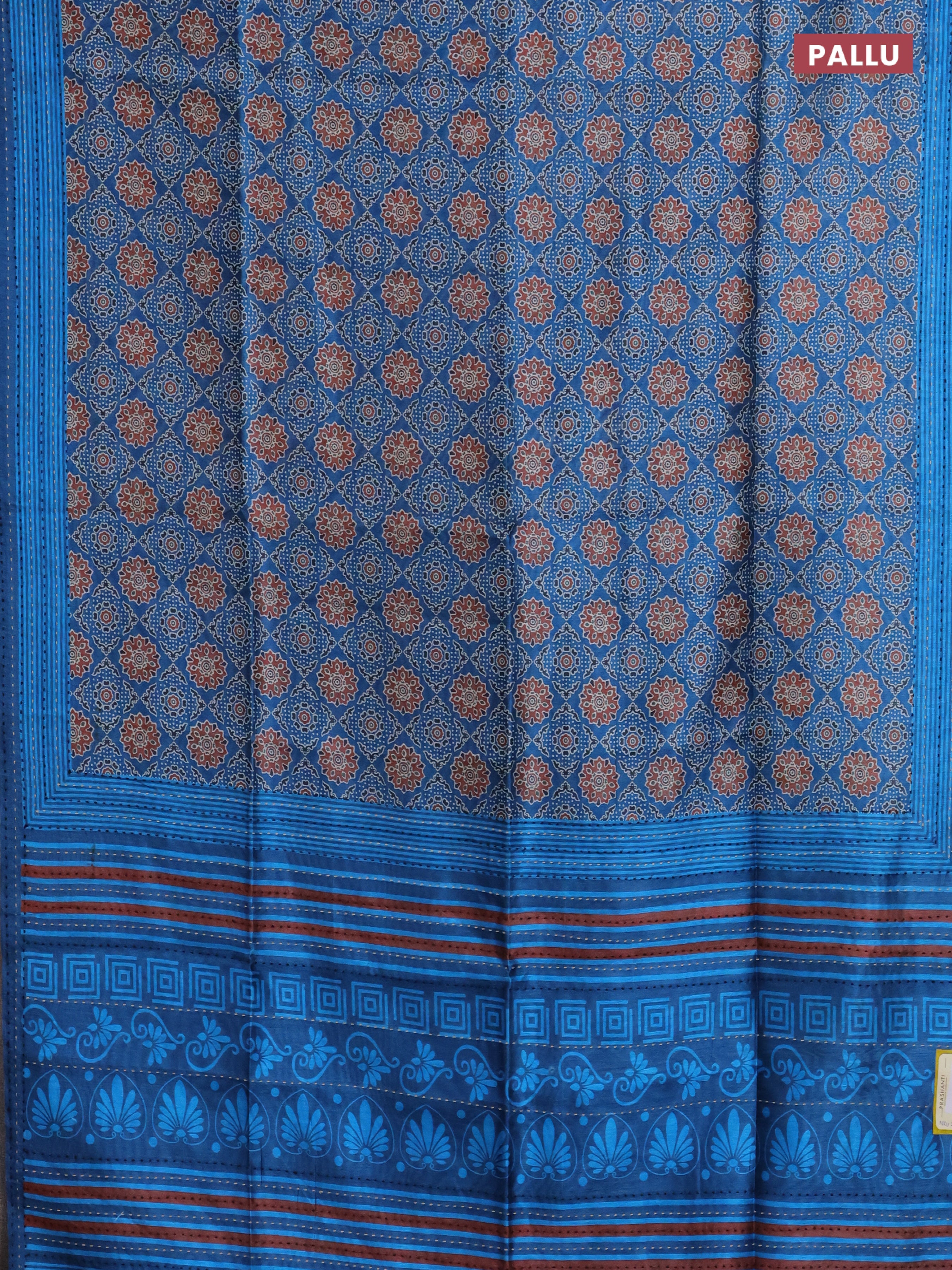 Semi tussar saree peacock blue with allover ajrakh prints and katha stitch work pallu & border