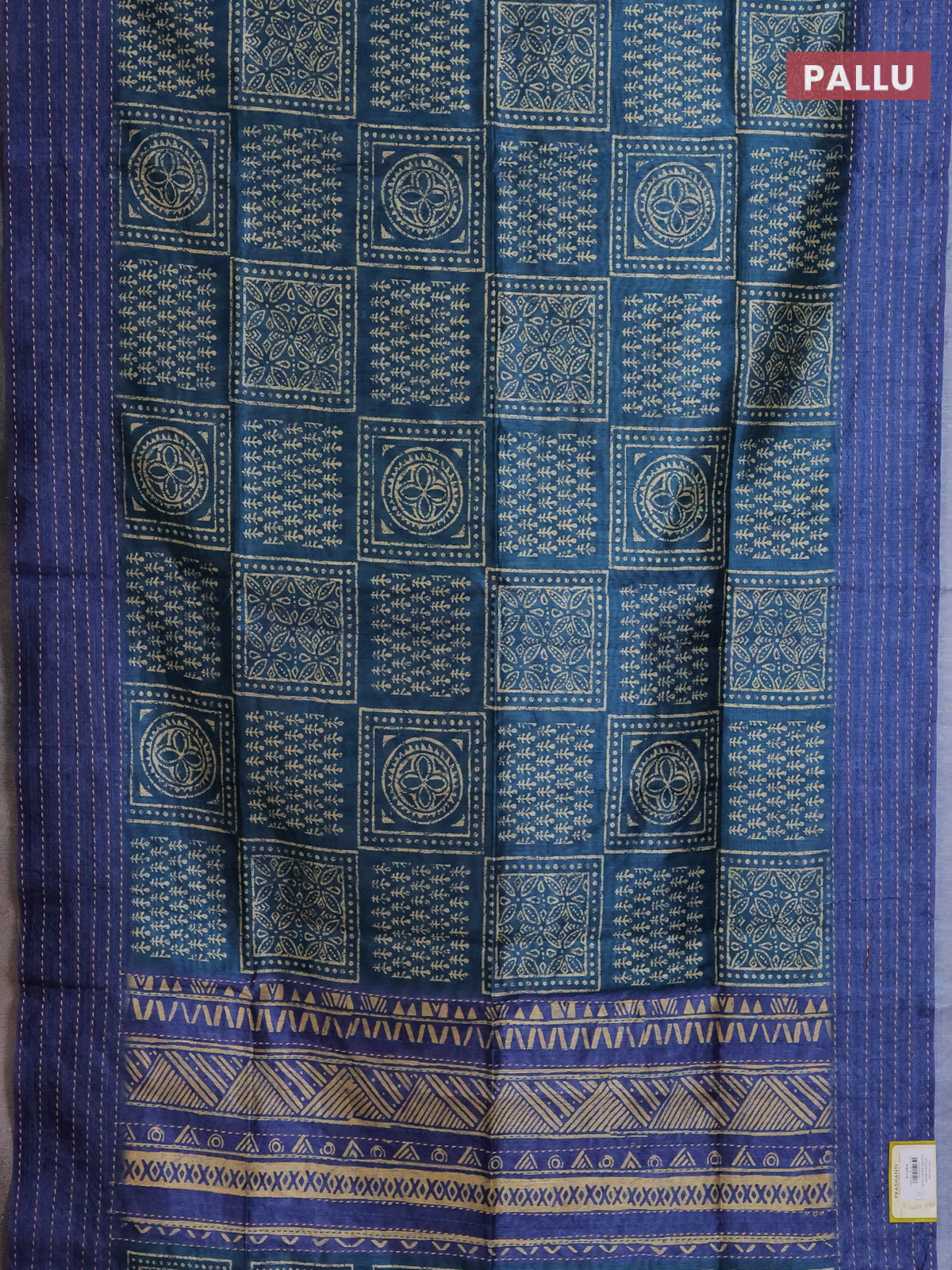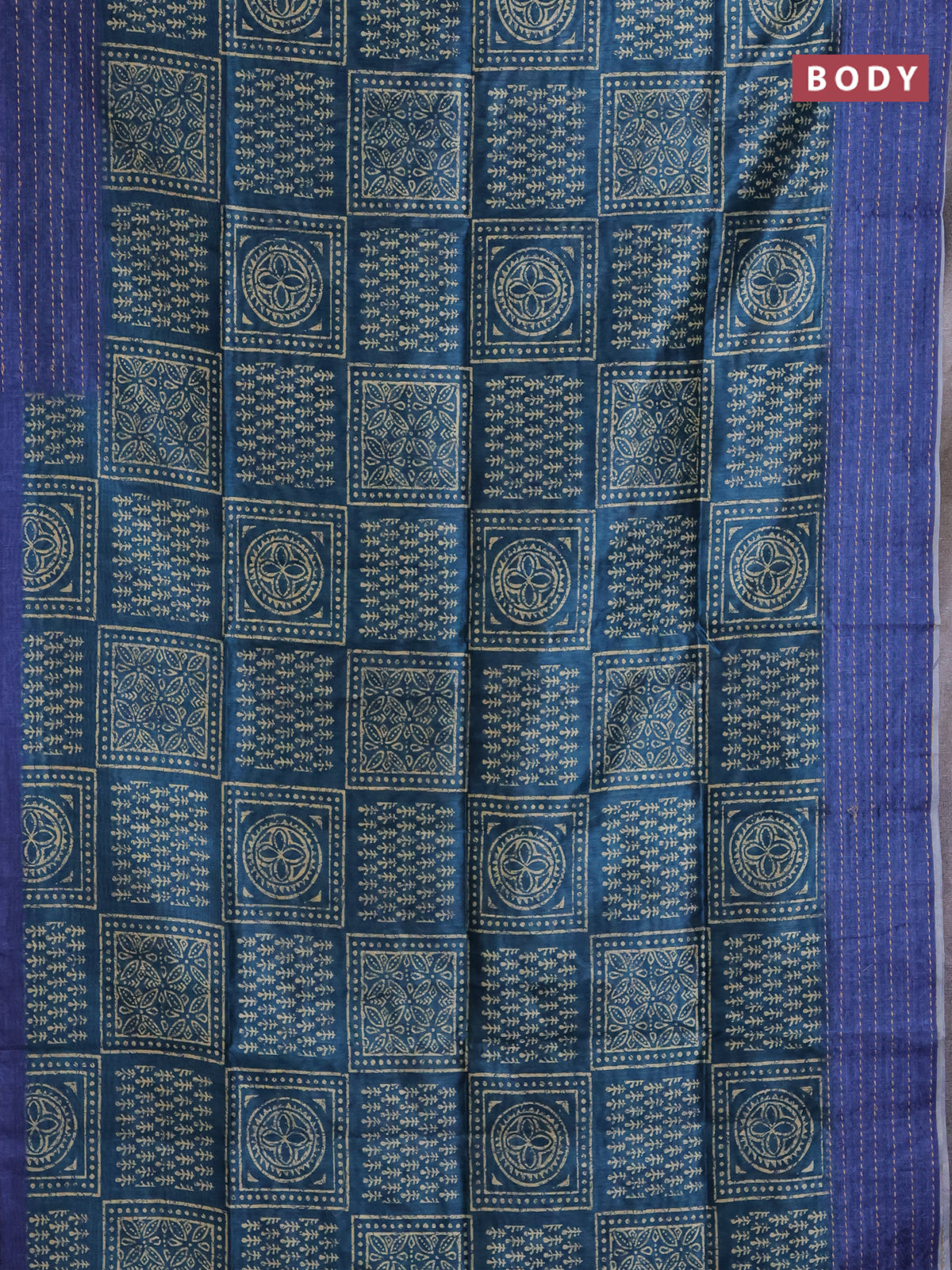 Semi tussar saree peacock green and blue with allover batik prints and katha stitch work pallu & border