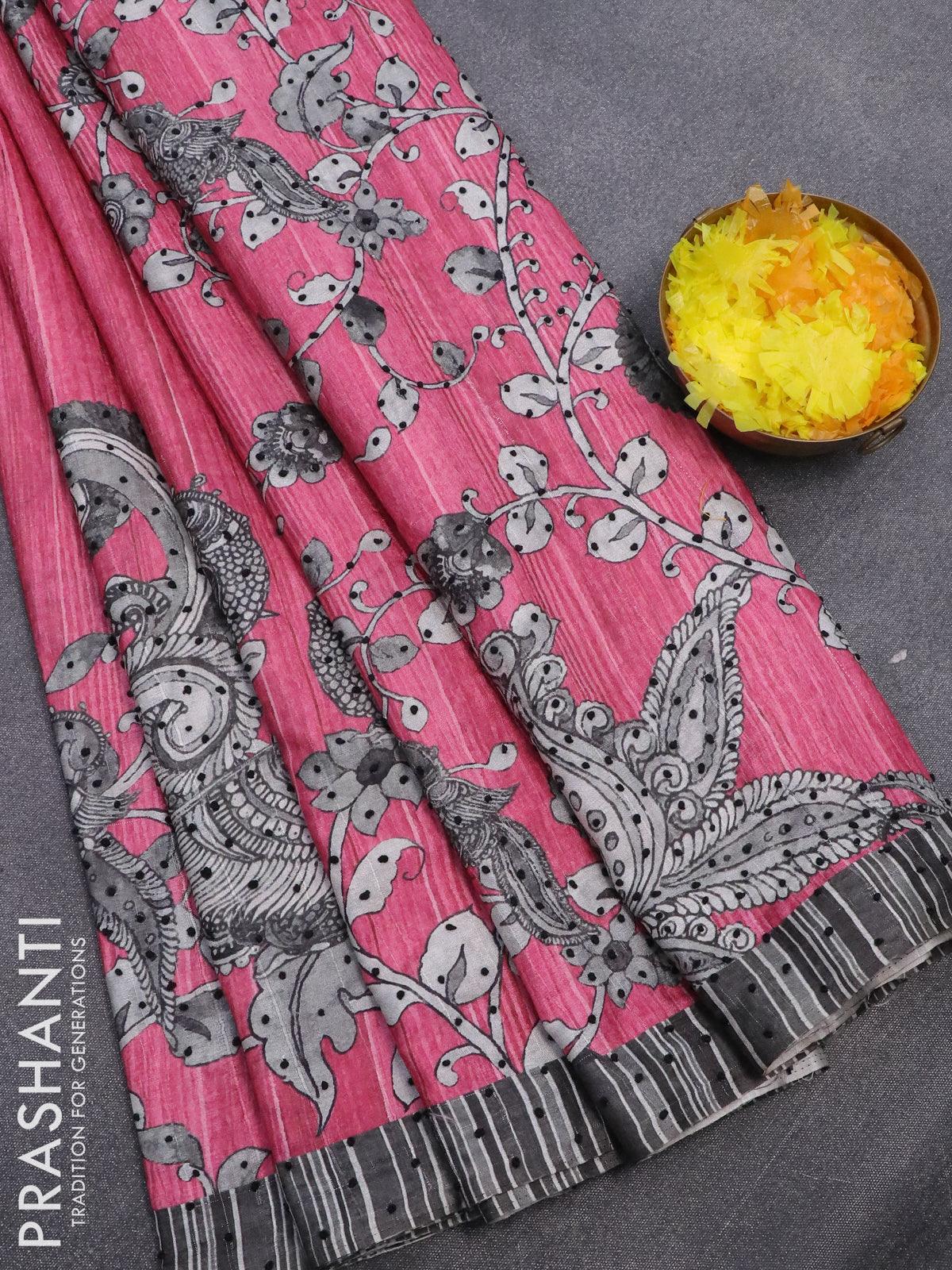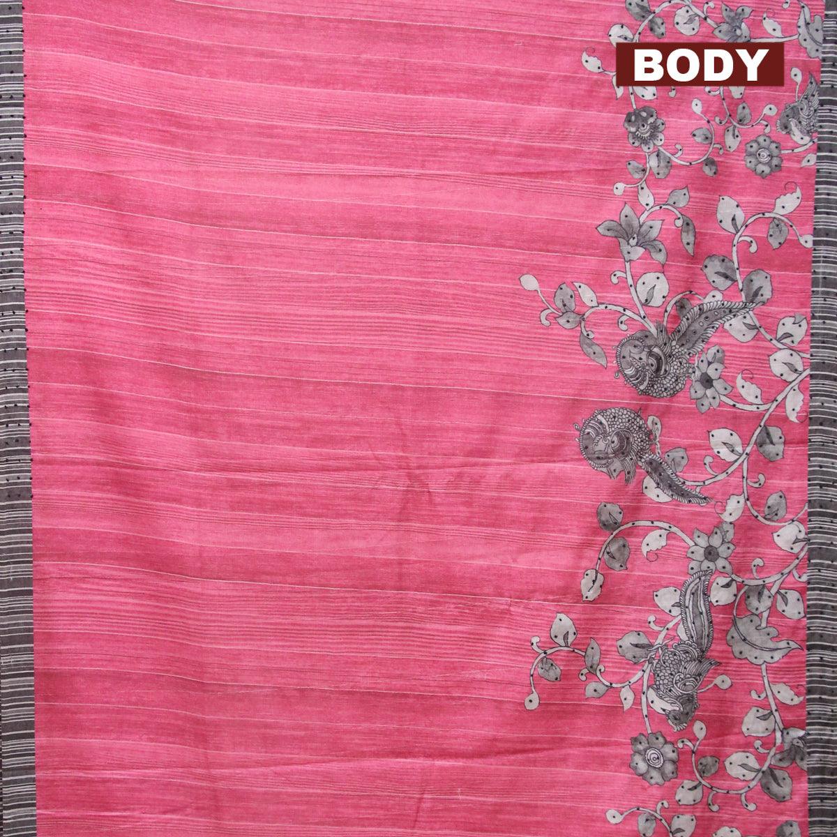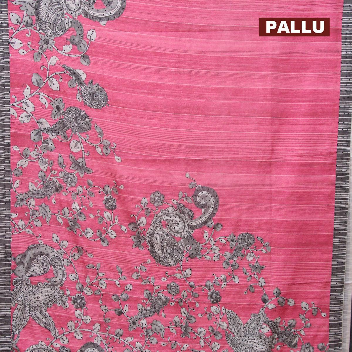 Semi tussar saree pink and grey with kalamkari prints & french knot work and simple border