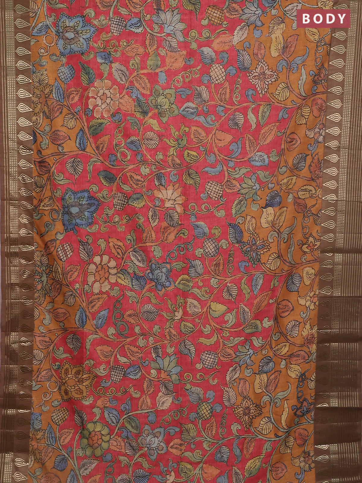 Semi tussar saree red shade and brown with allover kalamkari prints and zari woven border