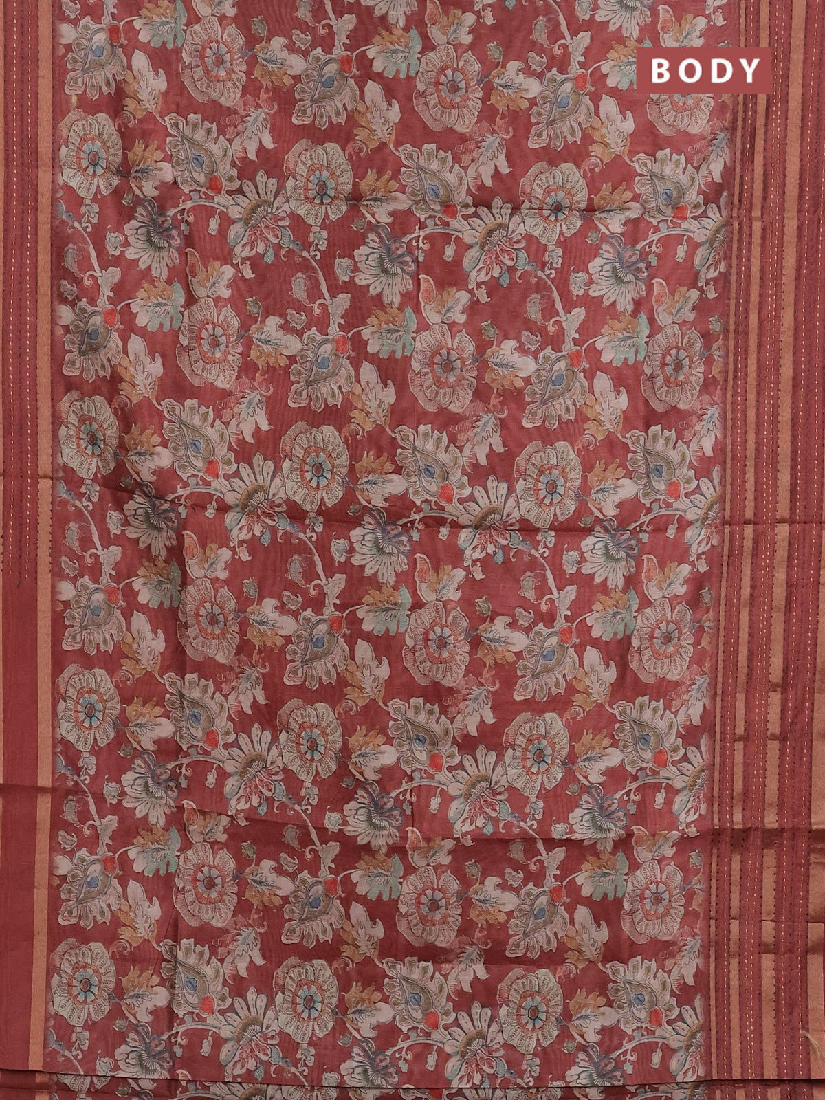Semi tussar saree rust shade with allover kalamkari prints and kantha stitch work border