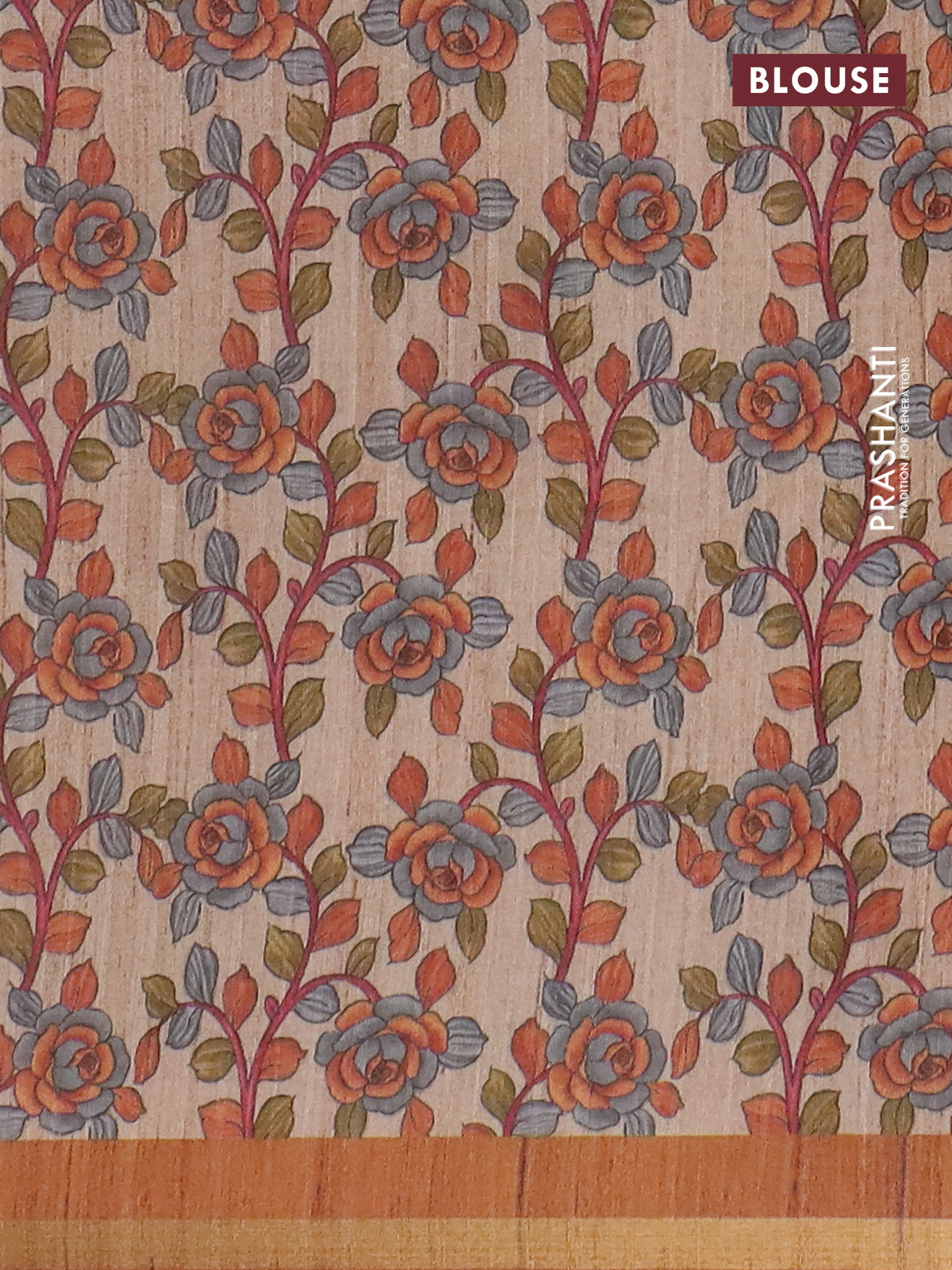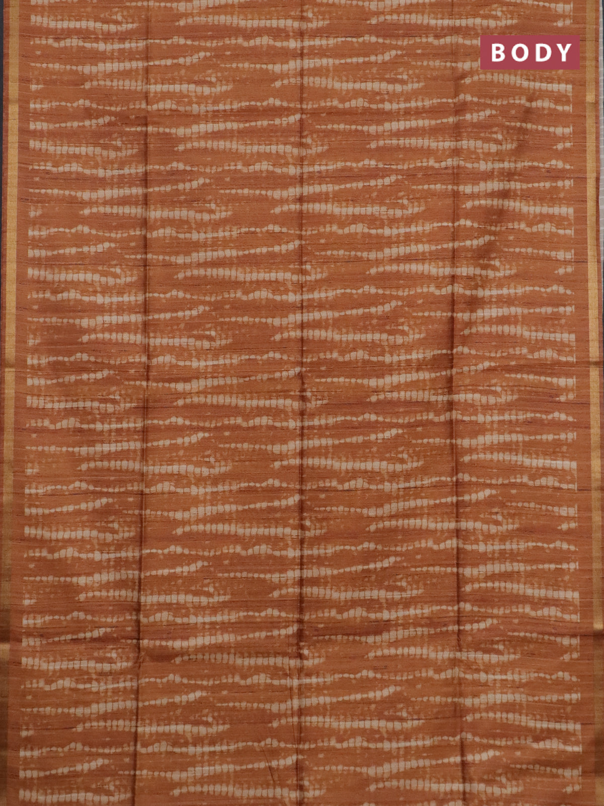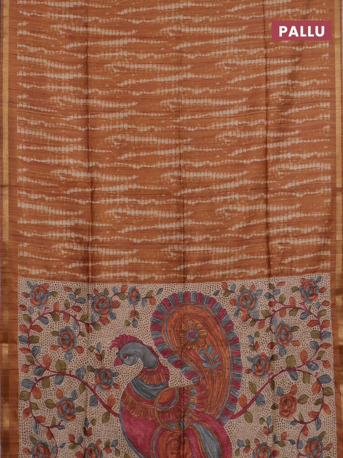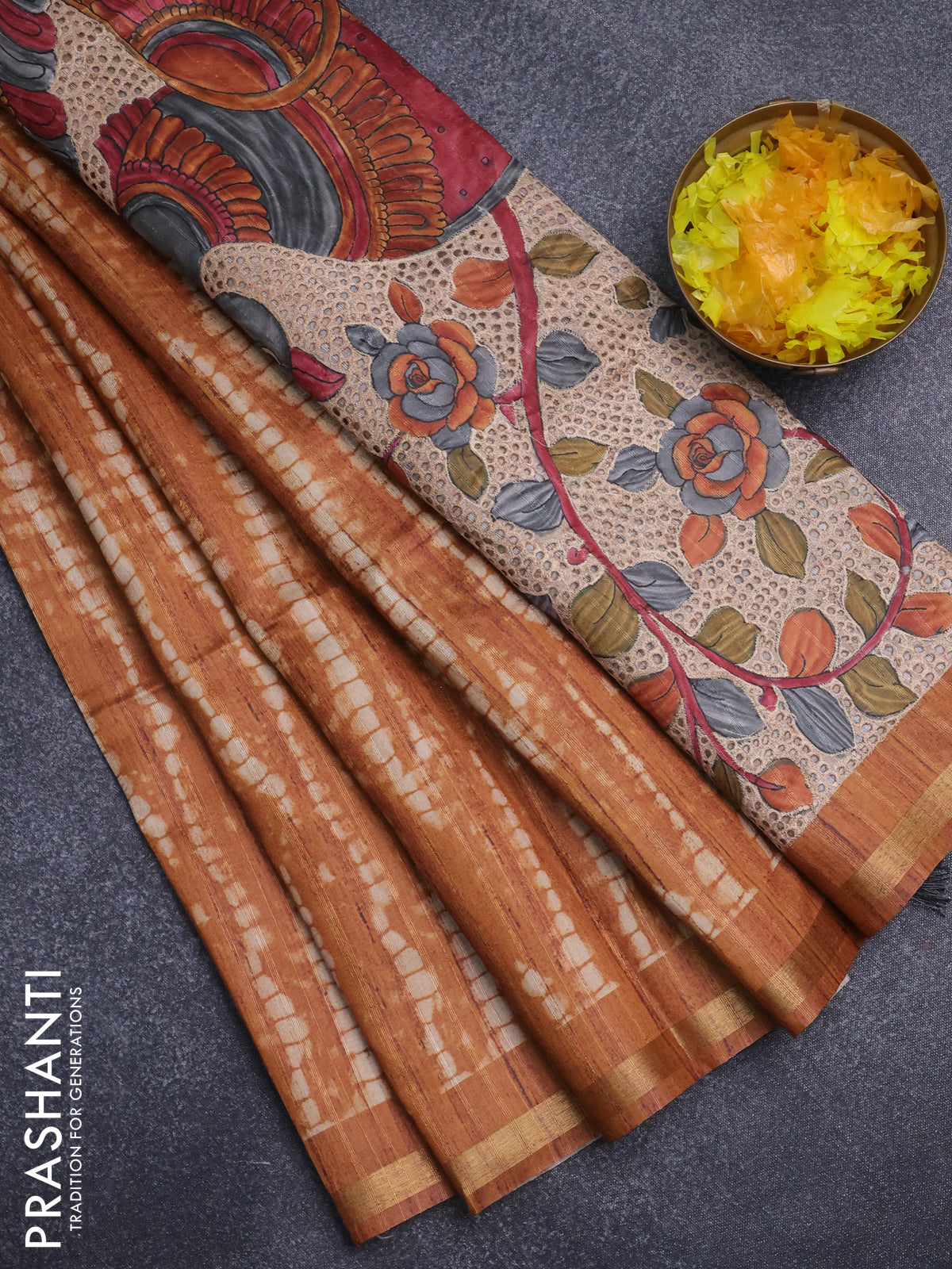 Semi tussar saree rustic orange with shibori prints and kalamkari prints & cut work pallu