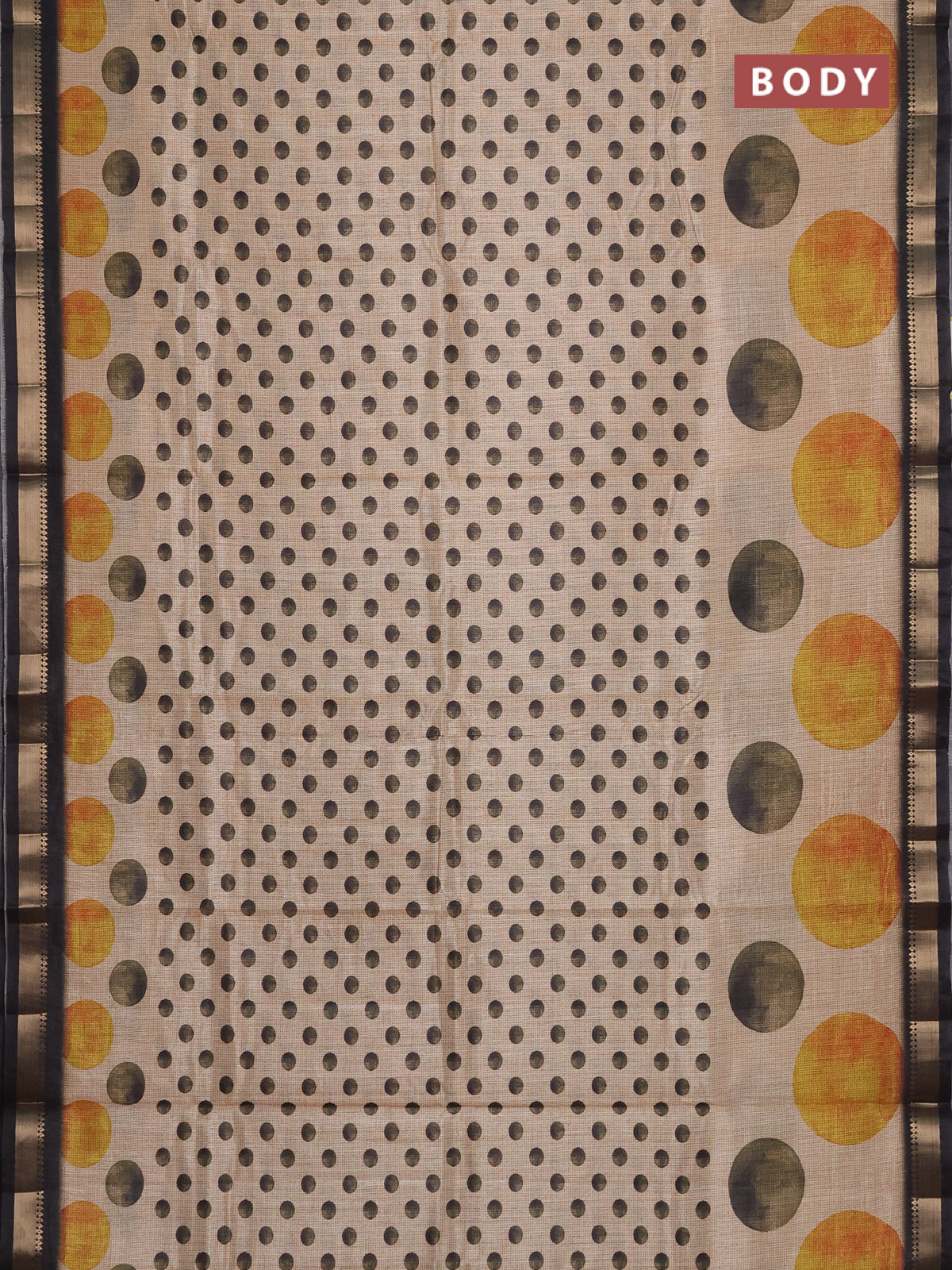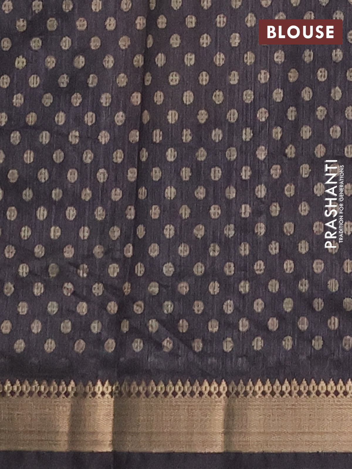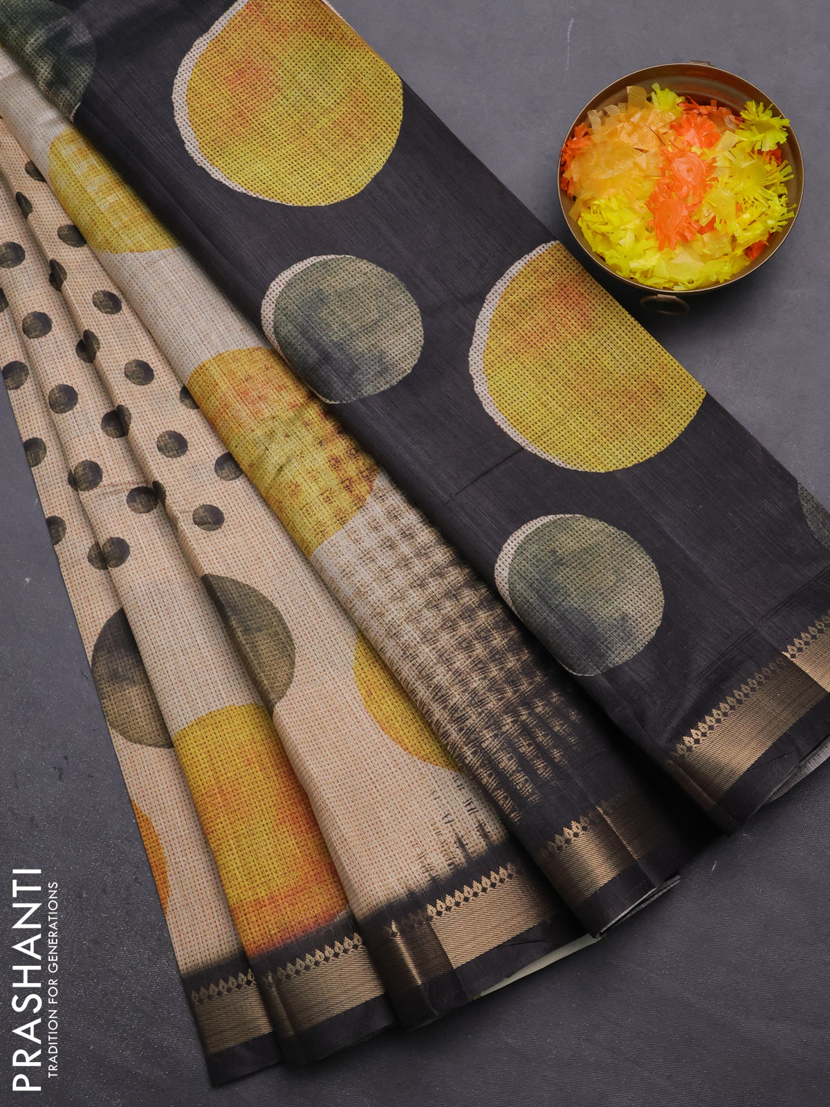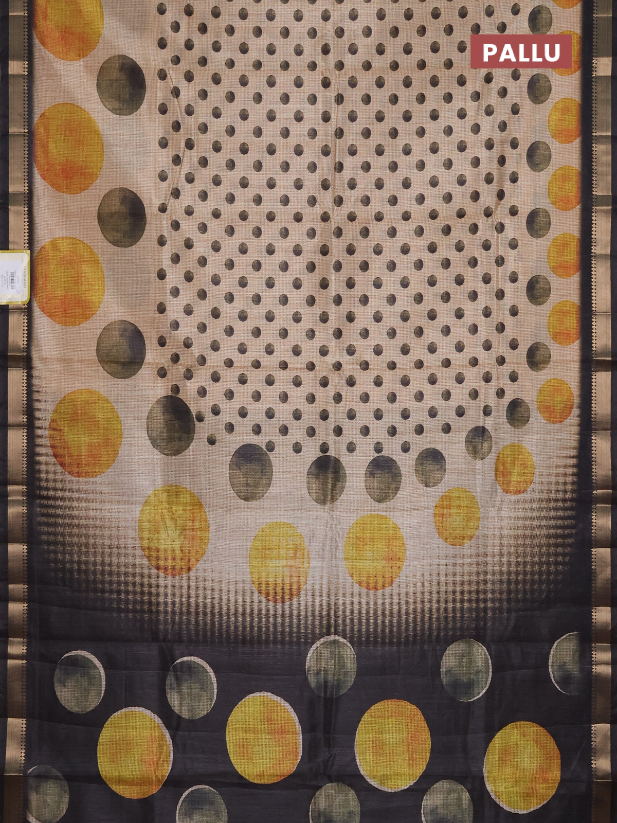 Semi tussar saree sandal and black with butta prints and zari woven border