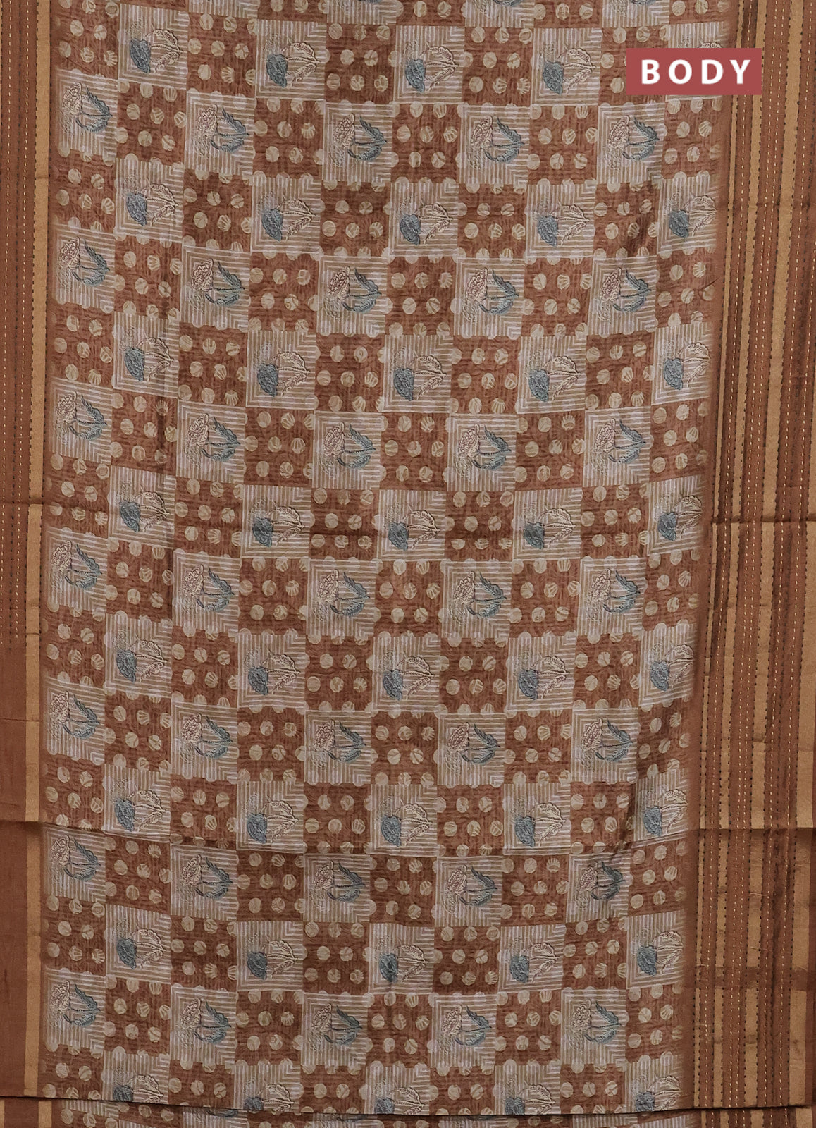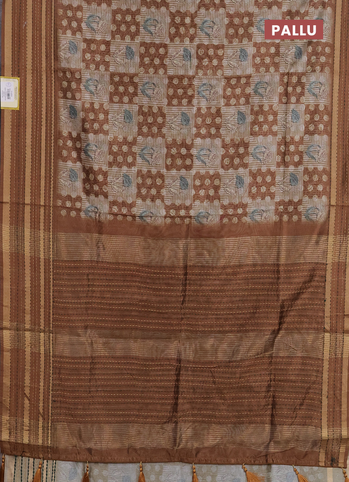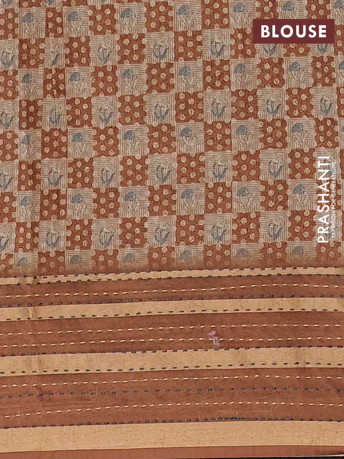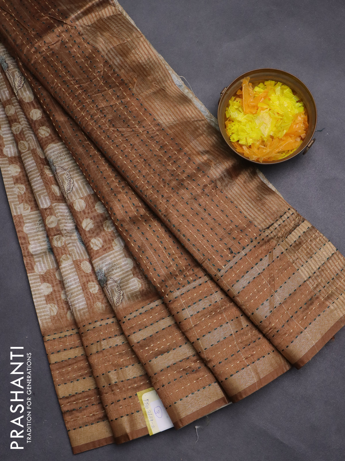 Semi tussar saree sandal and brown with allover dabu prints and kantha stitch work border