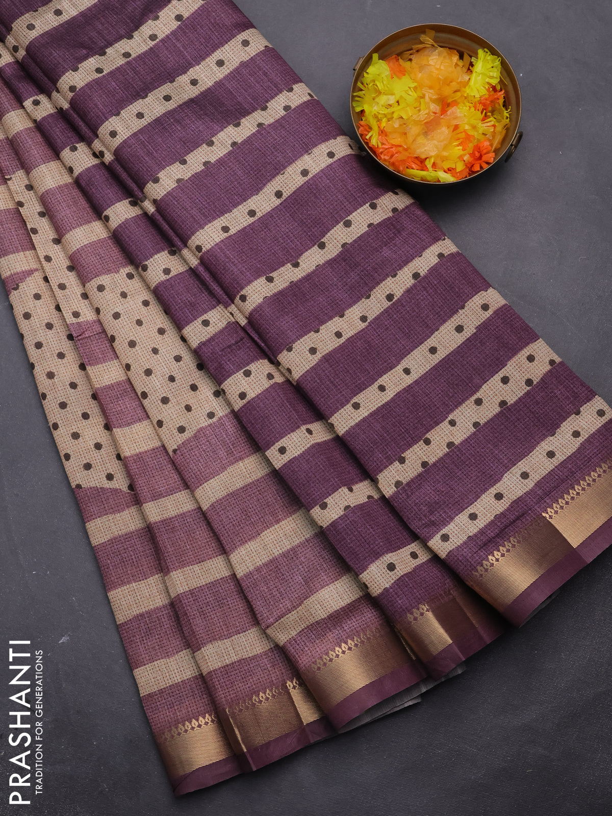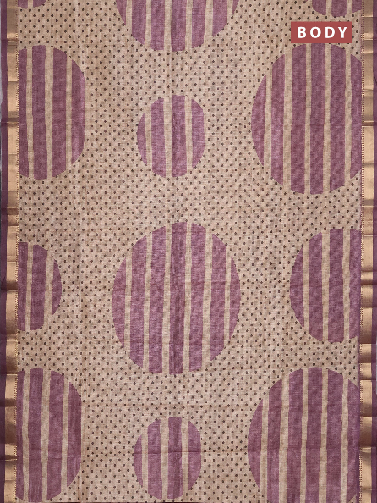 Semi tussar saree sandal and mauve pink with allover prints and zari woven border