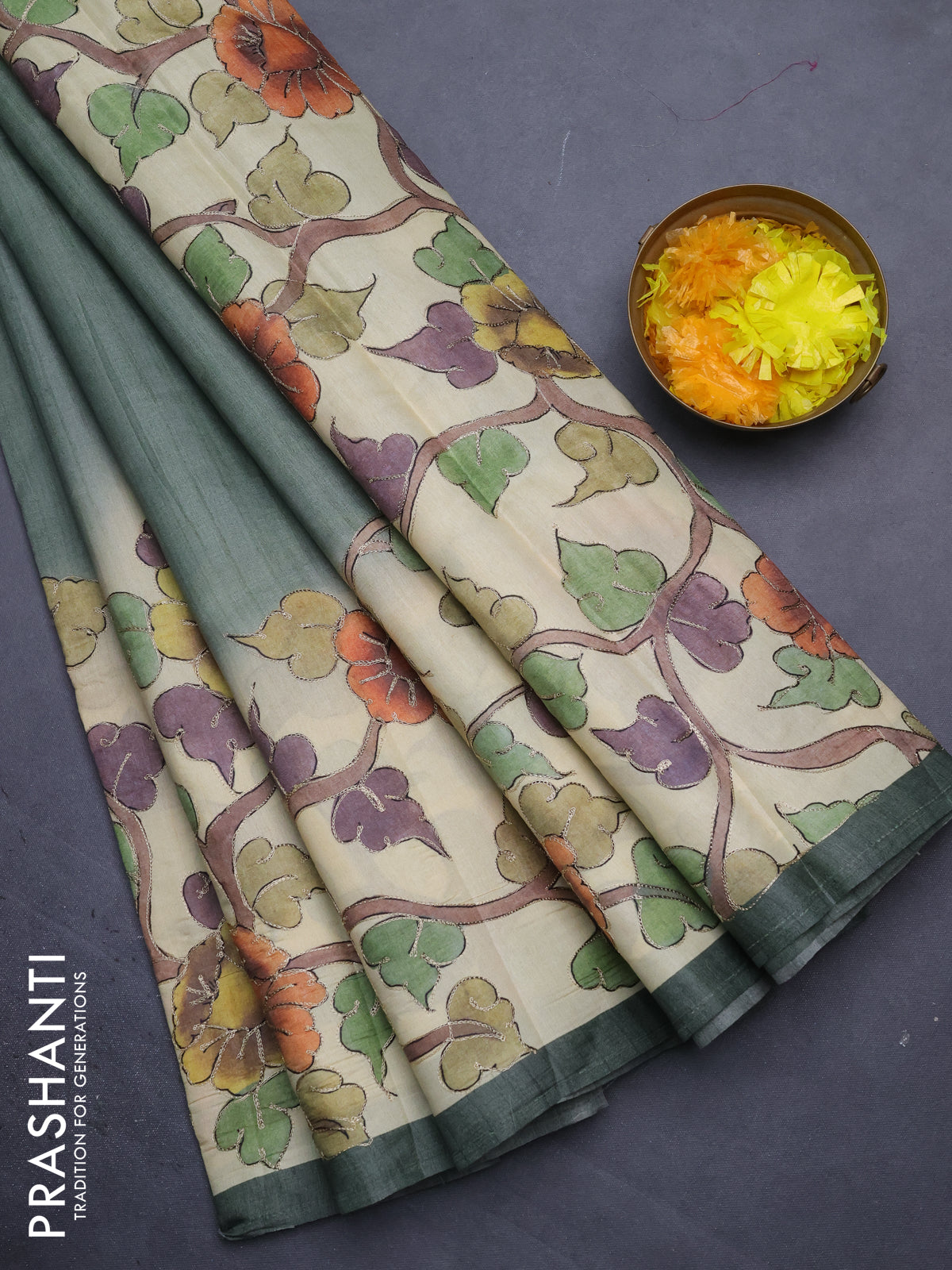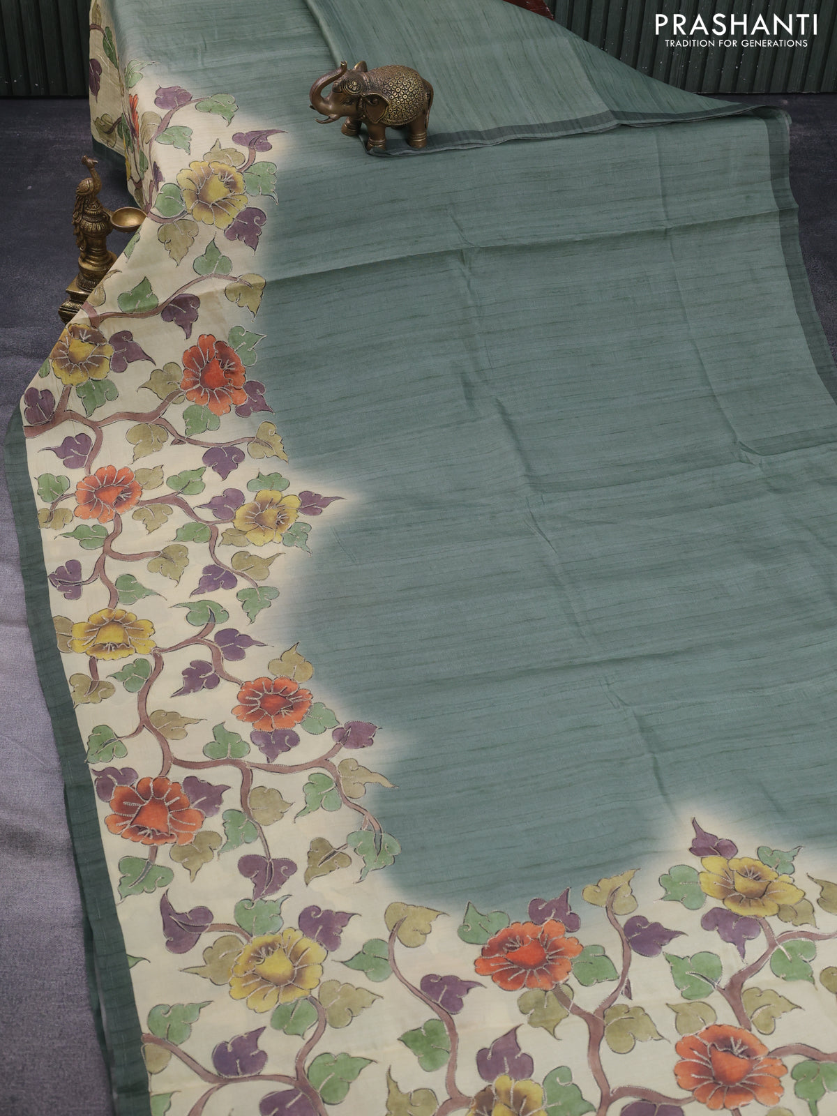 Semi tussar saree sap green shade and cream with plain body and kalamkari prints & pita work border