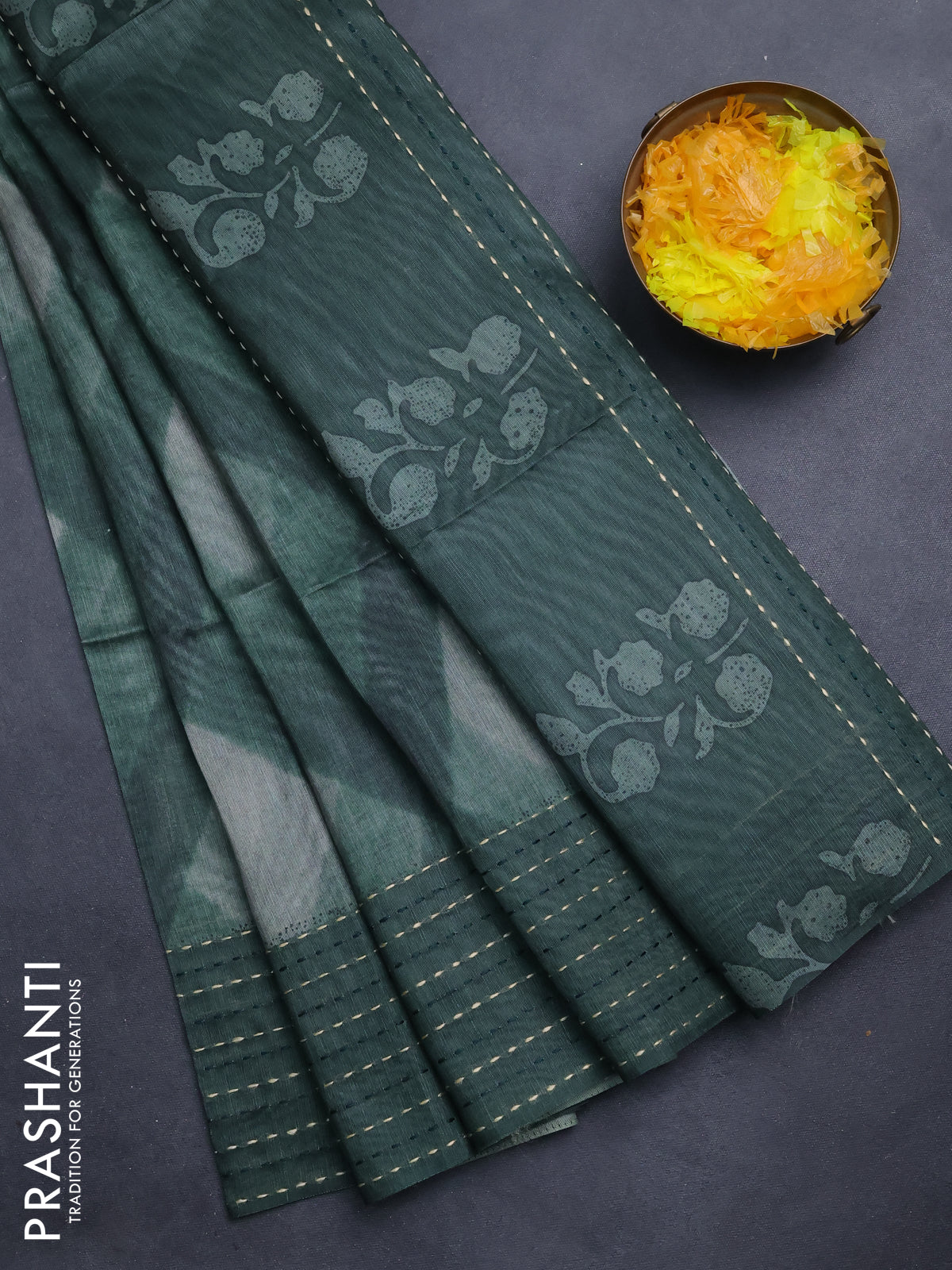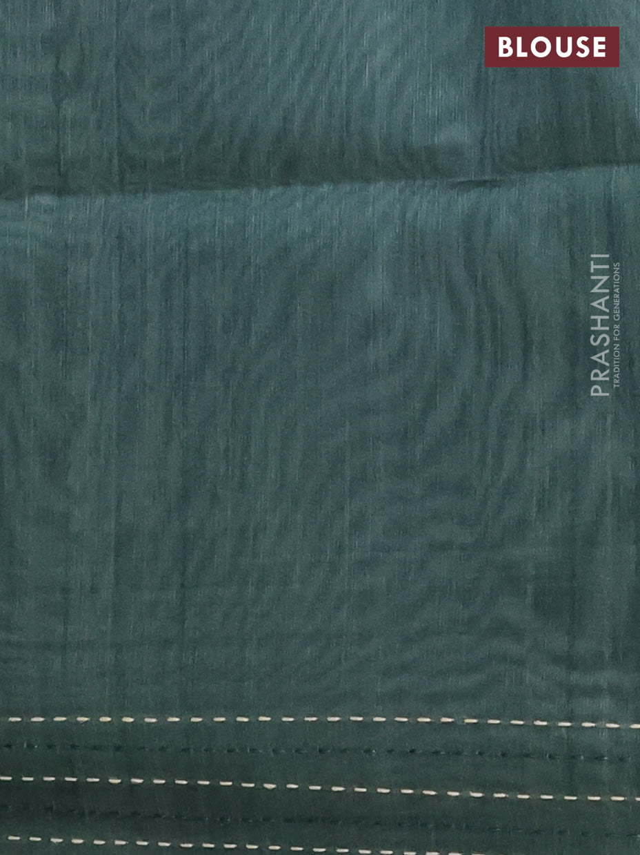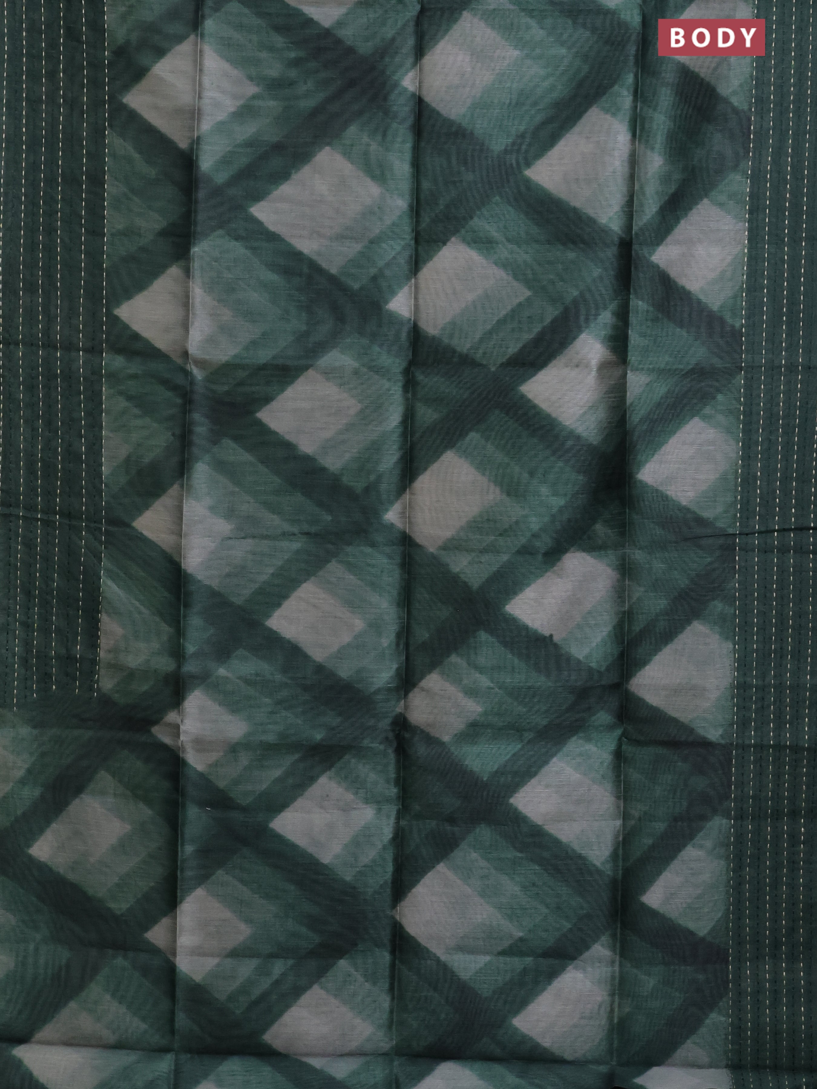 Semi tussar saree sap green with allover geometric prints and katha stitch work pallu & border