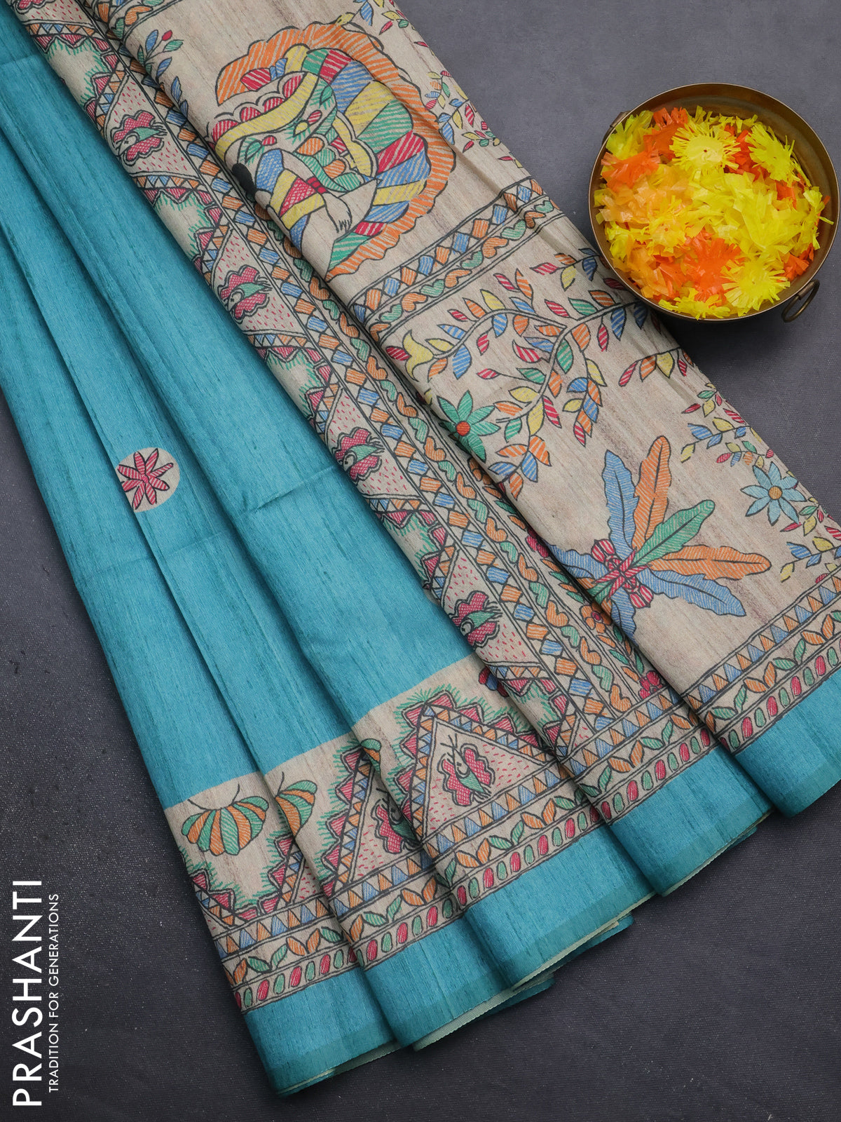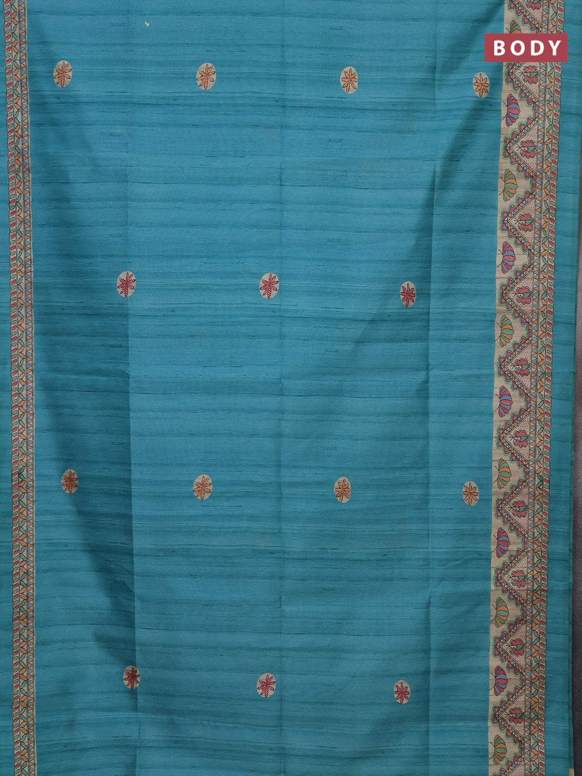 Semi tussar saree teal blue and beige with butta prints and madhubani printed pallu