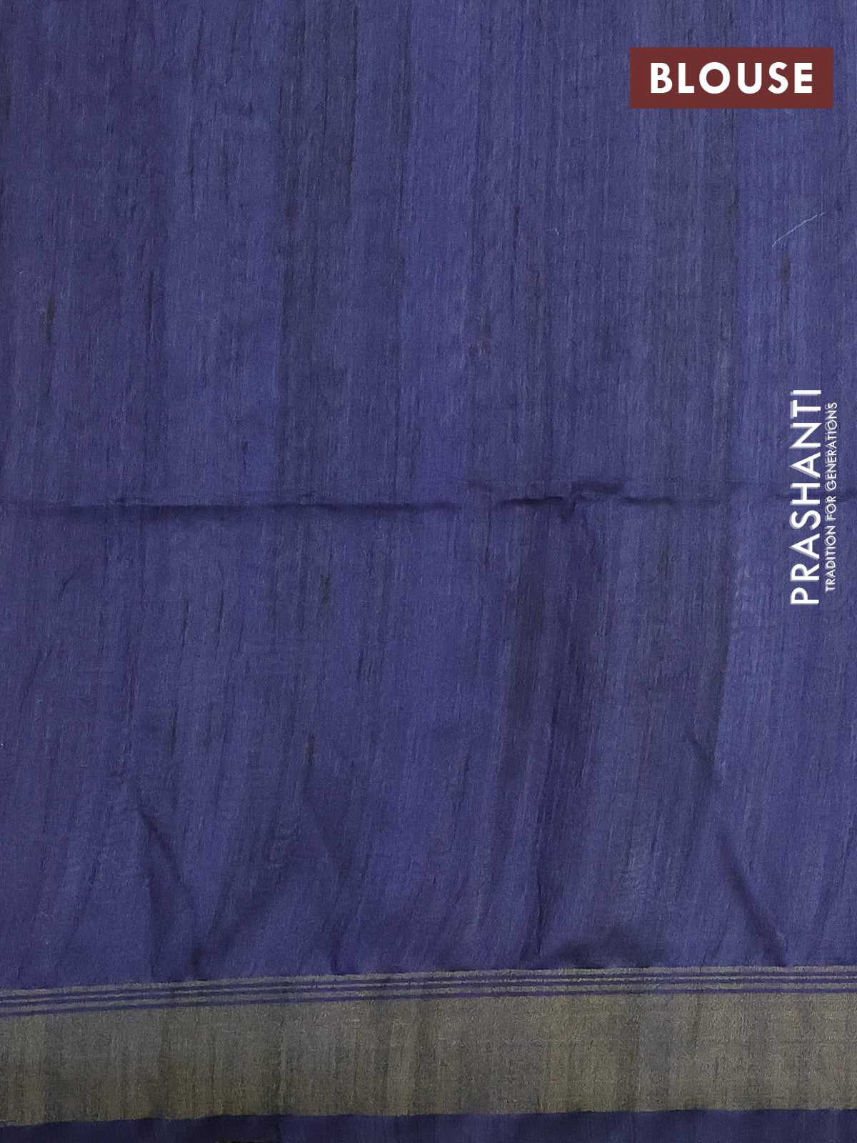 Semi tussar saree teal blue and beige with plain body and madhubani printed pallu