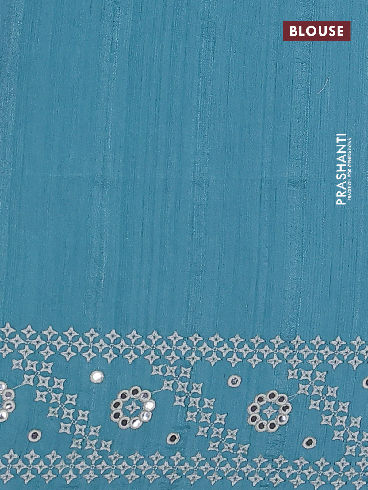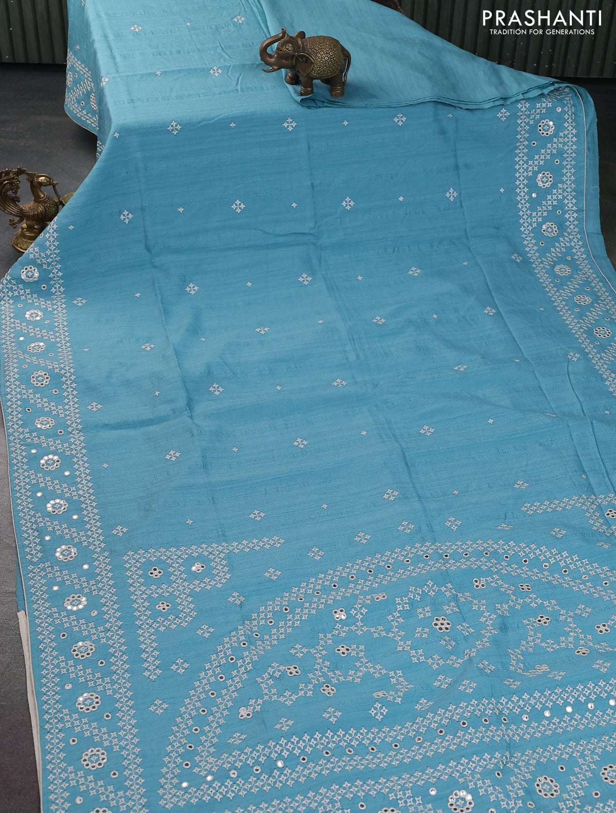 Semi tussar saree teal blue and cream with embroidery work buttas and embroidery mirror work border