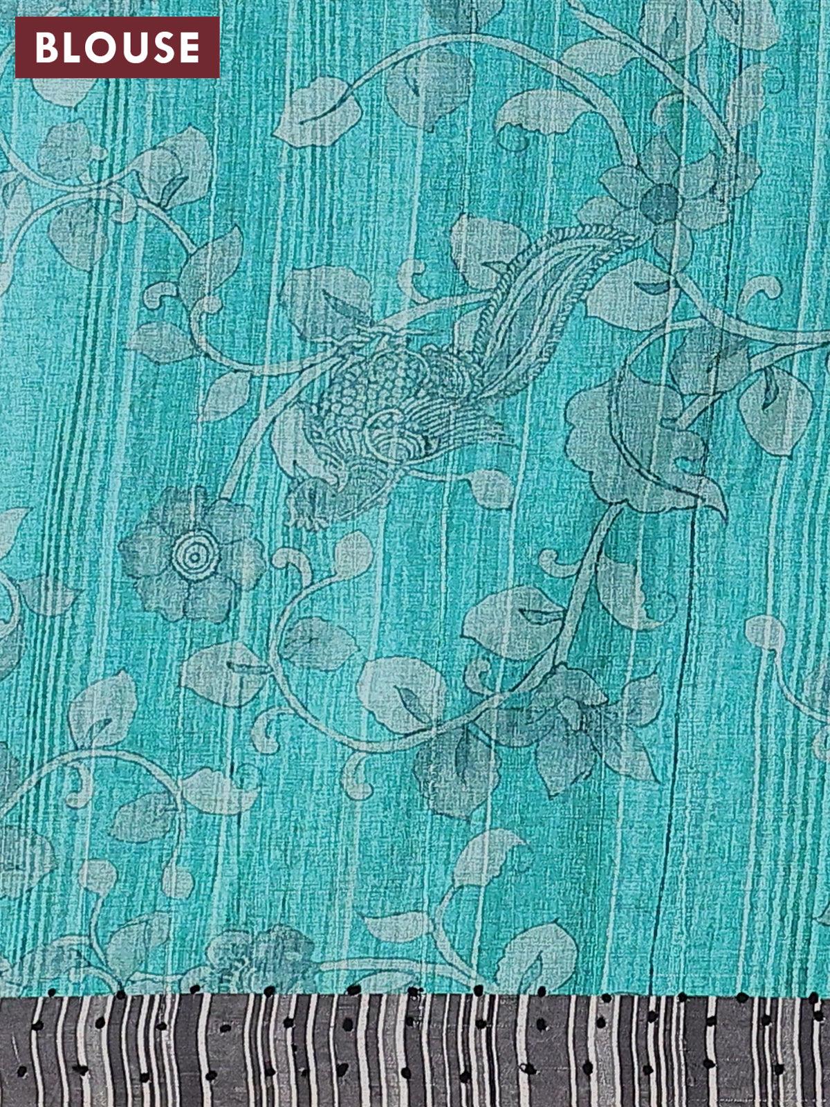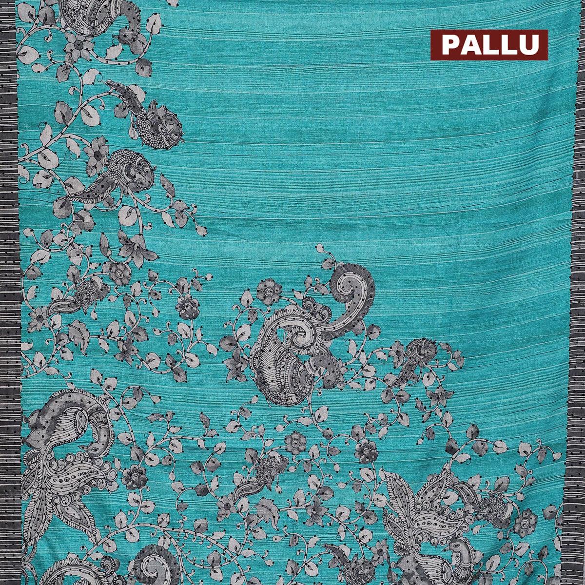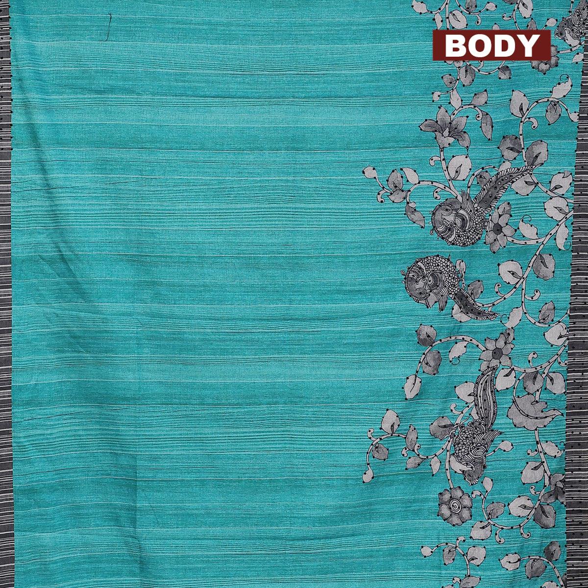 Semi tussar saree teal blue and grey with kalamkari prints & french knot work and simple border