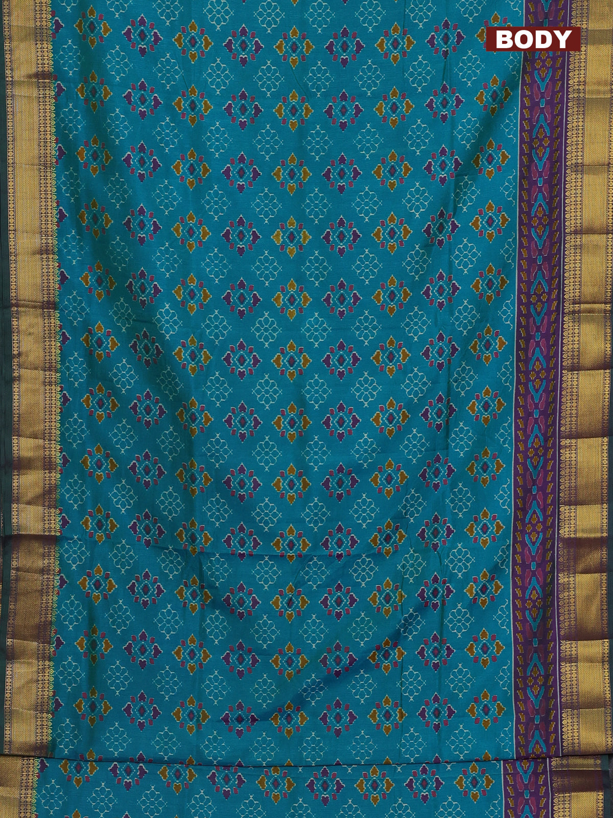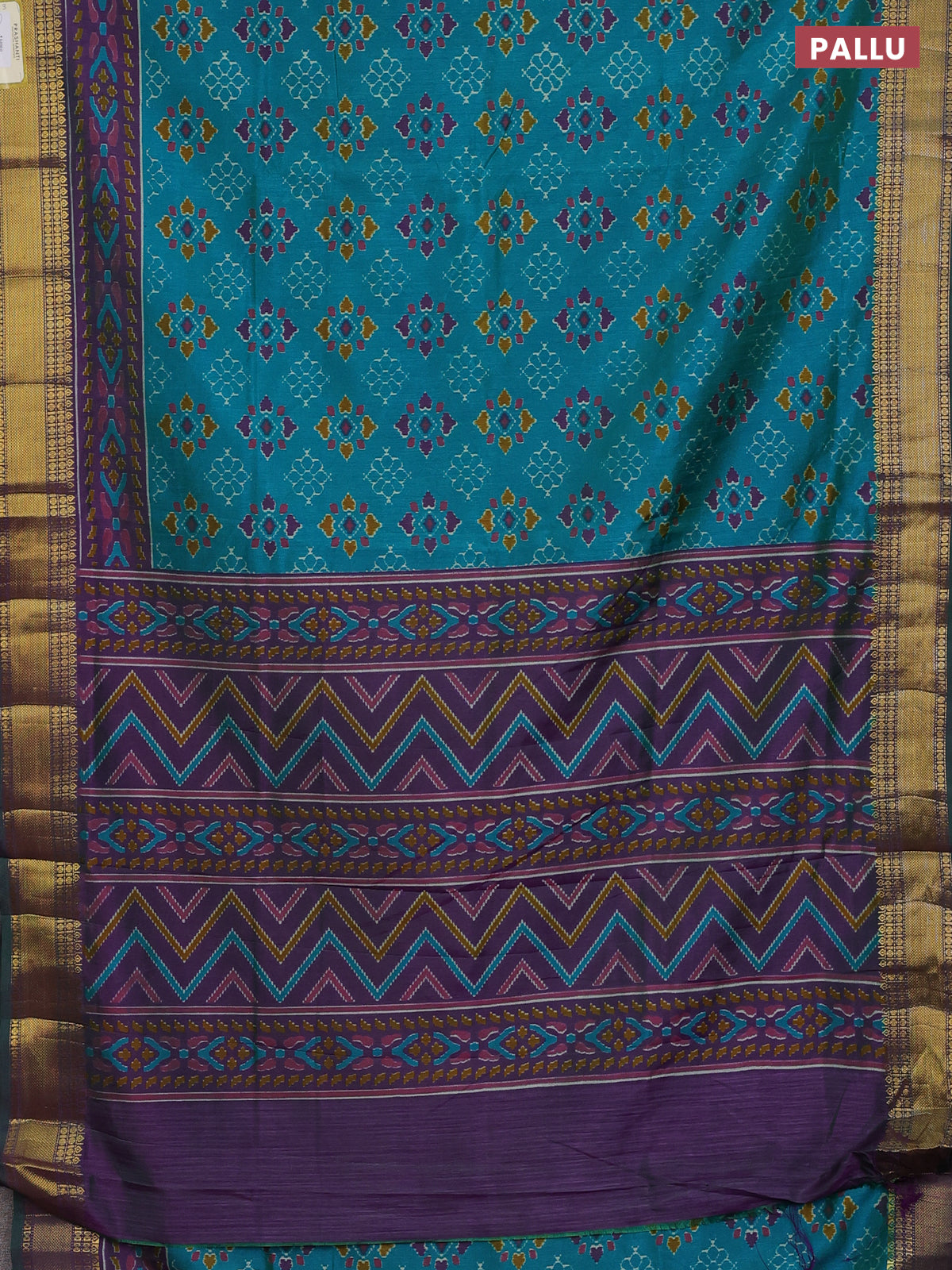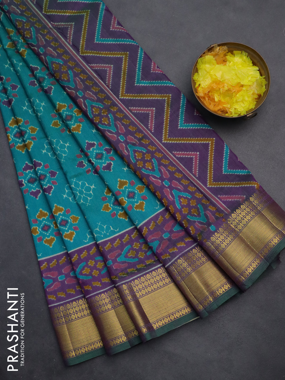 Semi tussar saree teal blue and purple with allover ikat prints and zari woven border