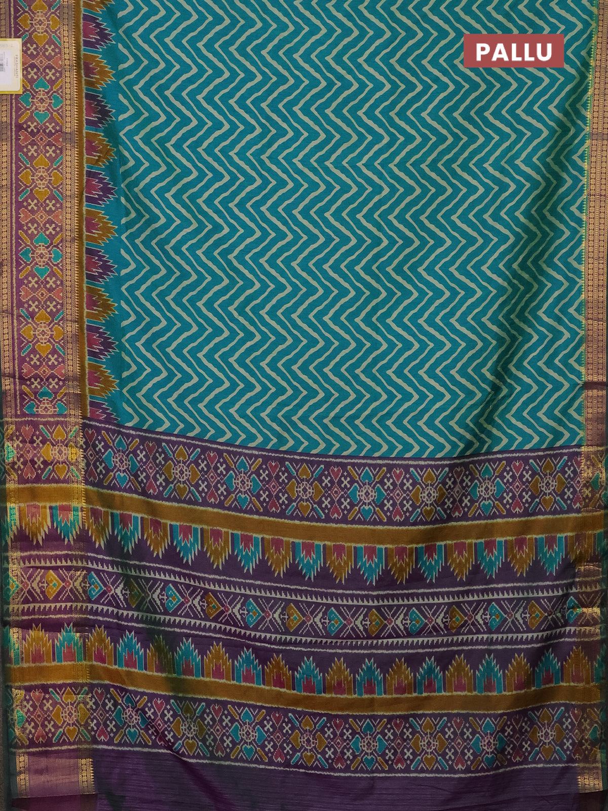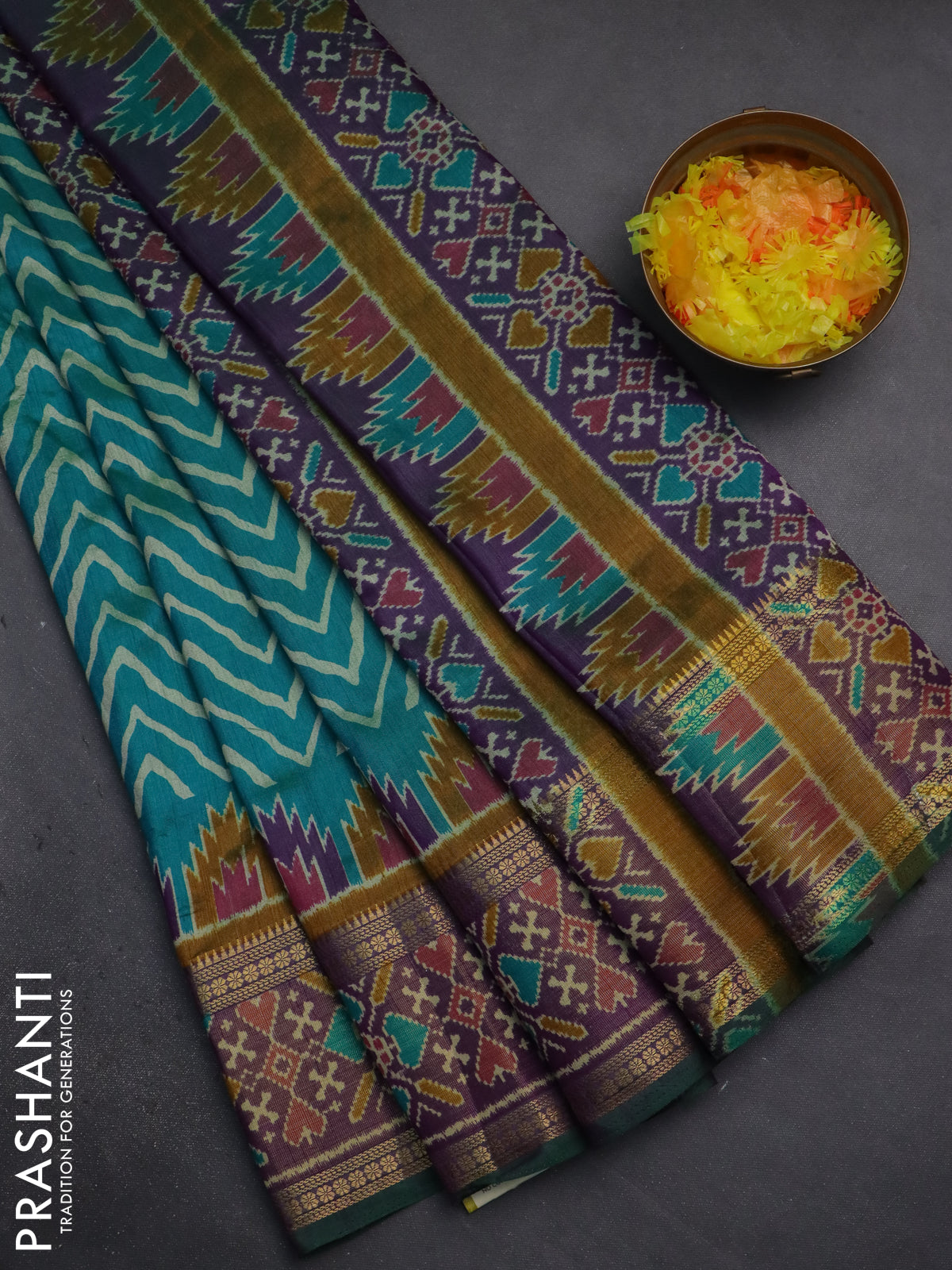 Semi tussar saree teal green and purple with allover zig zag prints and zari woven ikat border