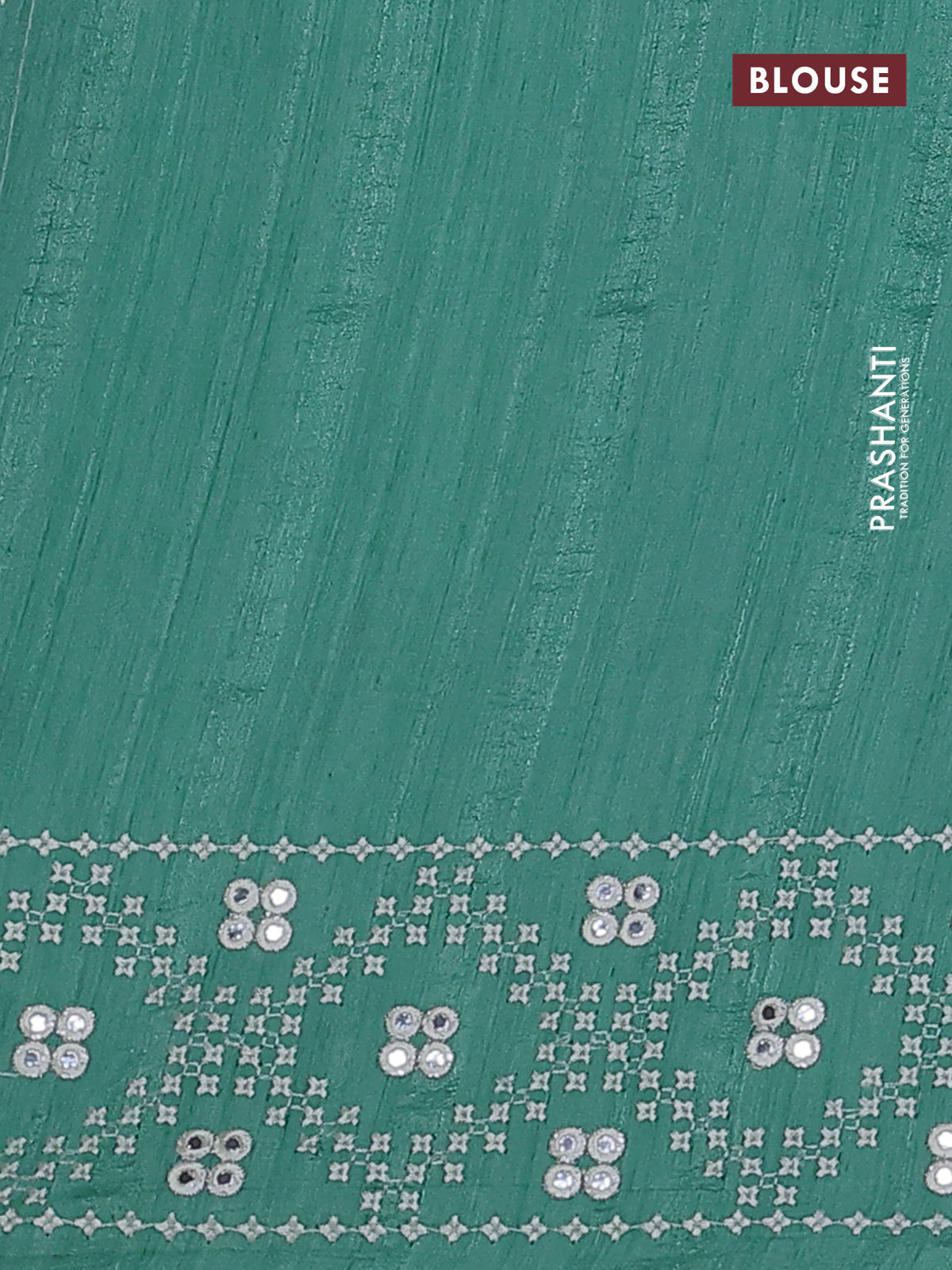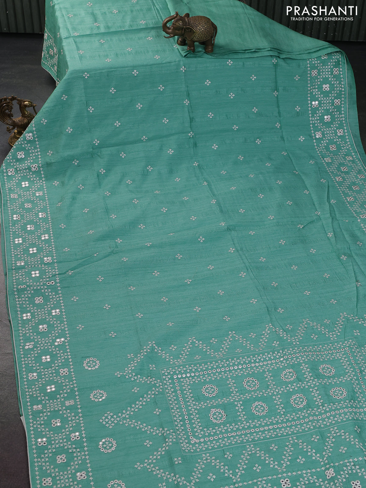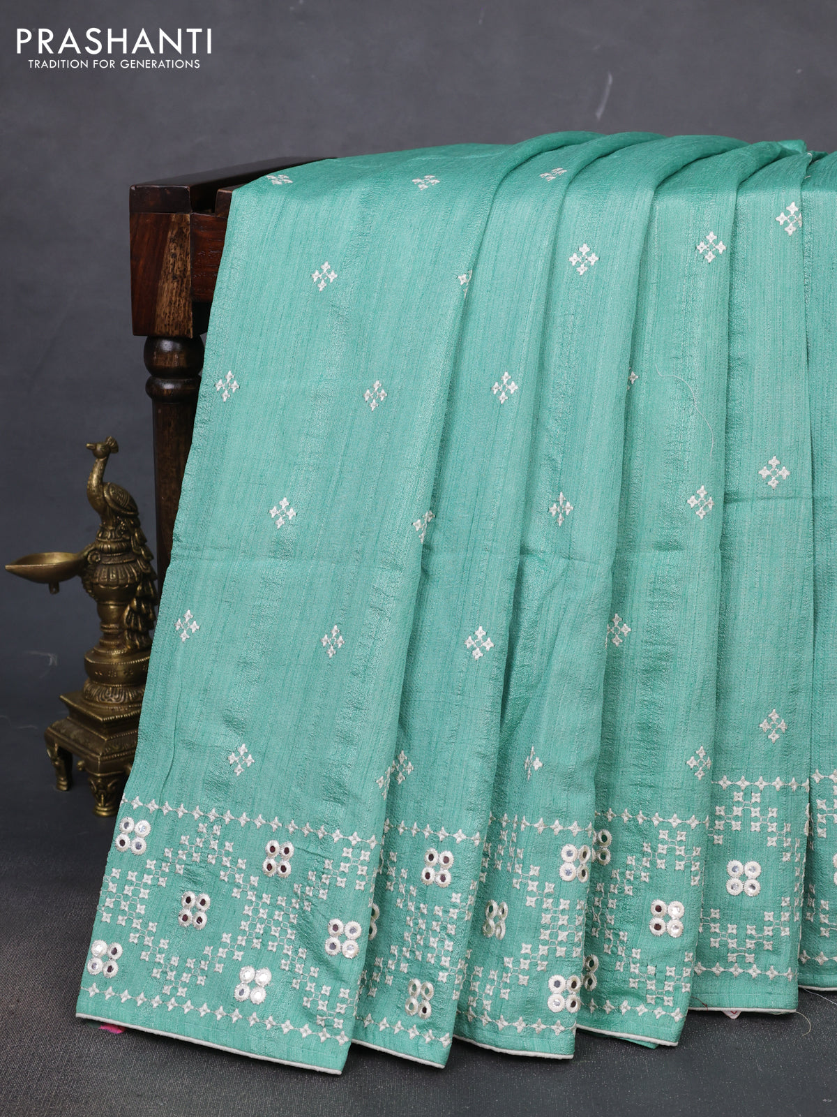 Semi tussar saree teal green shade and cream with embroidery work buttas and embroidery mirror work border