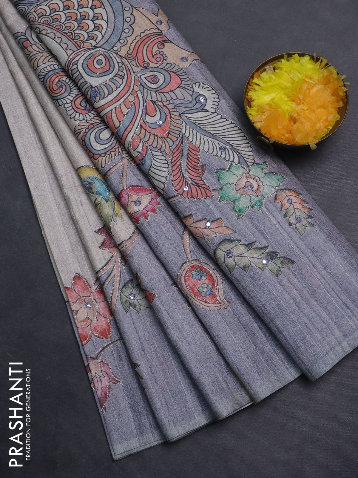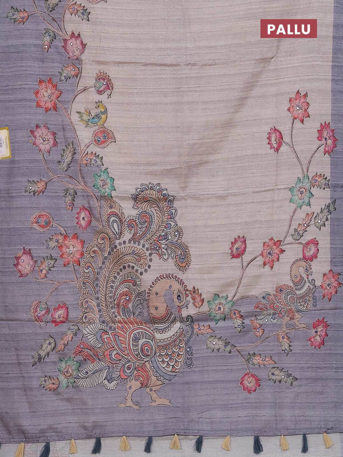 Semi tussar silk saree beige and grey shade with plain body and kalamkari prints & pita work