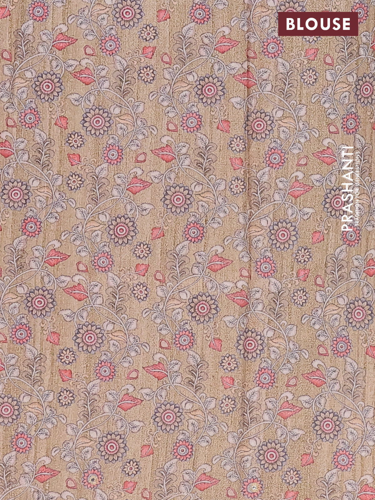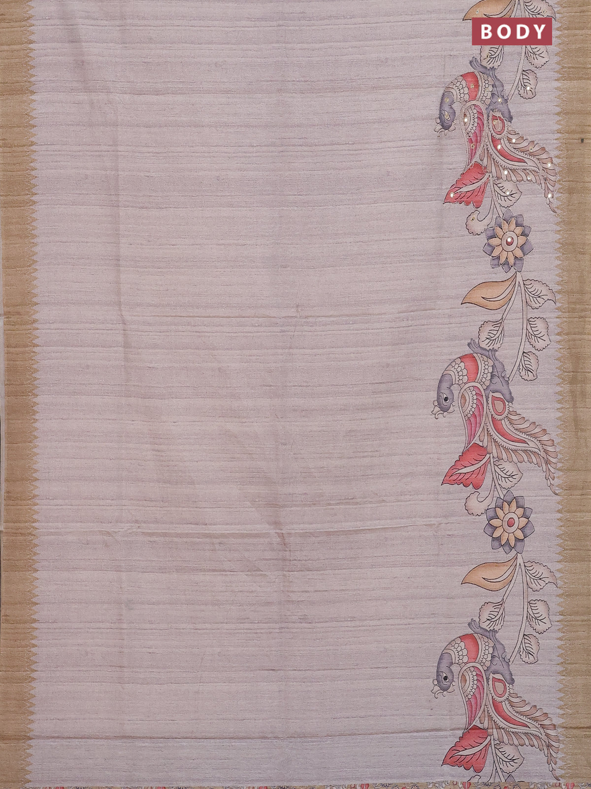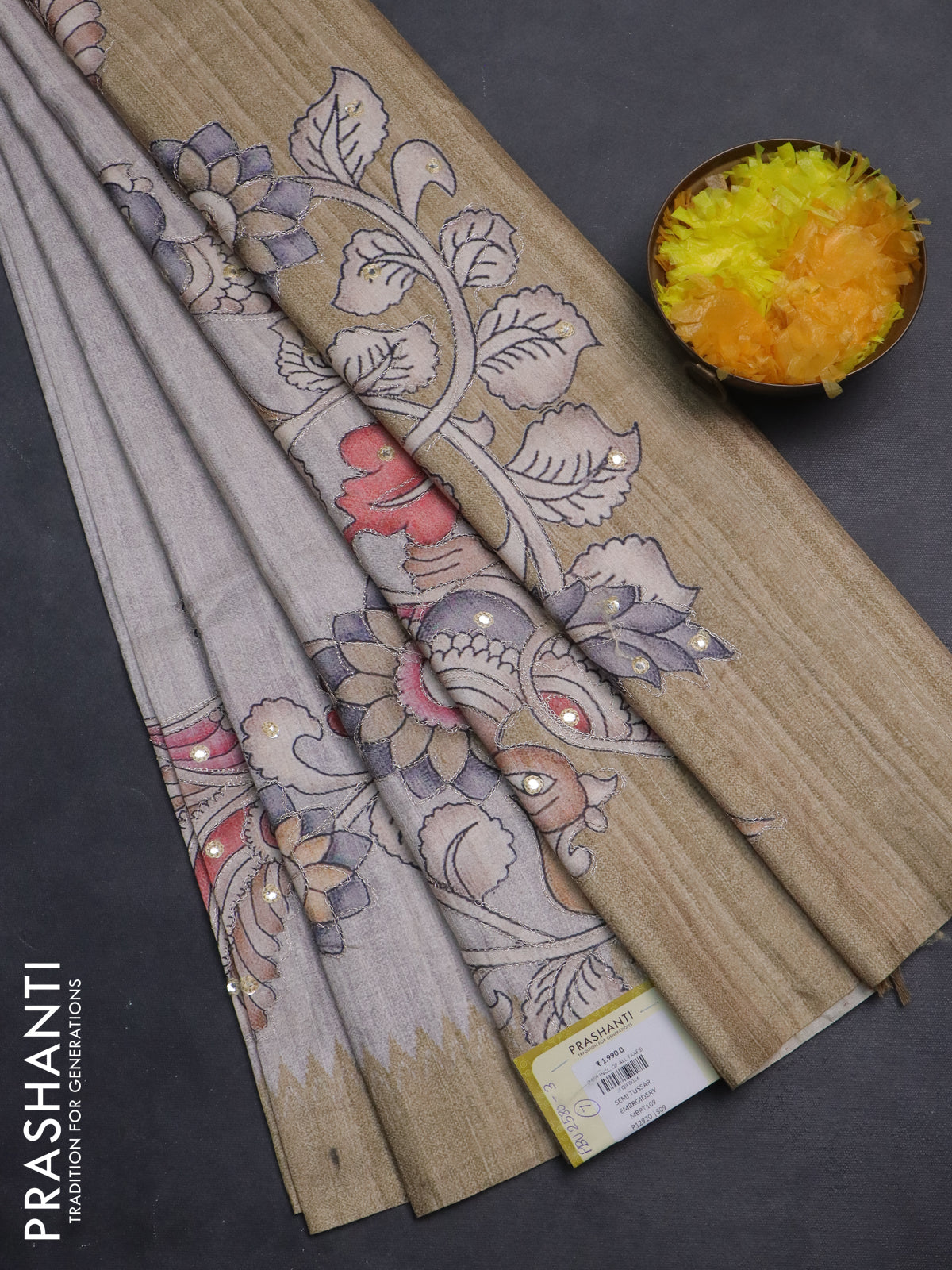 Semi tussar silk saree grey shade and sandal with plain body and kalamkari prints & pita work