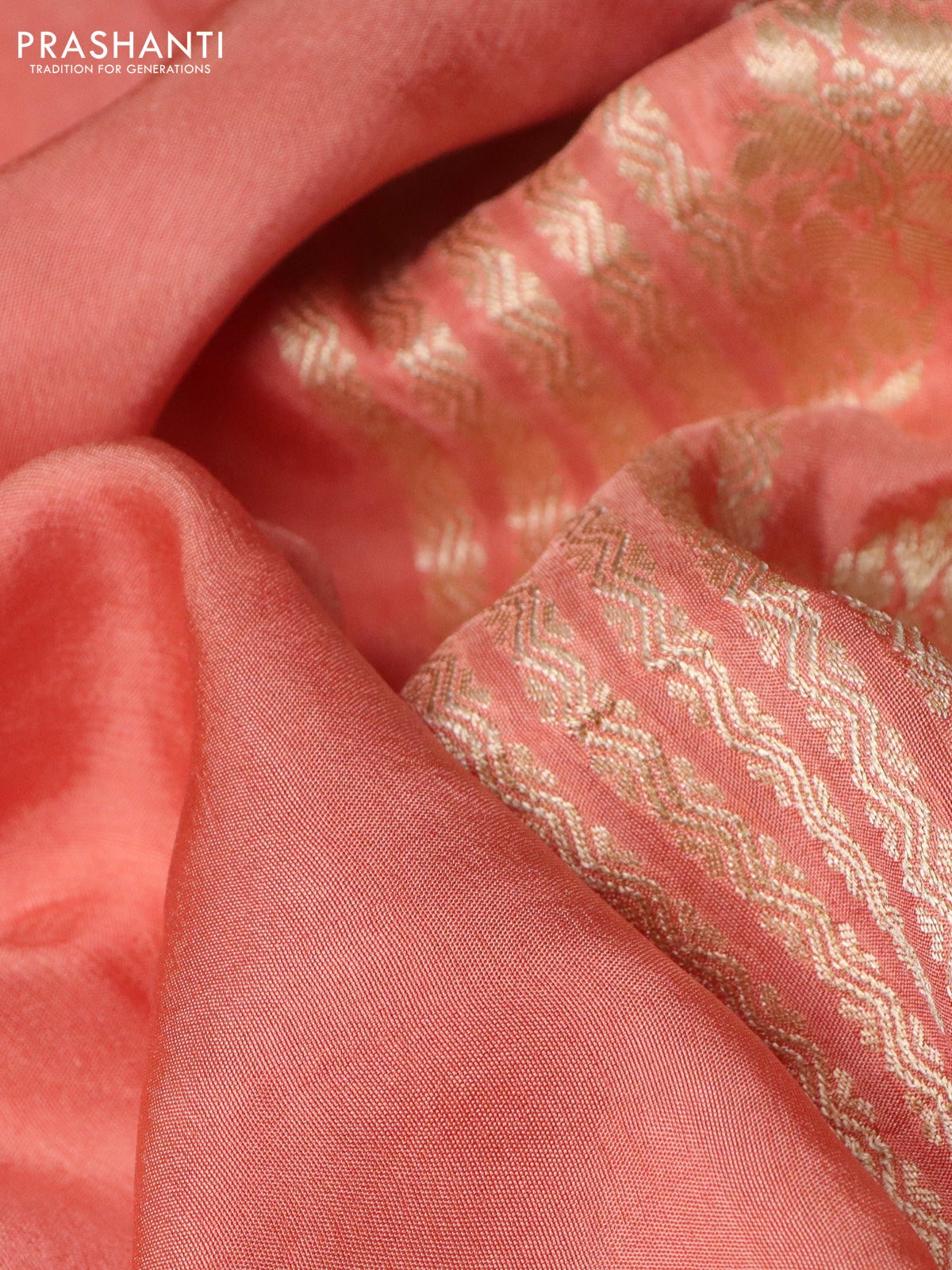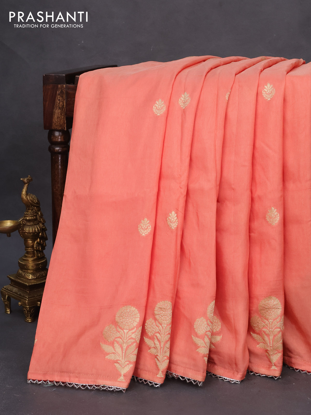 Semi tussar silk saree peach orange and red with thread & zari woven buttas and woven buttas & beaded work border