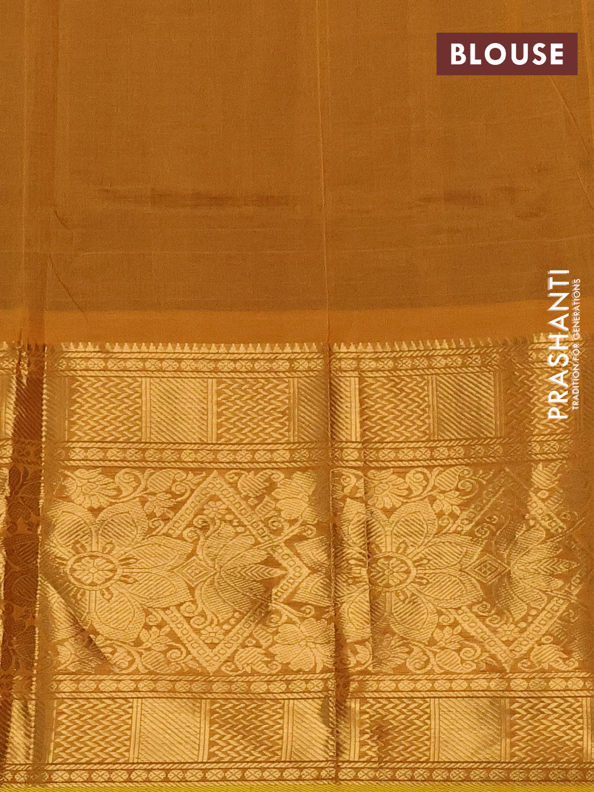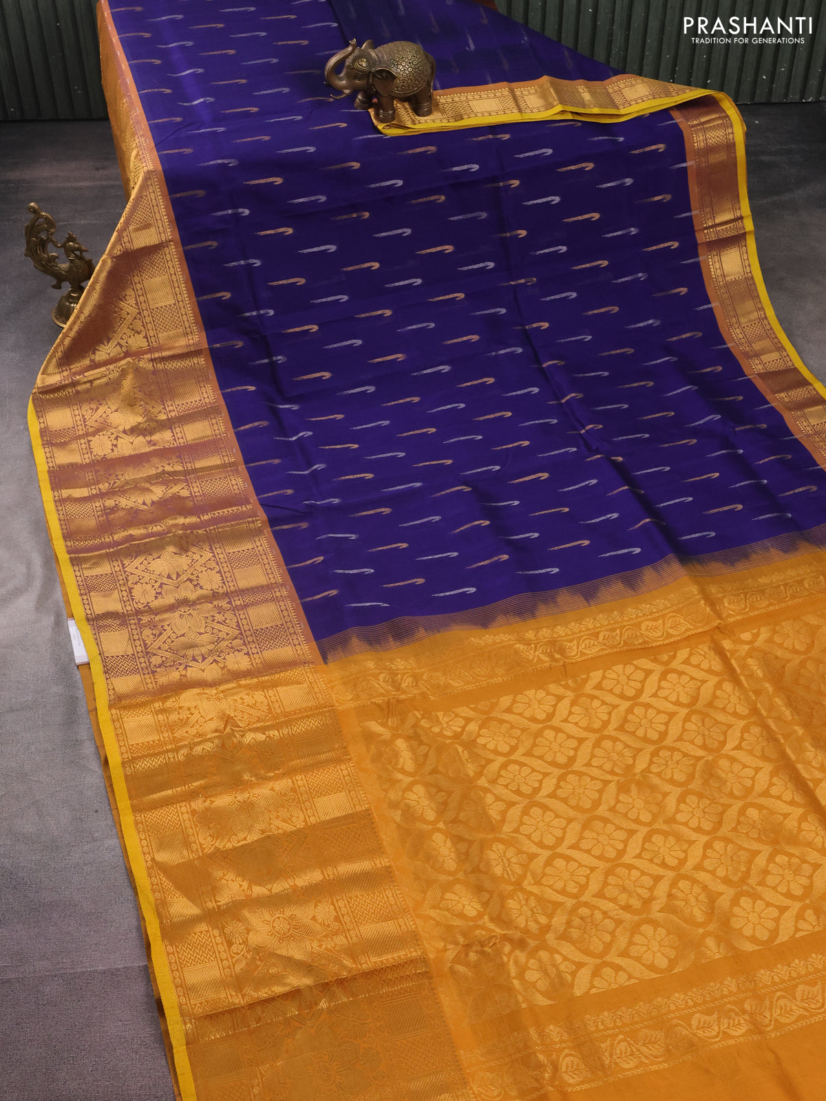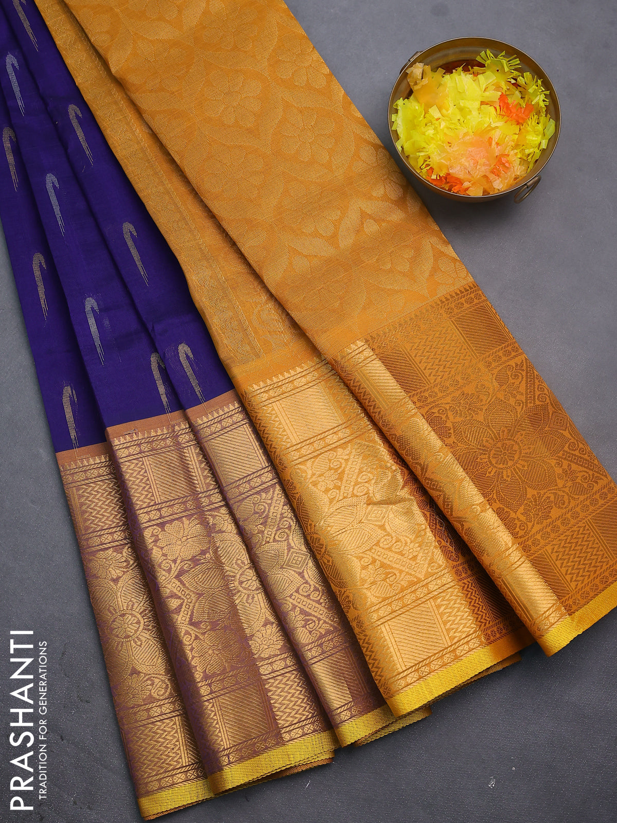 Silk cotton saree blue and mustard yellow with silver & gold zari woven muniya buttas and long zari woven border