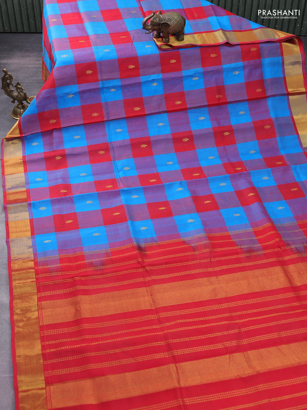 Silk cotton saree cs blue and red with allover paalum pazhamum checks & buttas and zari woven border