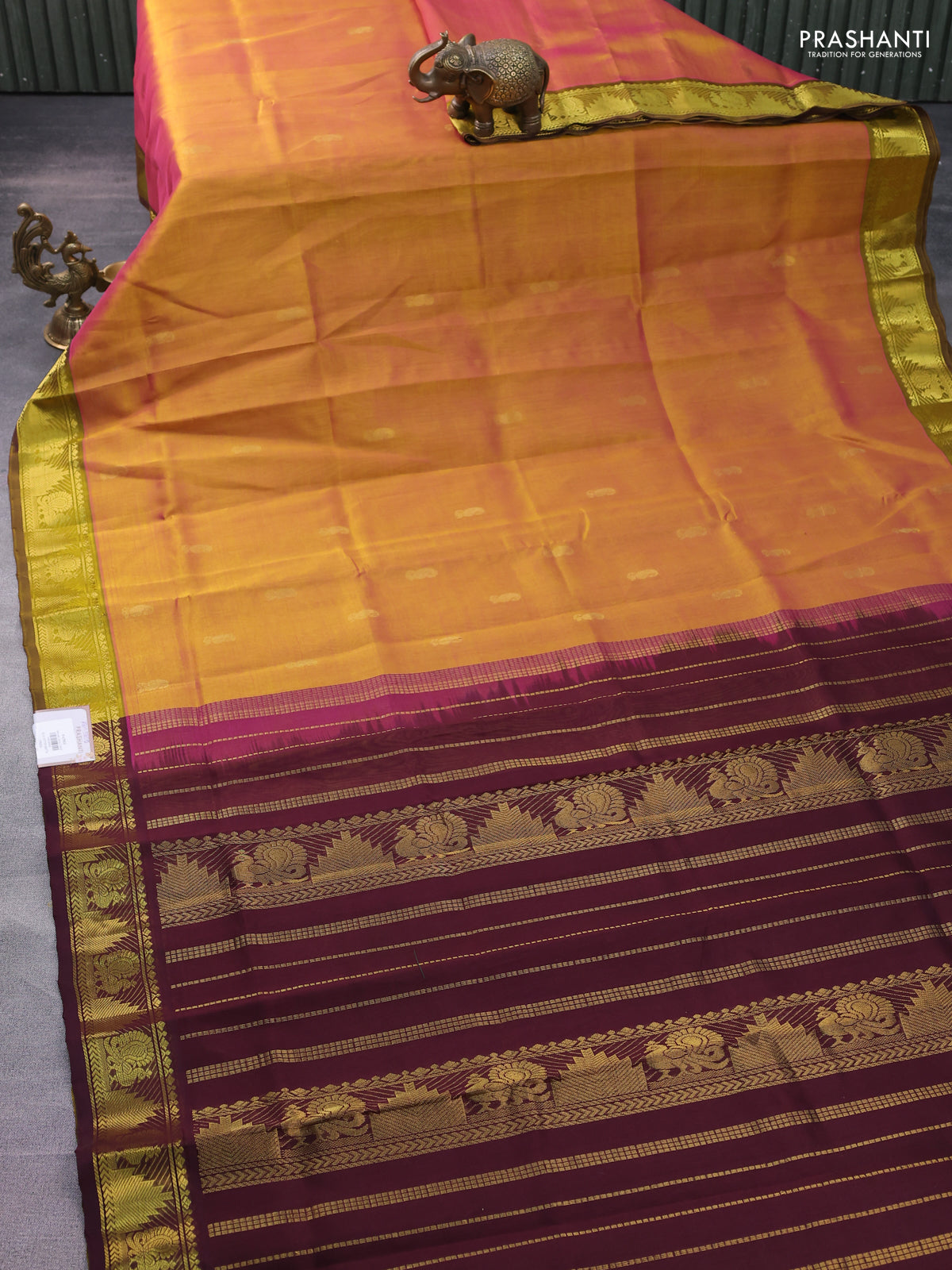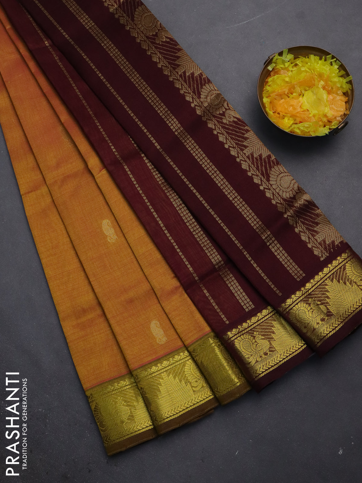 Silk cotton saree dual shade of mustard yellow and deep maroon with paisley zari woven buttas and zari woven border