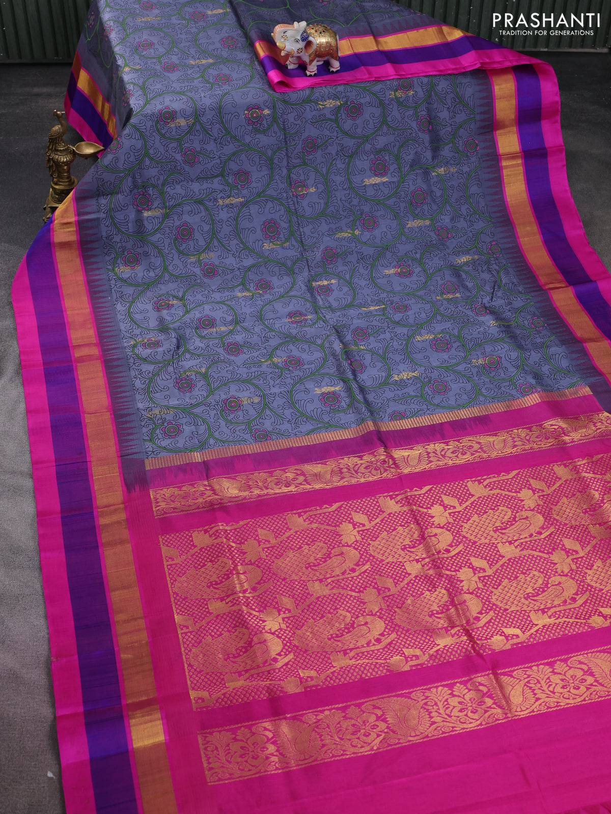 Silk cotton saree grey and pink with allover kalamkari prints and temple design zari woven simple border