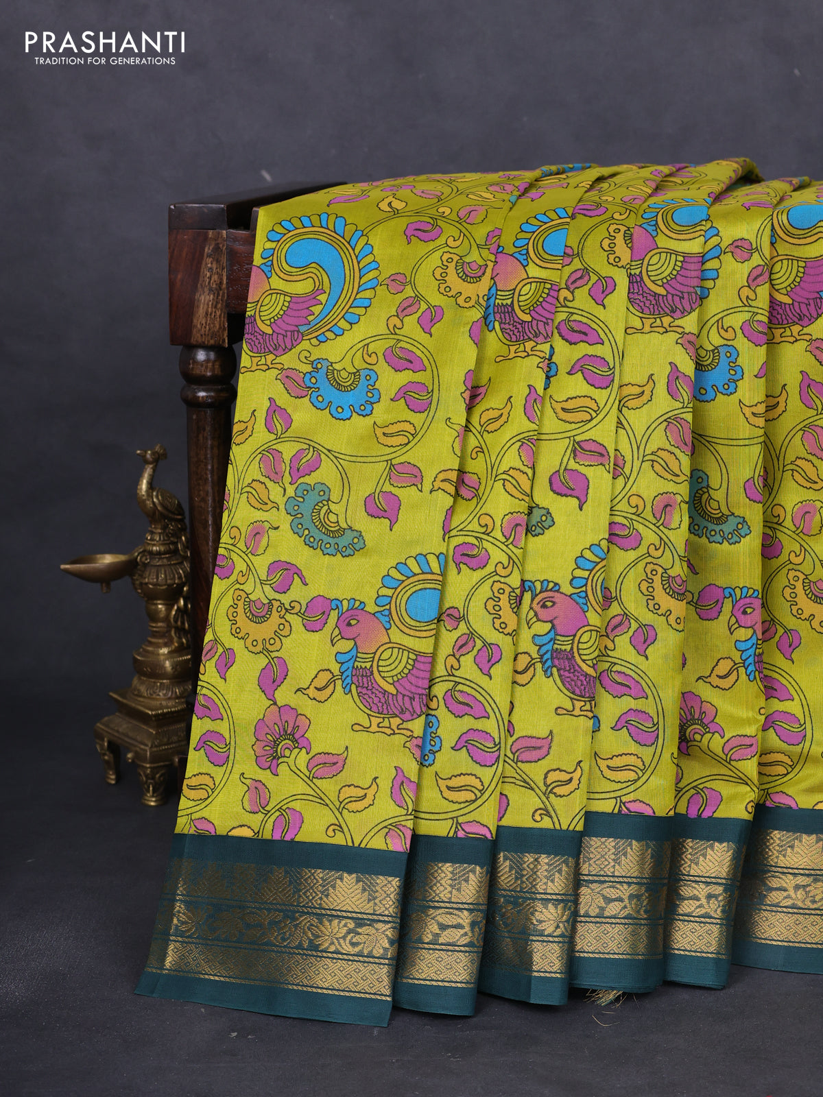 Silk cotton saree lime yellow and green with allover kalamkari prints and zari woven korvai border