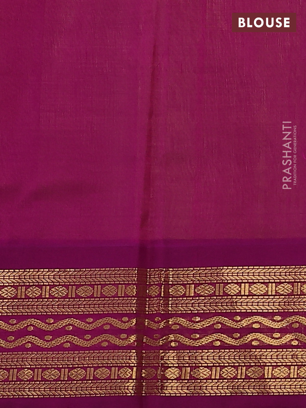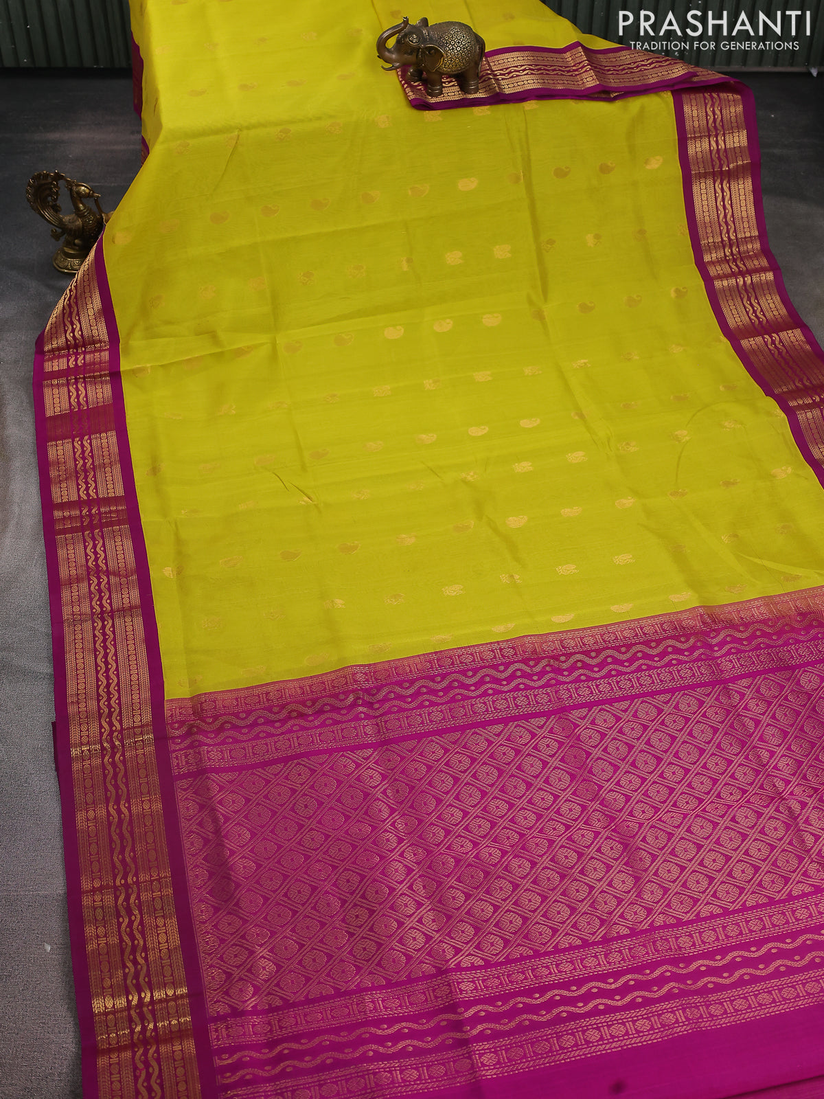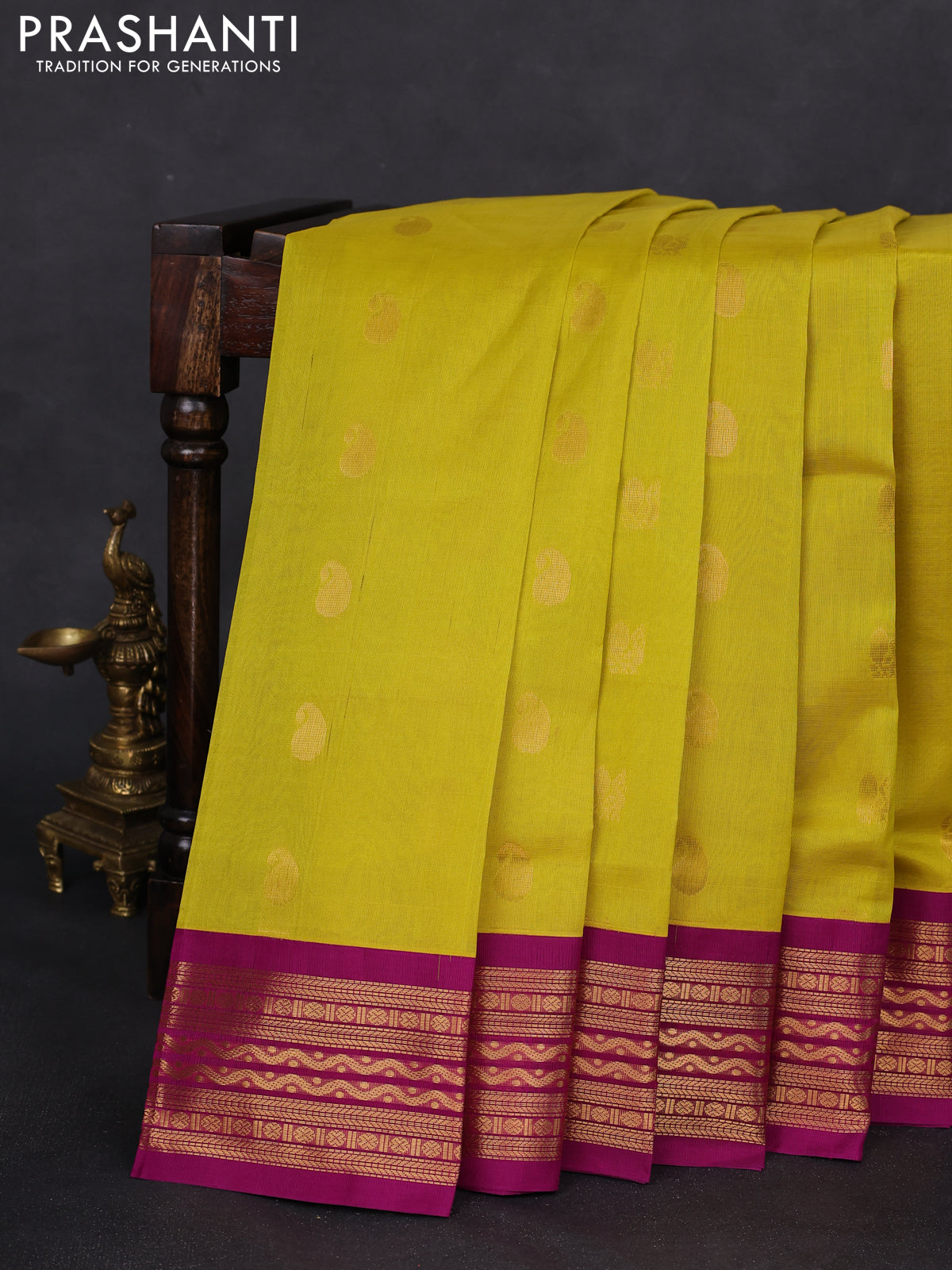 Silk cotton saree lime yellow and purple with paisley & annam zari woven buttas and zari woven korvai border