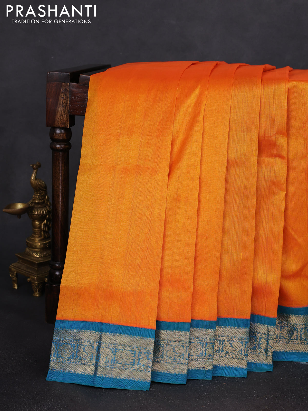 Silk cotton saree mango yellow and dual shade of teal blue with plain body and zari woven korvai border