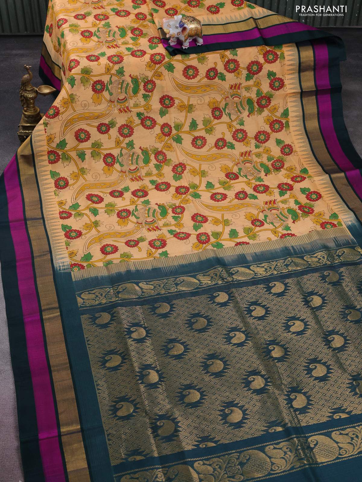Silk cotton saree pale orange and peacock green with allover kalamkari prints and temple design zari woven simple border