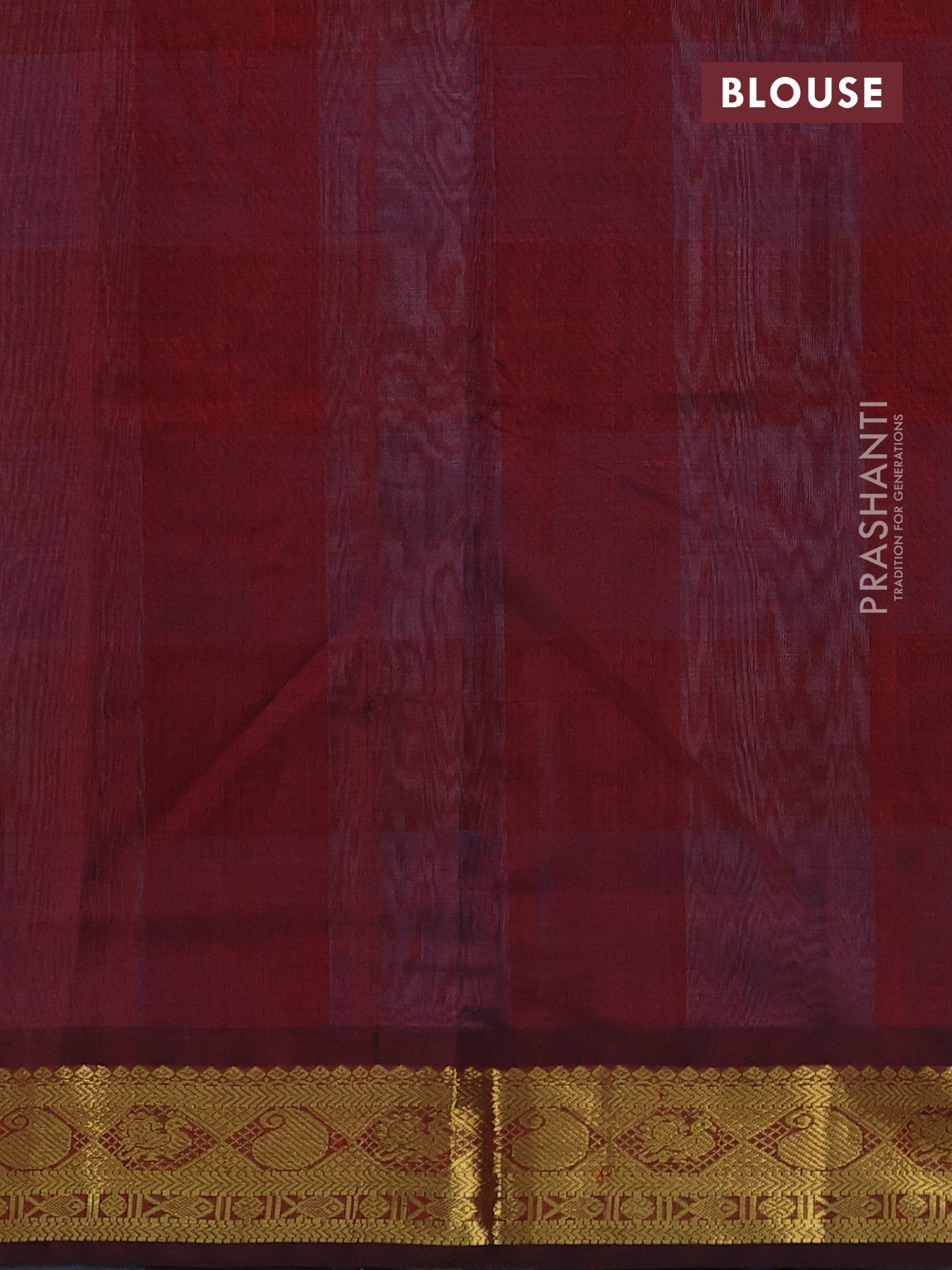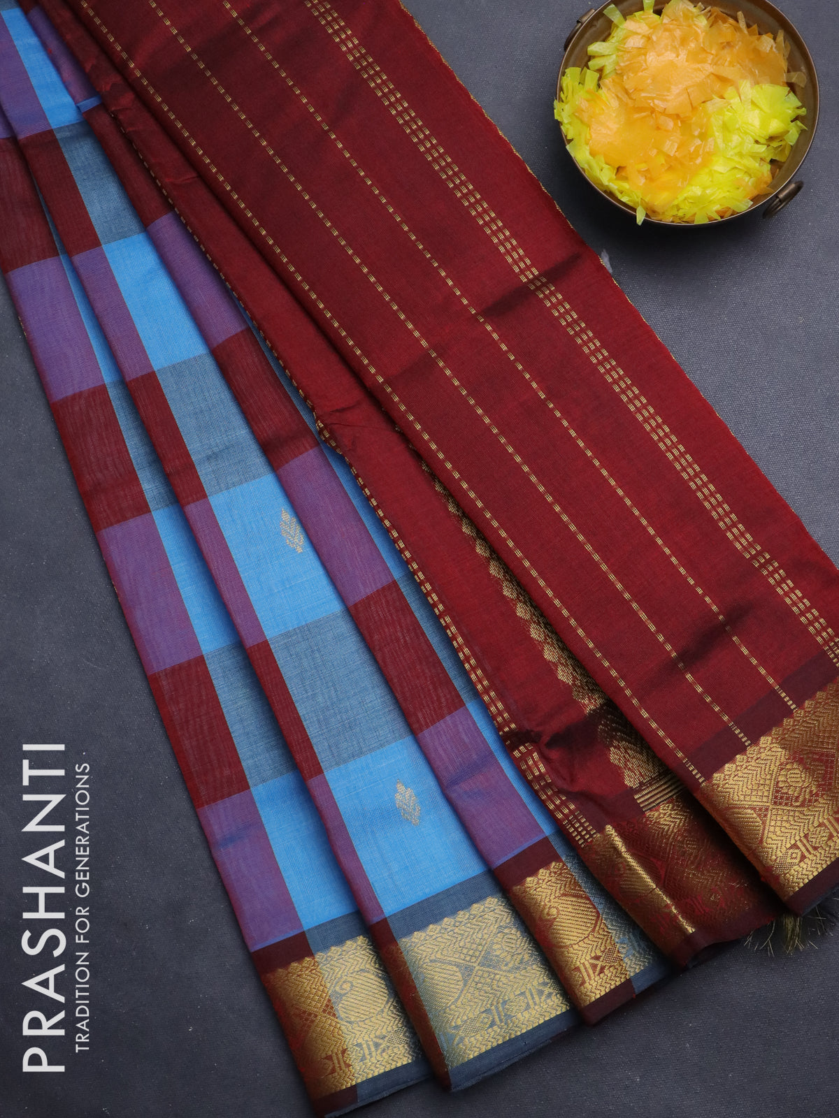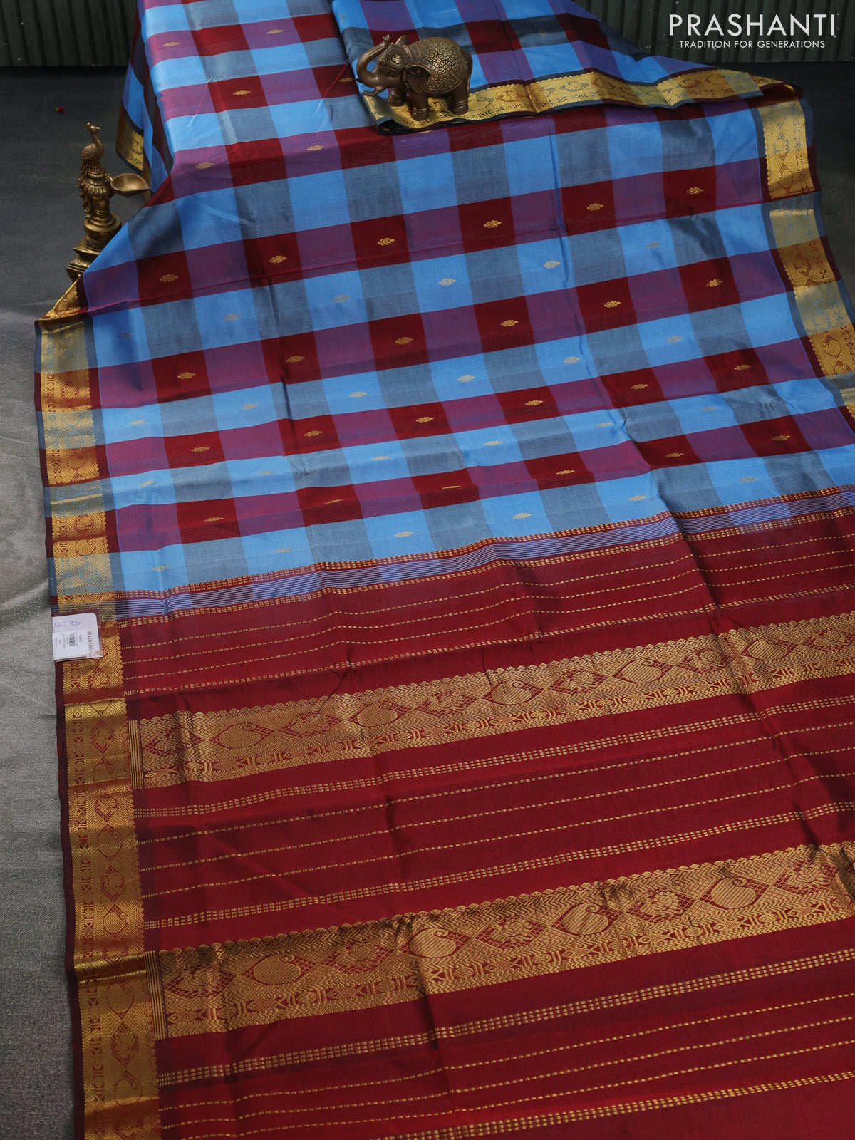 Silk cotton saree pastel blue and maroon with allover paalum pazhamum checks & zari buttas and zari woven border