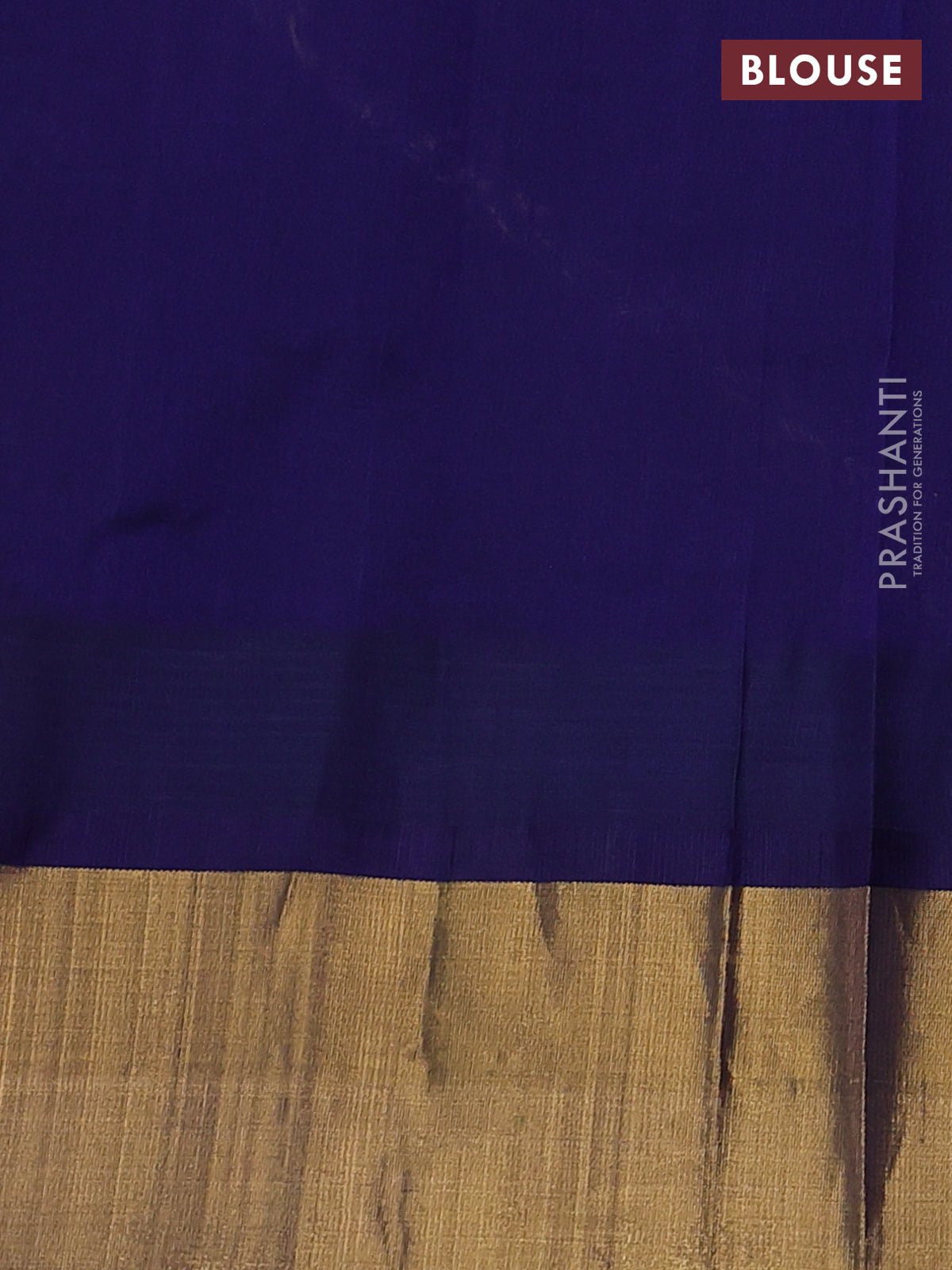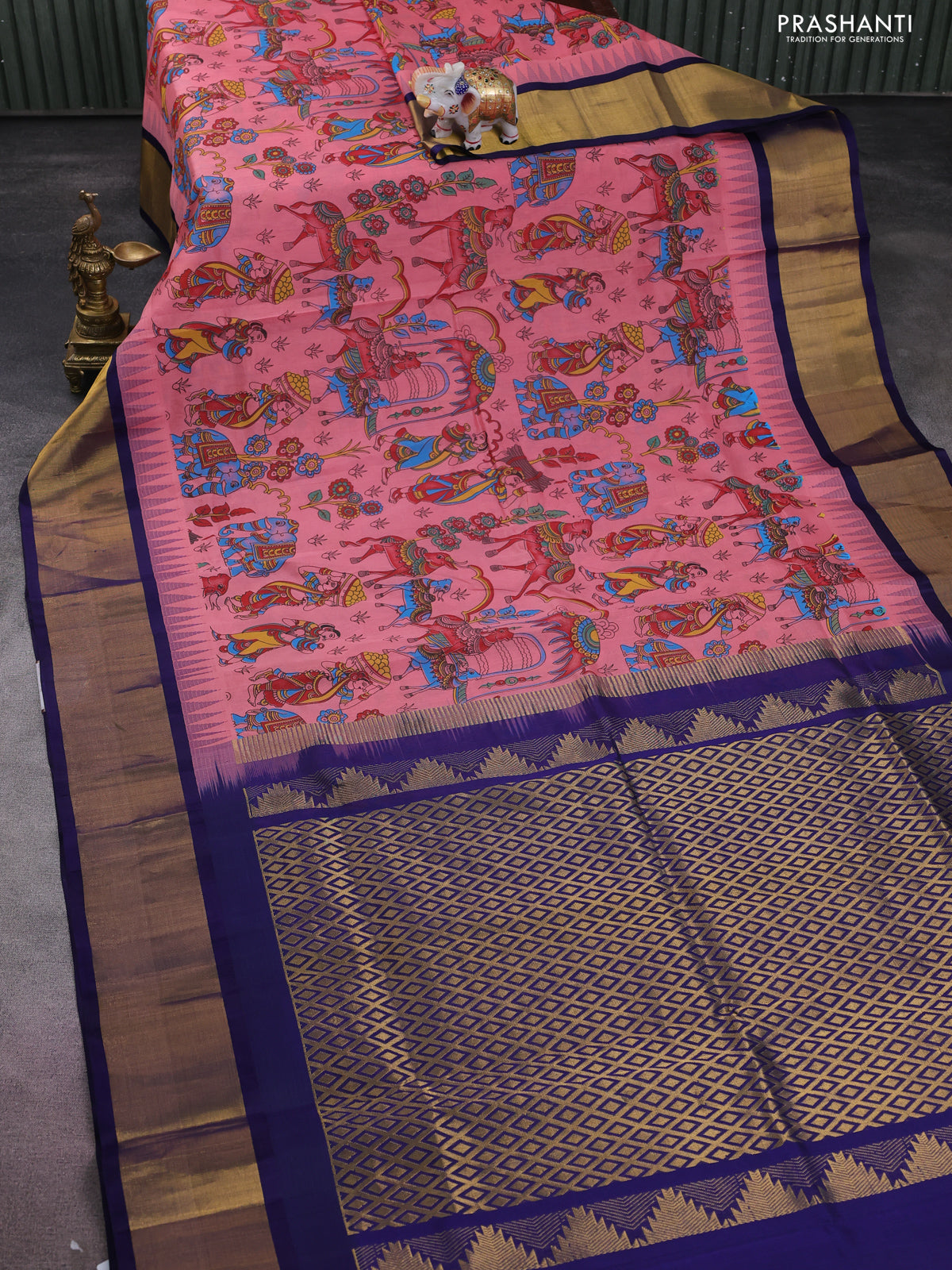 Silk cotton saree peach pink and dark blue with allover kalamkari prints and temple design zari woven border