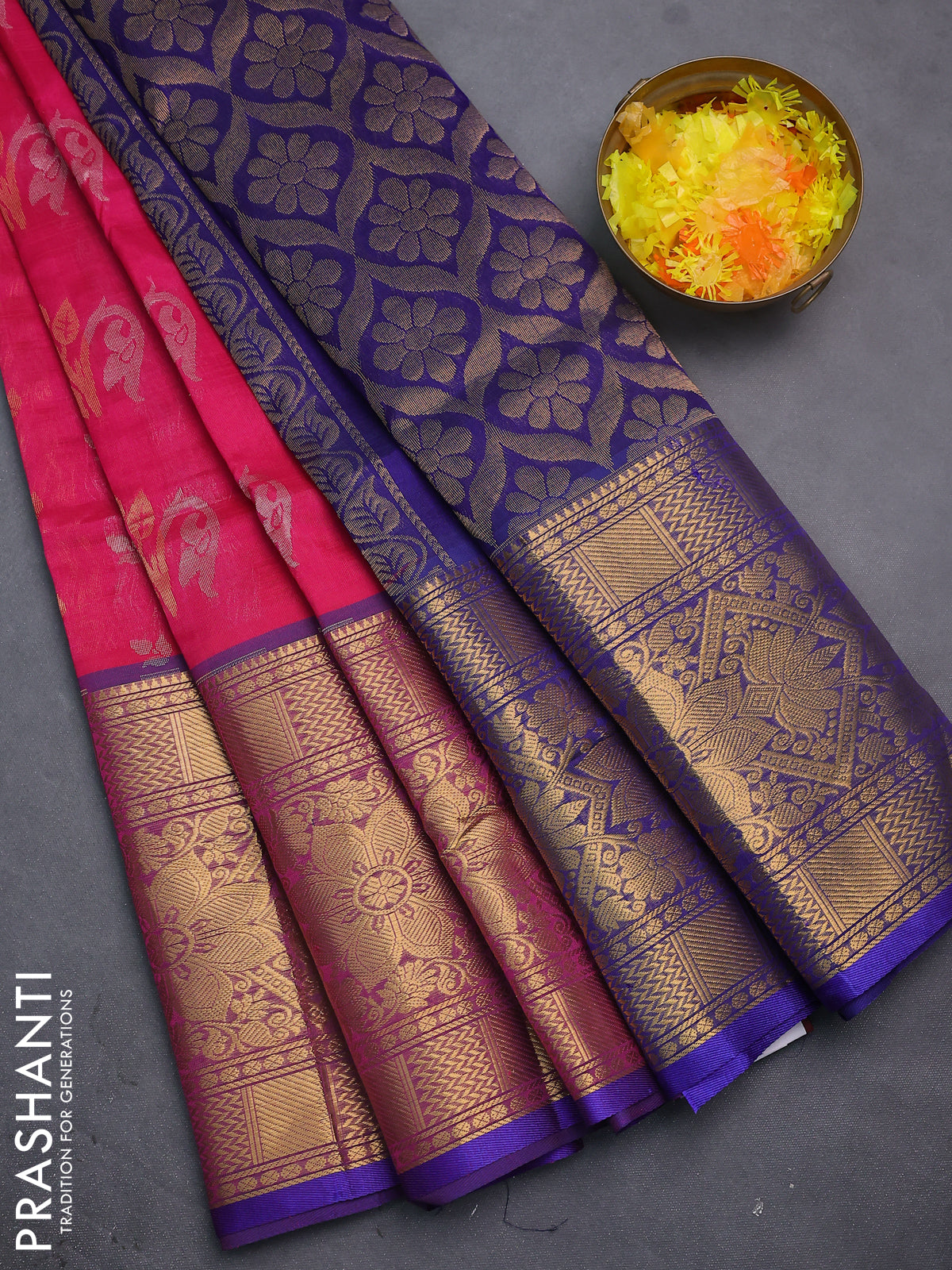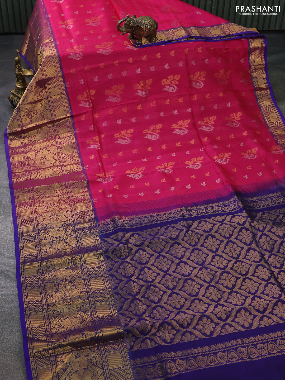 Silk cotton saree pink and dark blue with allover silver & gold zari woven buttas and long rich zari woven border