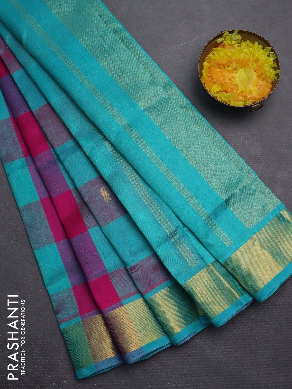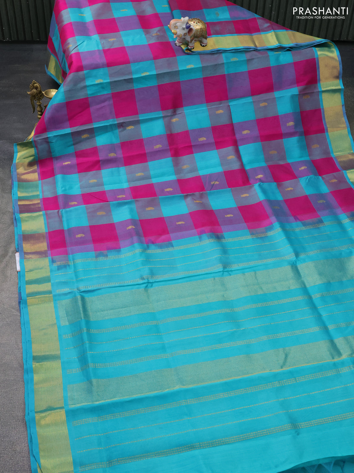 Silk cotton saree pink and teal blue with allover paalum pazhamum checks & buttas and zari woven border