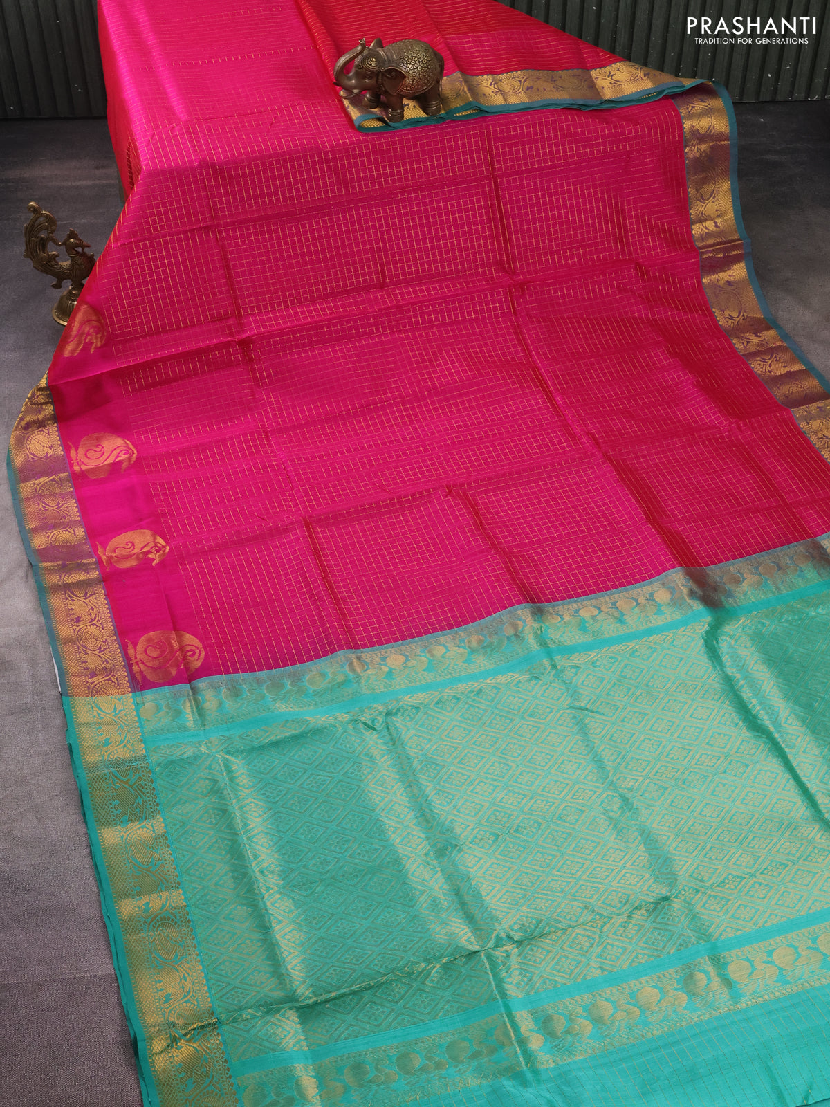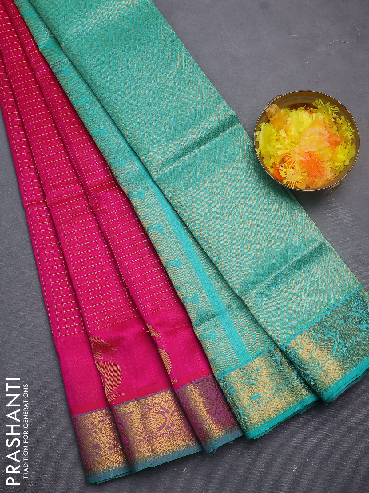 Silk cotton saree pink and teal green with allover zari checked pattern and rich zari woven border