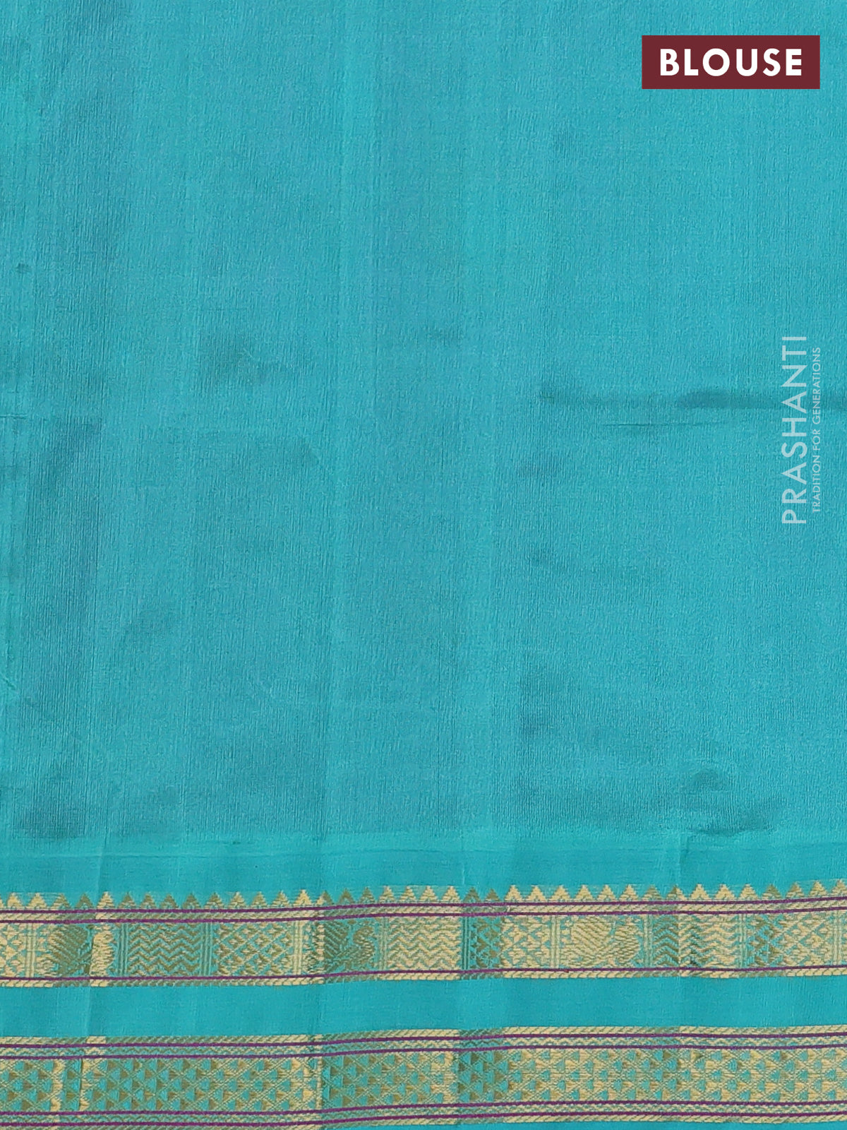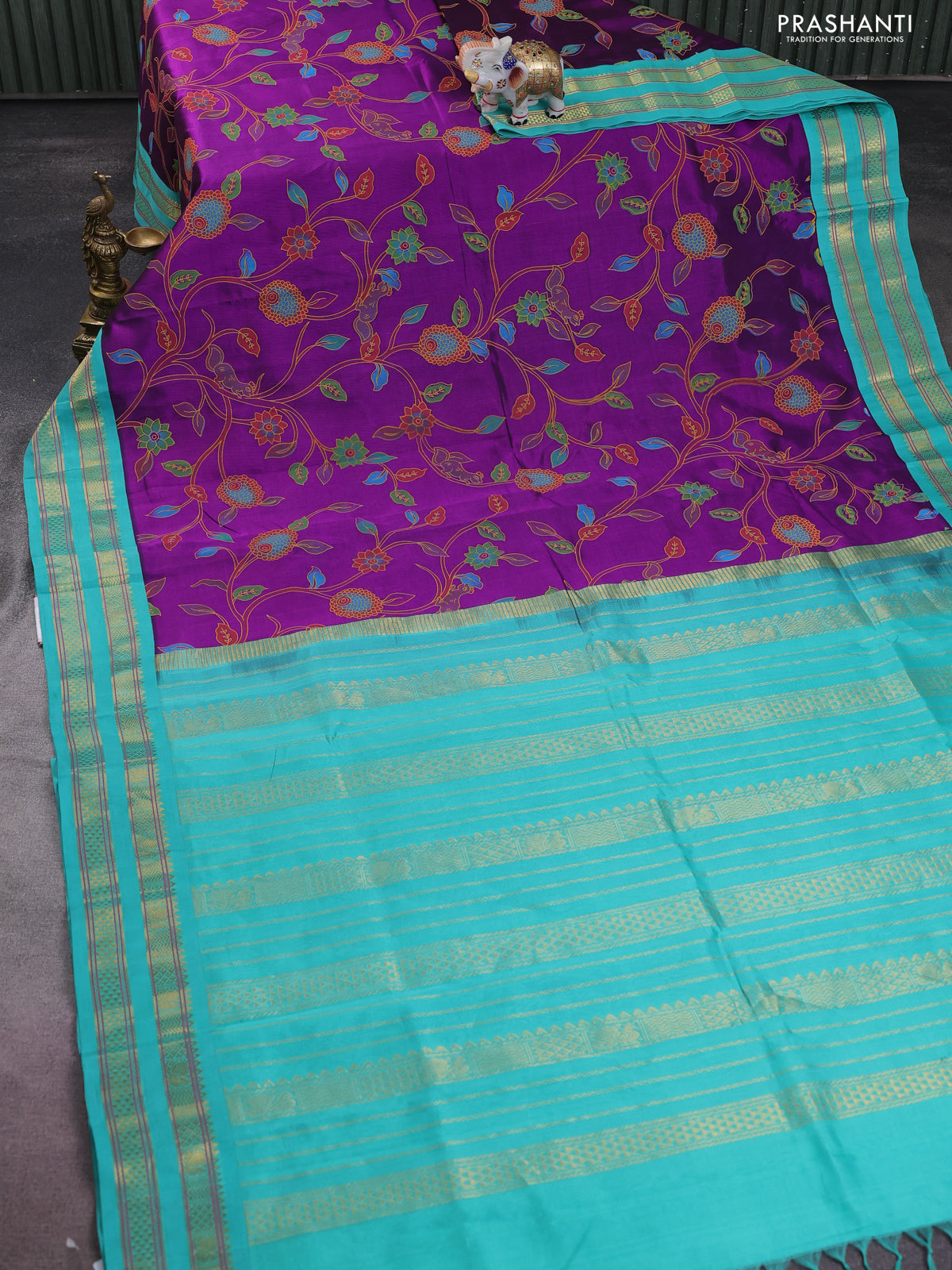 Silk cotton saree purple and teal green shade with allover kalamkari prints and rettapet zari woven korvai border