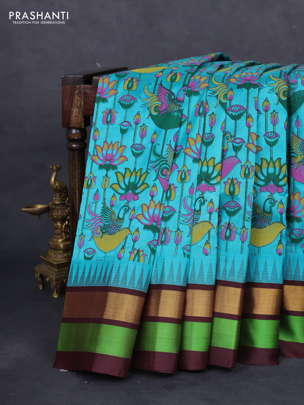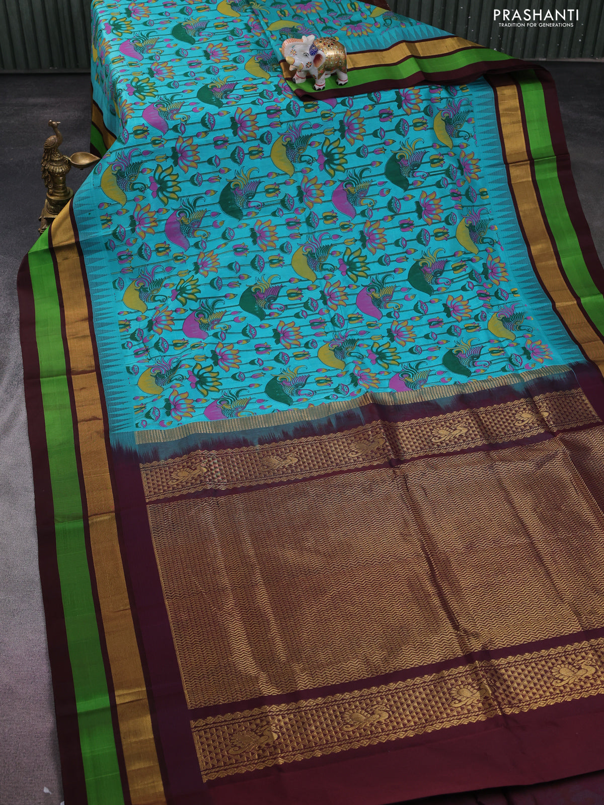 Silk cotton saree teal blue and coffee brown with allover kalamkari prints and temple design zari woven simple border