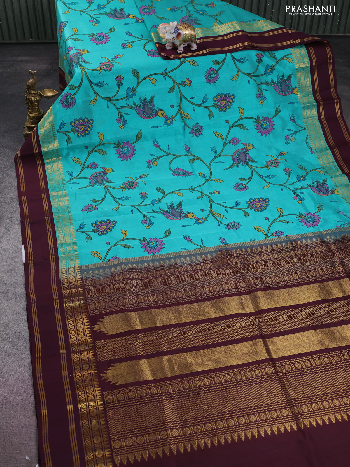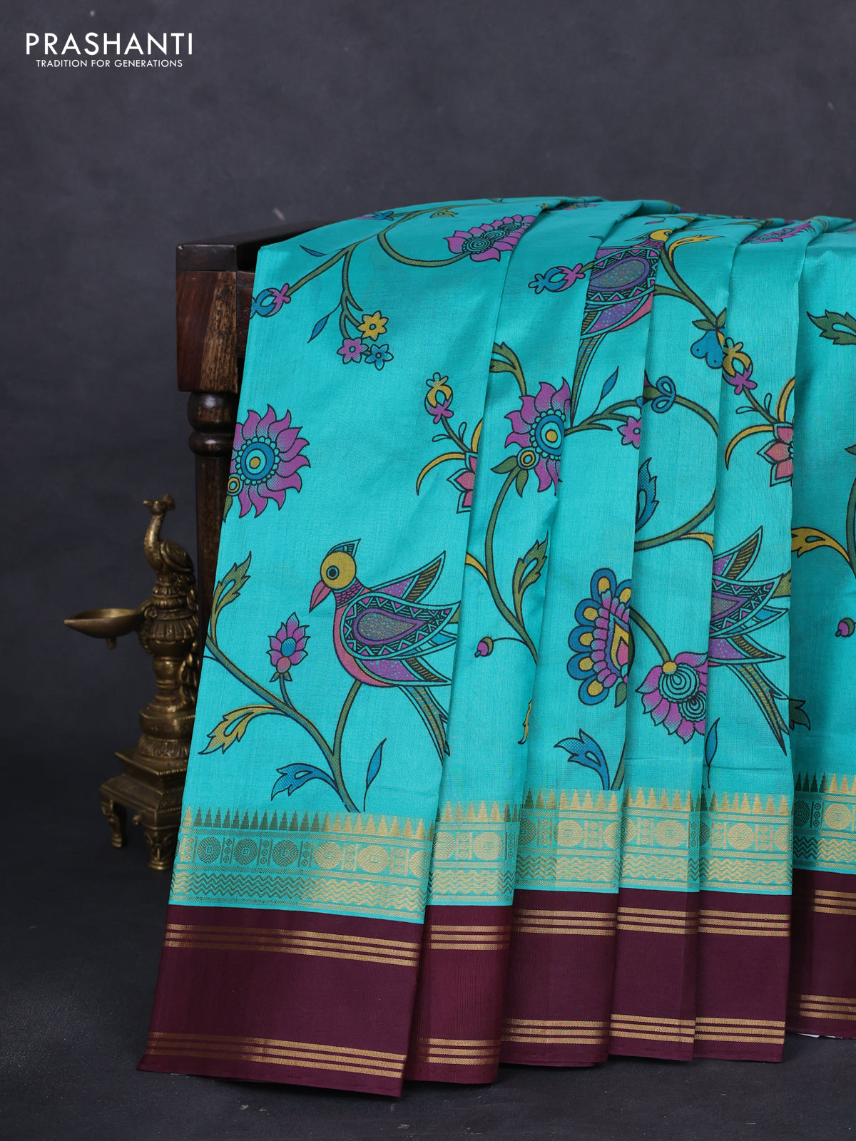 Silk cotton saree teal blue and deep maroon with allover kalamkari prints and rettapet zari woven korvai border