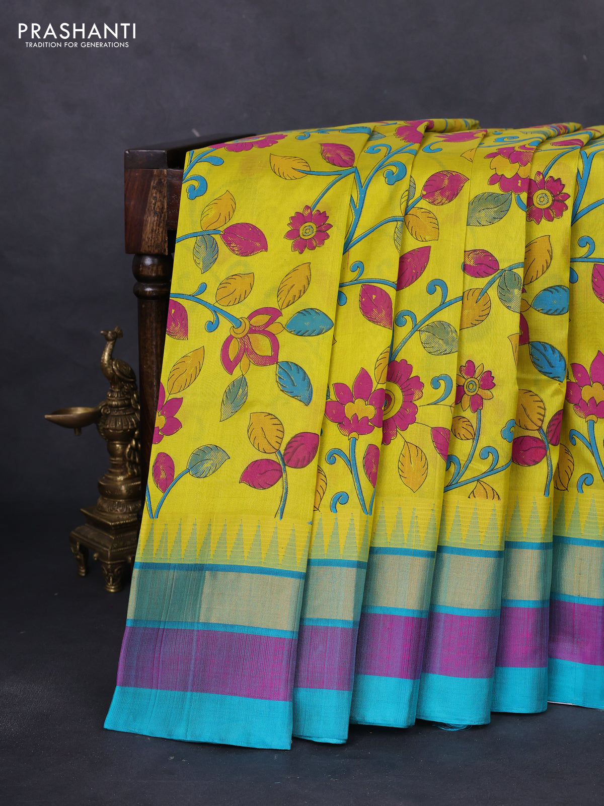 Silk cotton saree yellow and teal blue with allover kalamkari prints and temple design zari woven simple border