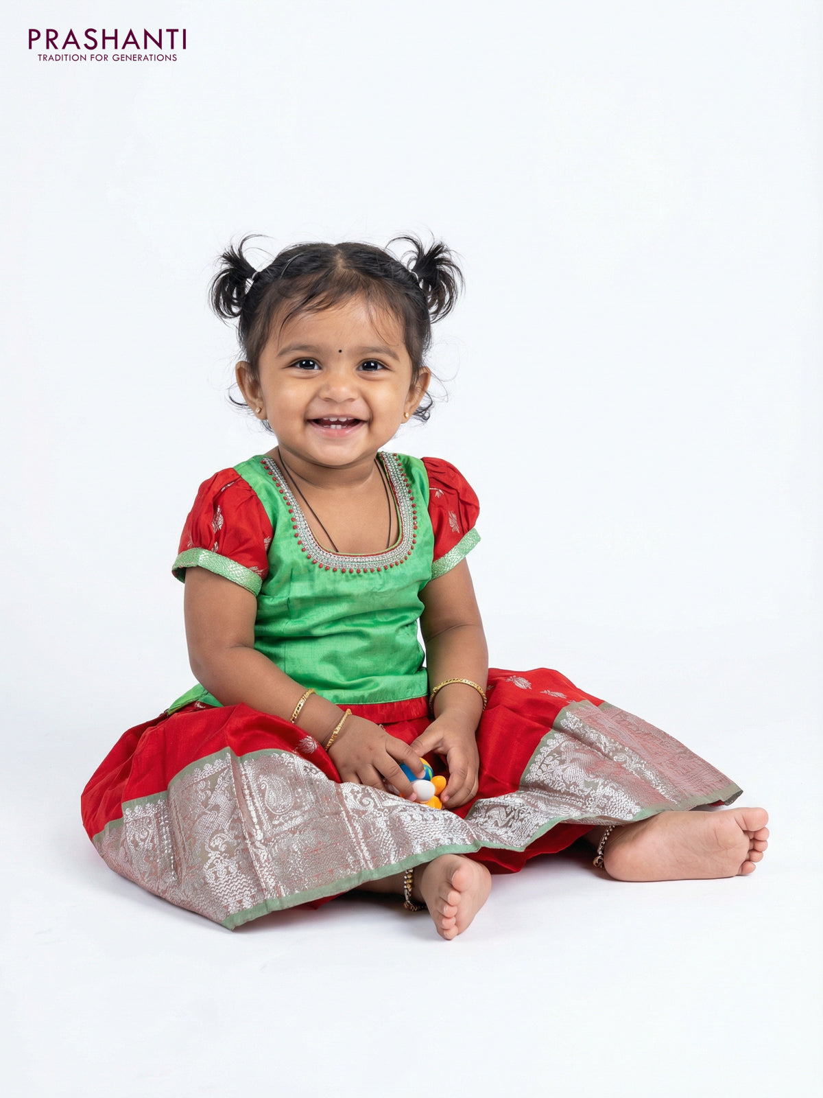Silk kids lehenga green and red with aari work neck pattern & puff sleeve and silver zari buttas & zari border for 0-1 year
